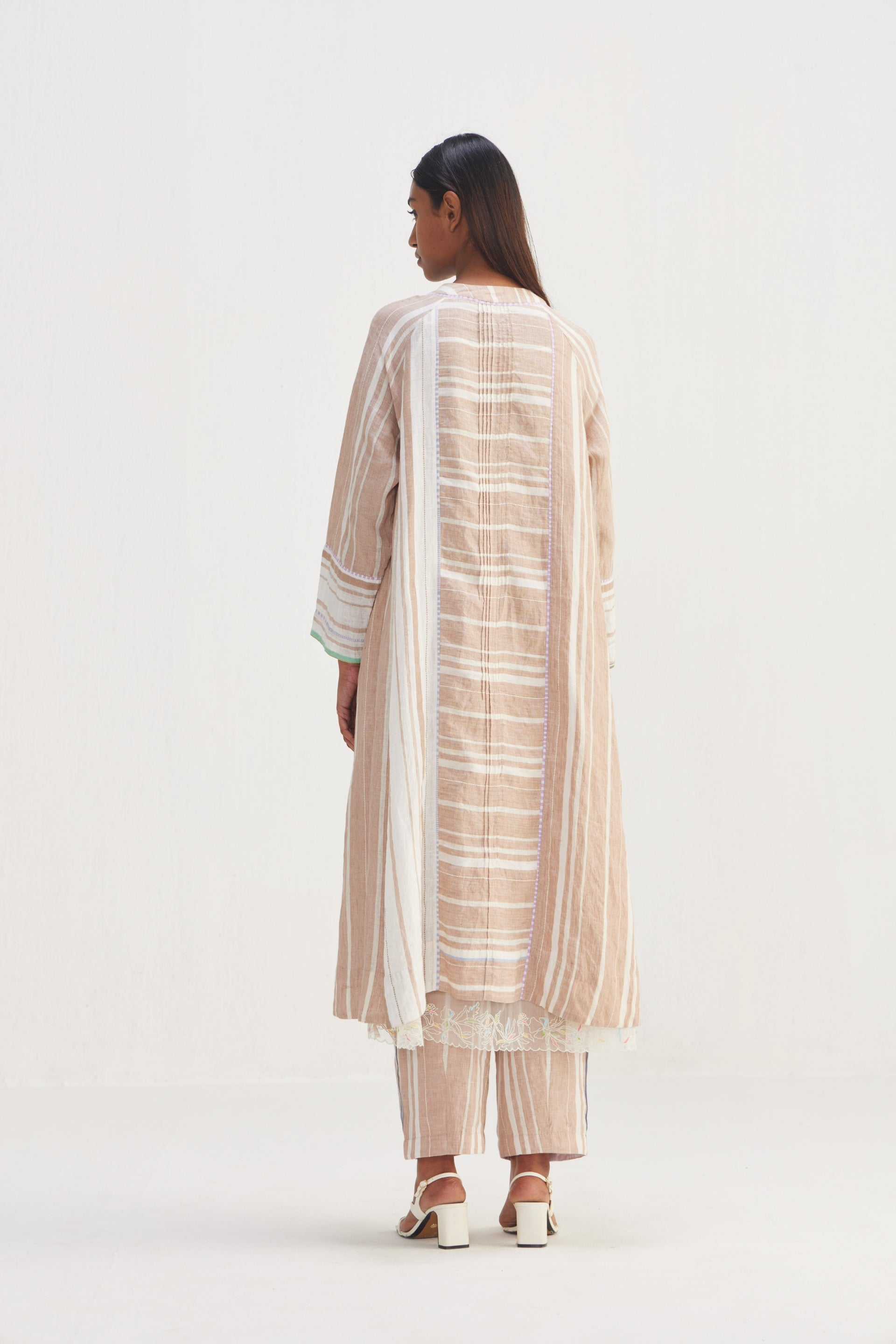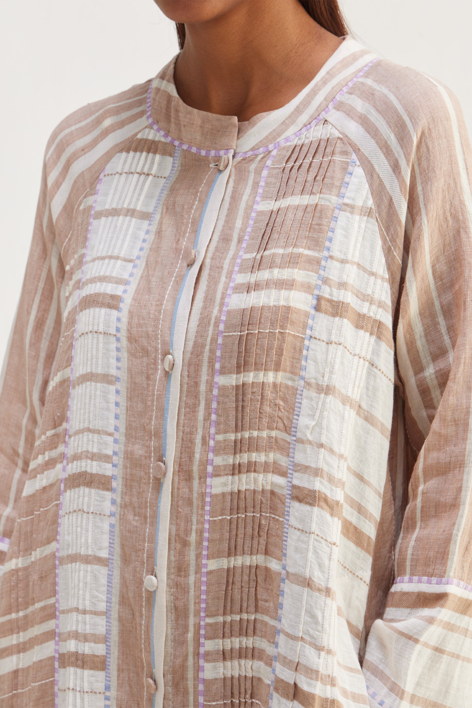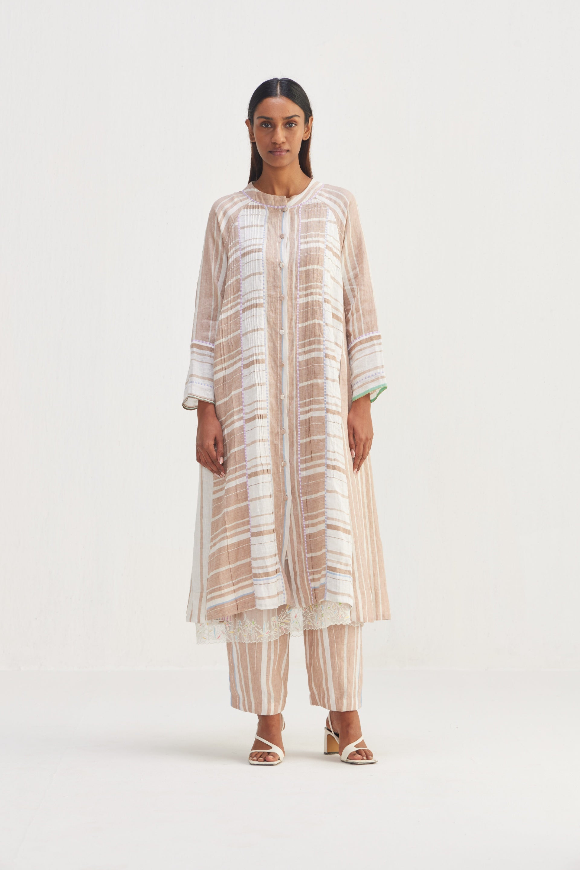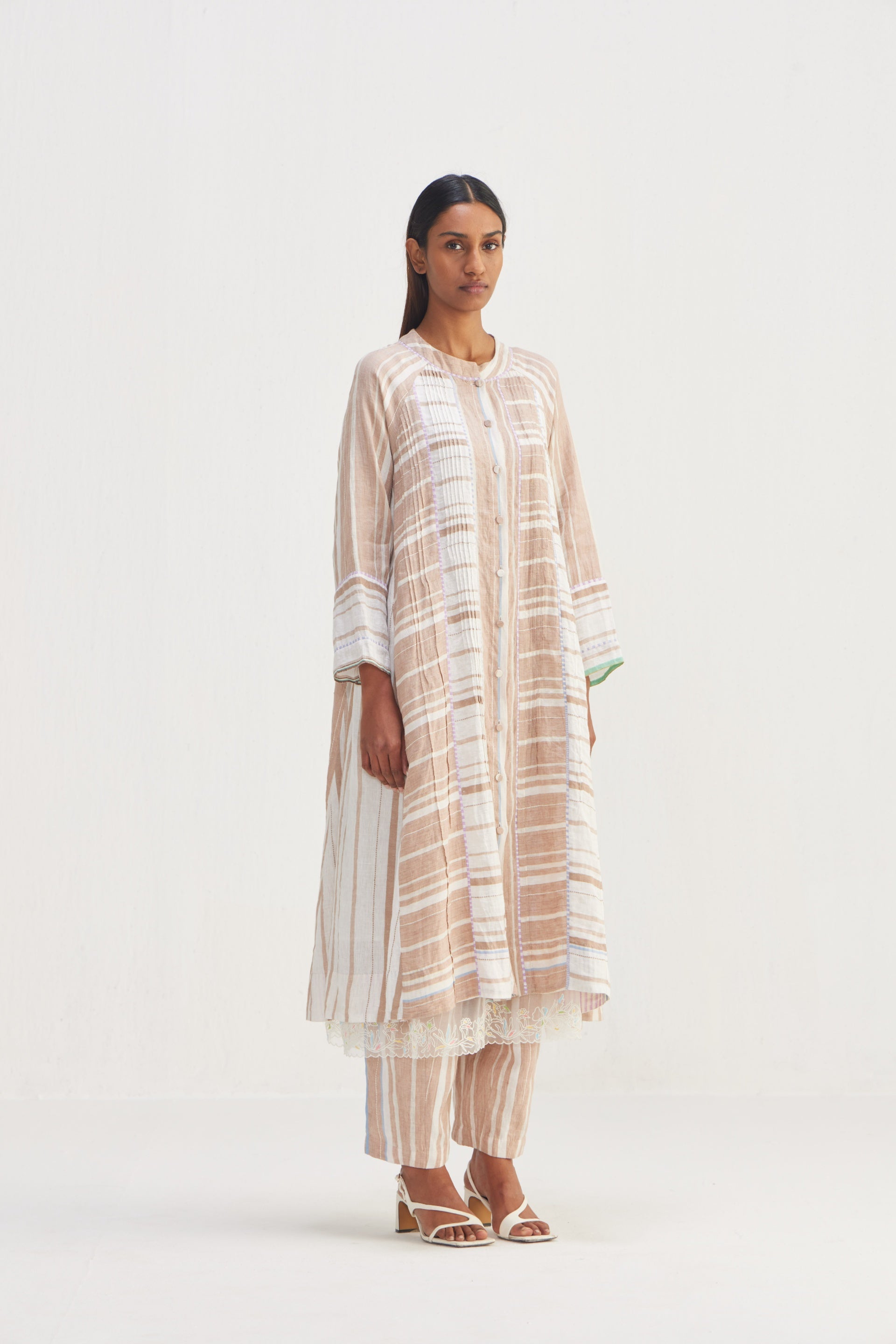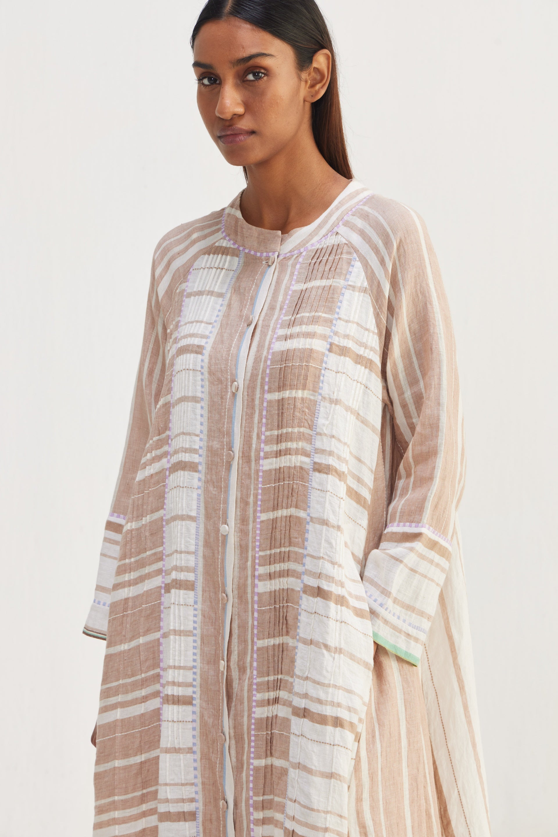The jacket features a multi-panel construction, offering a flattering fit that gracefully contours the body. Delicate tucks are placed all around the jacket, adding subtle volume and a touch of sophistication, button down, multi panel striper long jacket with contrast hand blocked piping detail, this enhances the structure of the jacket, highlighting the silhouette and drawing attention to the intricacies of the design.