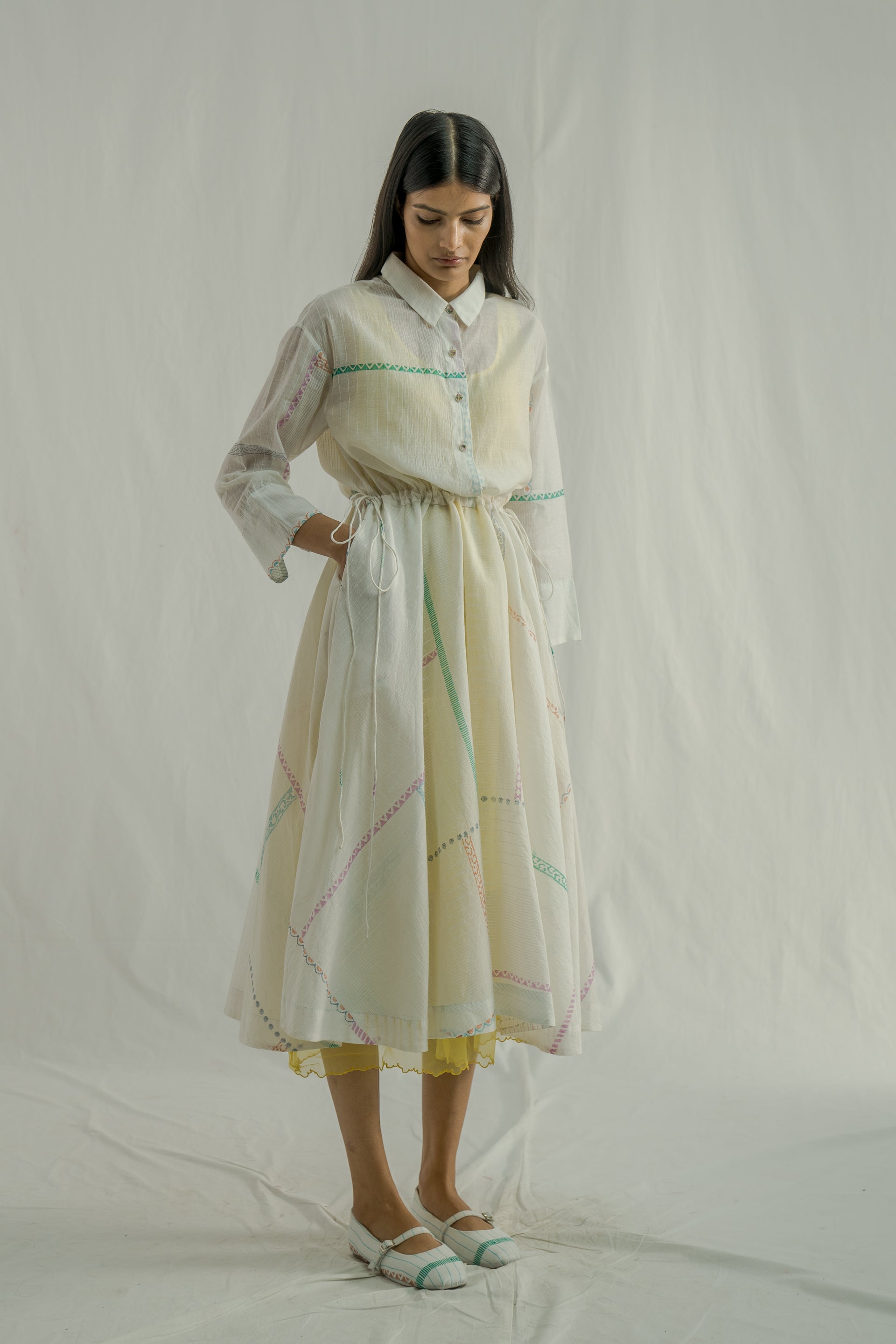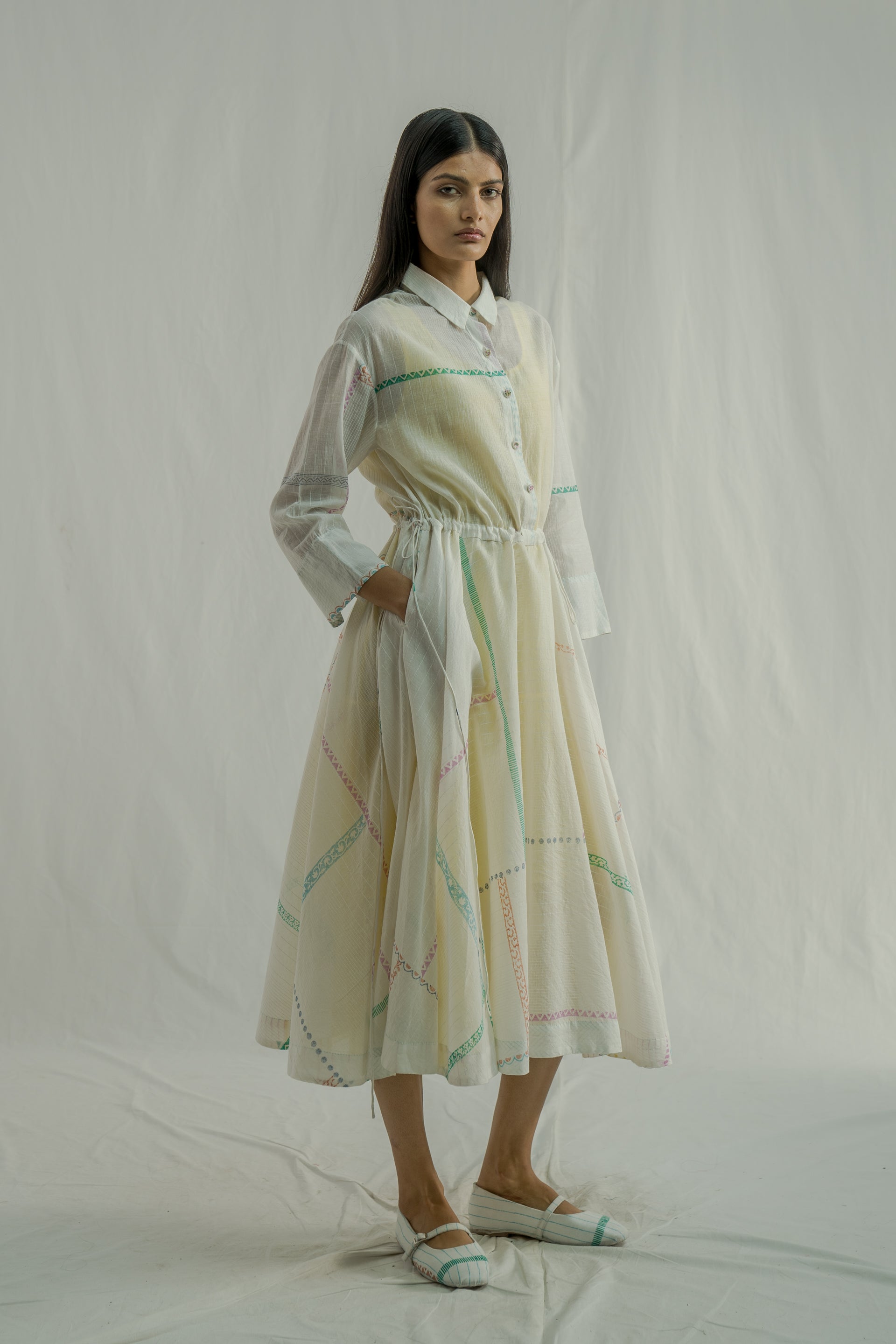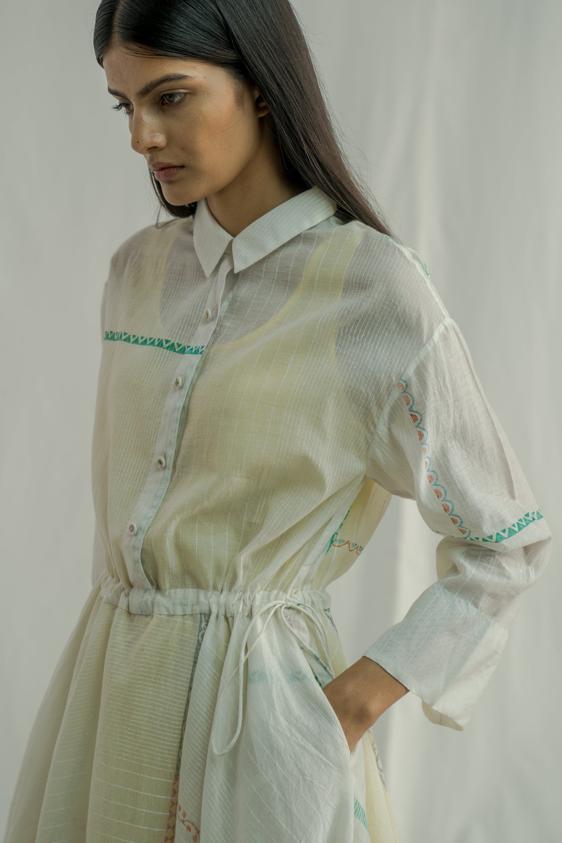 Front- placket dress featuring a classic collar and a waistline tie-up detail. Made from a cotton-silk blend, it showcases an all-over white-on-white striped pattern paired with a multi-grid hand-block print. The dress comes with a separate lining for added comfort.