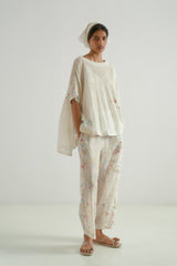 Round-neck gathered tiered top featuring puff sleeves with gathers and a tie-up detail, accented with multicolor hand-crocheted berry tassels and a scalloped edge hem. Crafted from a cotton-silk blend, this top features a back placket with embroidered buttons and multi-technique, multicolor floral embroidery on a tonal hand-block printed fabric.