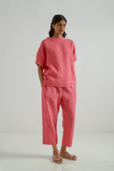 This relaxed-fit , front-open button-down collar midi dress cum jacket is designed with gathered details at the waist featuring a yoke patch and contrast selvedge stitching along the seams, while the buttons are adorned with delicate handwork. A unique text print hand embroidery embellishes the side, adding a touch of artisanal charm. Crafted from 100% linen fabric.