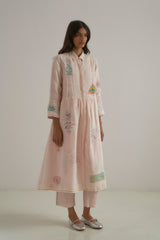 Front-open, button-down dress featuring a classic collar, a yoke patch, and contrast selvedge detailing along the seams. Crafted from 100% linen, it combines fine checks with a vibrant multicolor placement hand-block print.