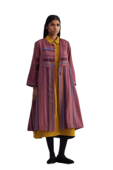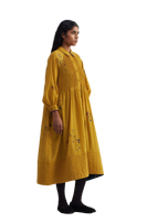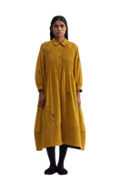 Relaxed fit front open button down collar midi dress with full puff raglan sleeves, pin tucks allover the bodice and quilting detail on hem. Constructed in solid 100% merino wool with placement handblock print. Finished with contrast handblock print 100% silk fabric piping and facing detail.