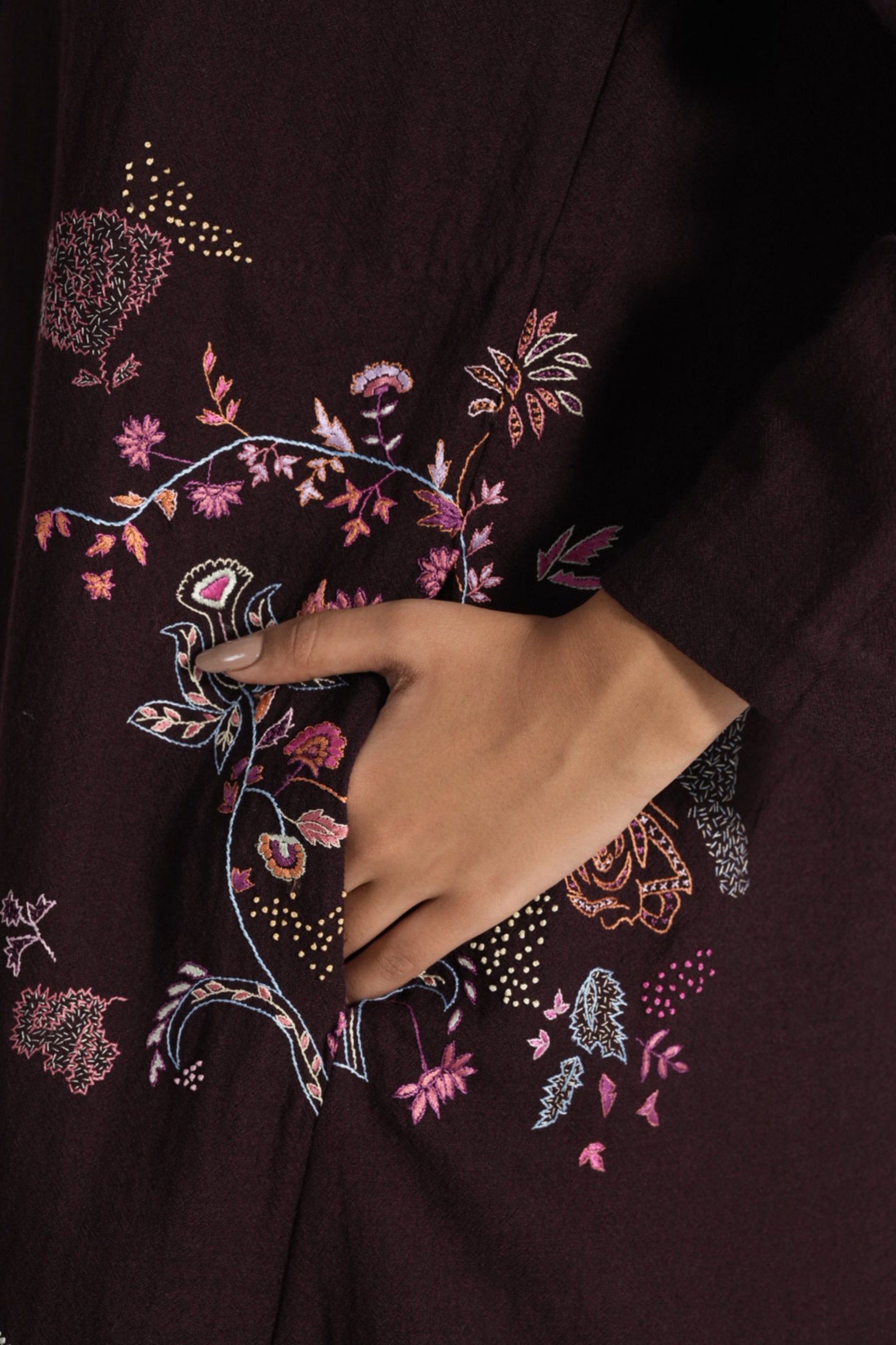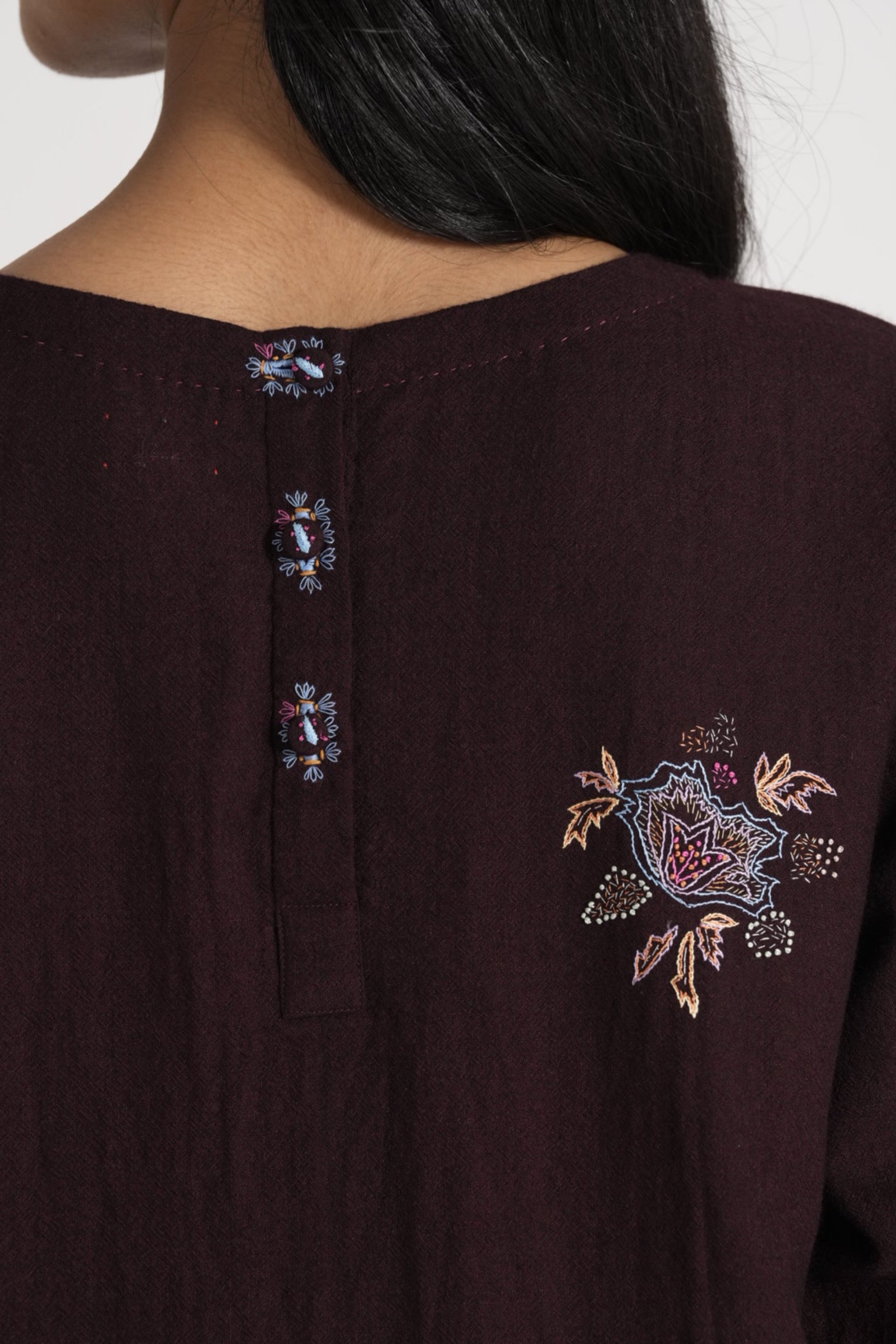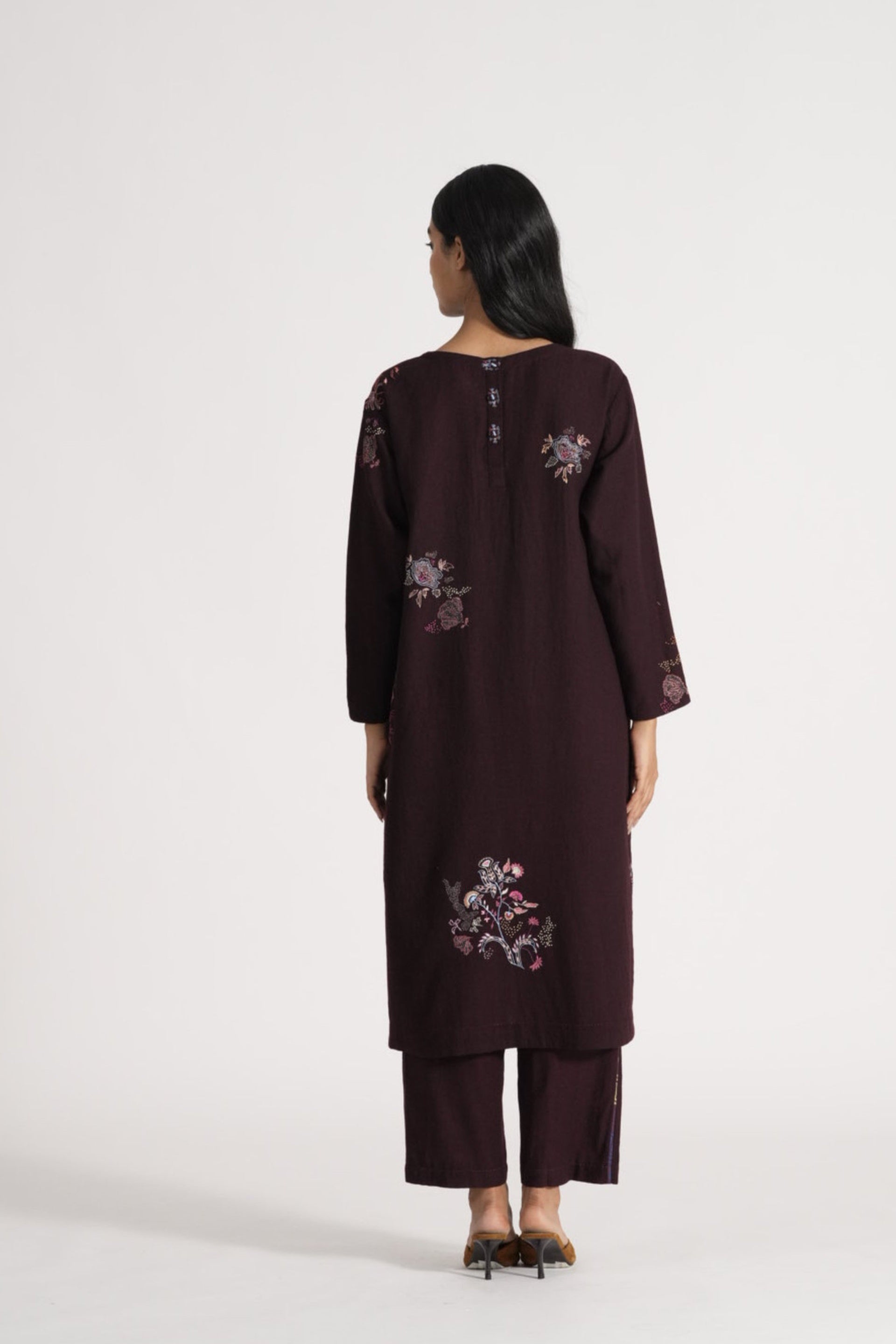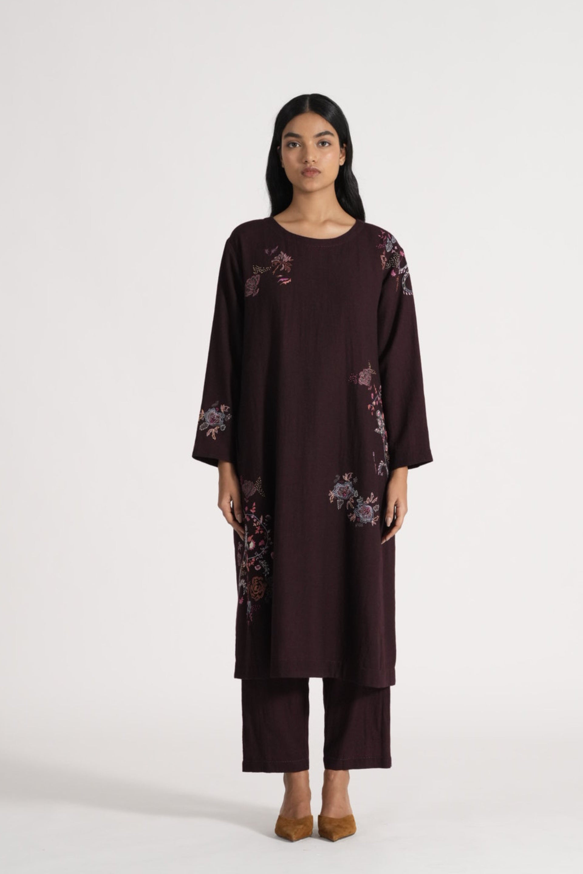 Round neck kurta dress in 100% merino wool with intricate sozni hand embroidery.
