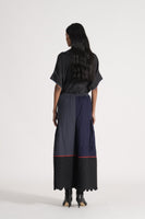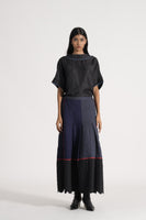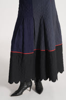 High waist maxi length skirt with inverted box pleat in patchwork wool silk linen and silk. Quilted 100% silk on hem. Lined with 100% silk lining.