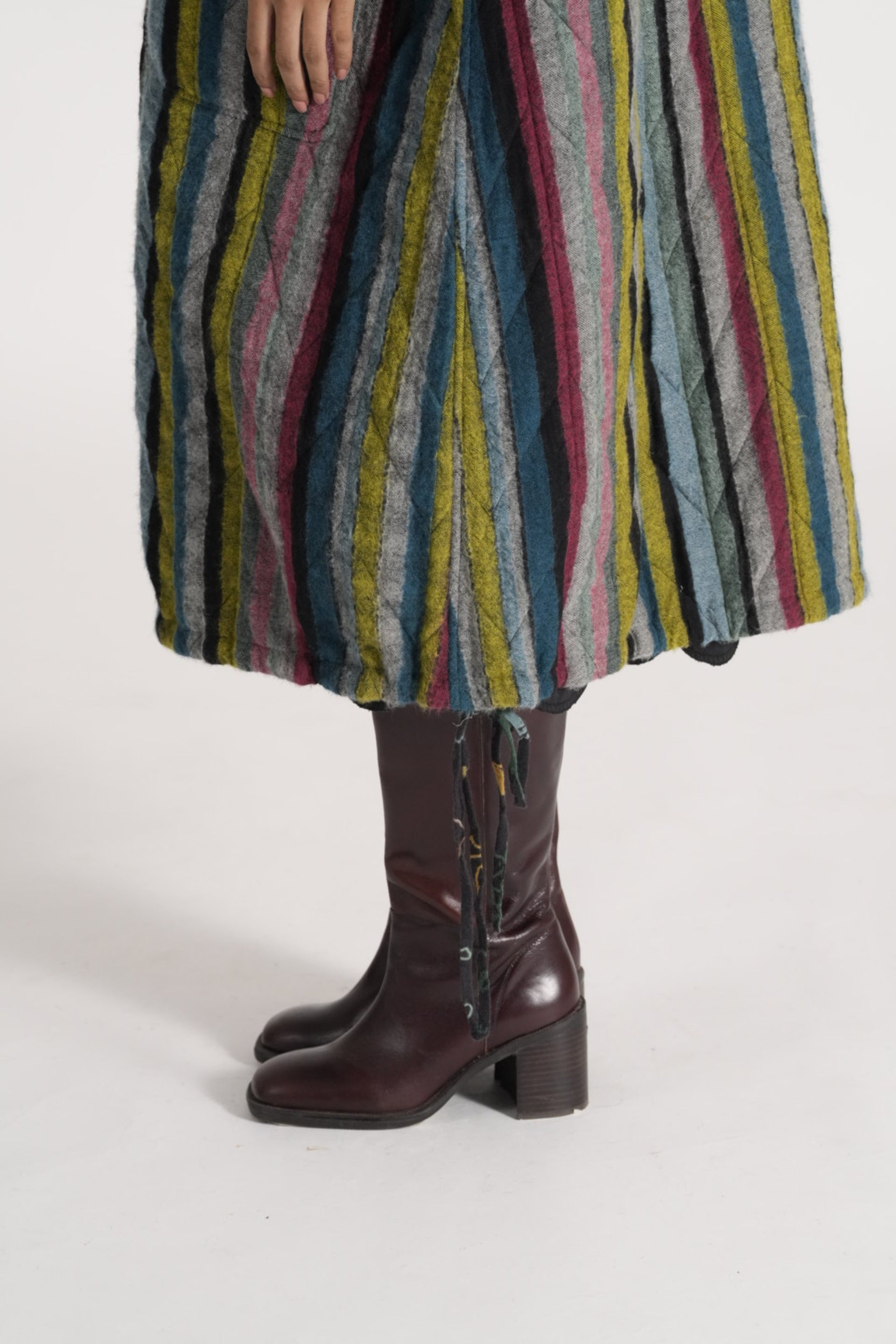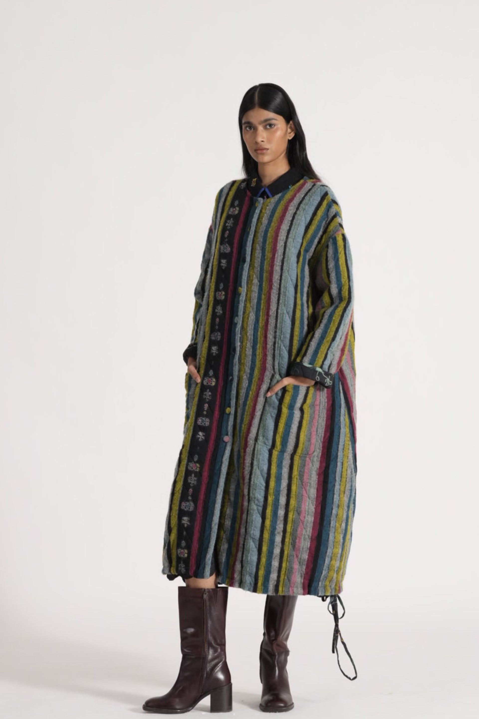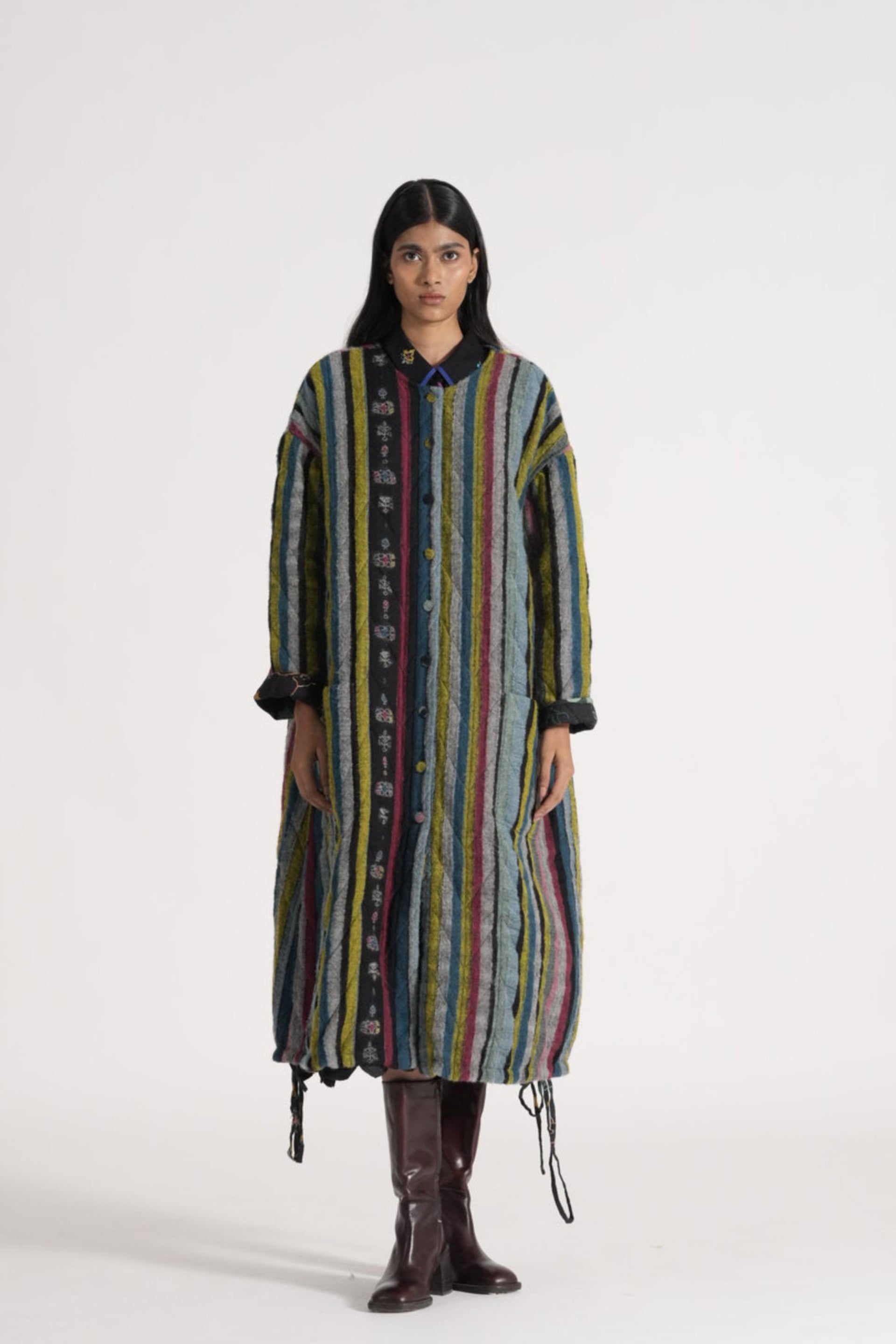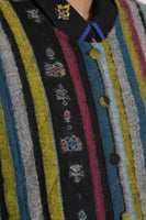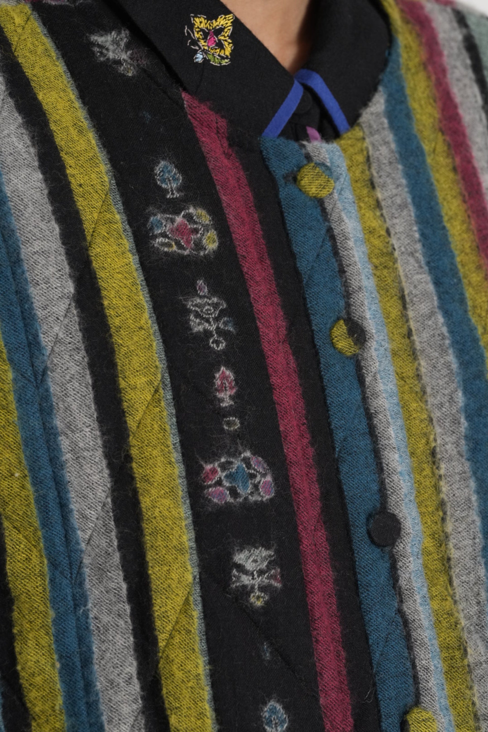 Reversible round neck button down jacket in multicolor jacquard stripe and multicolor all over floral print in 100% merino wool.
