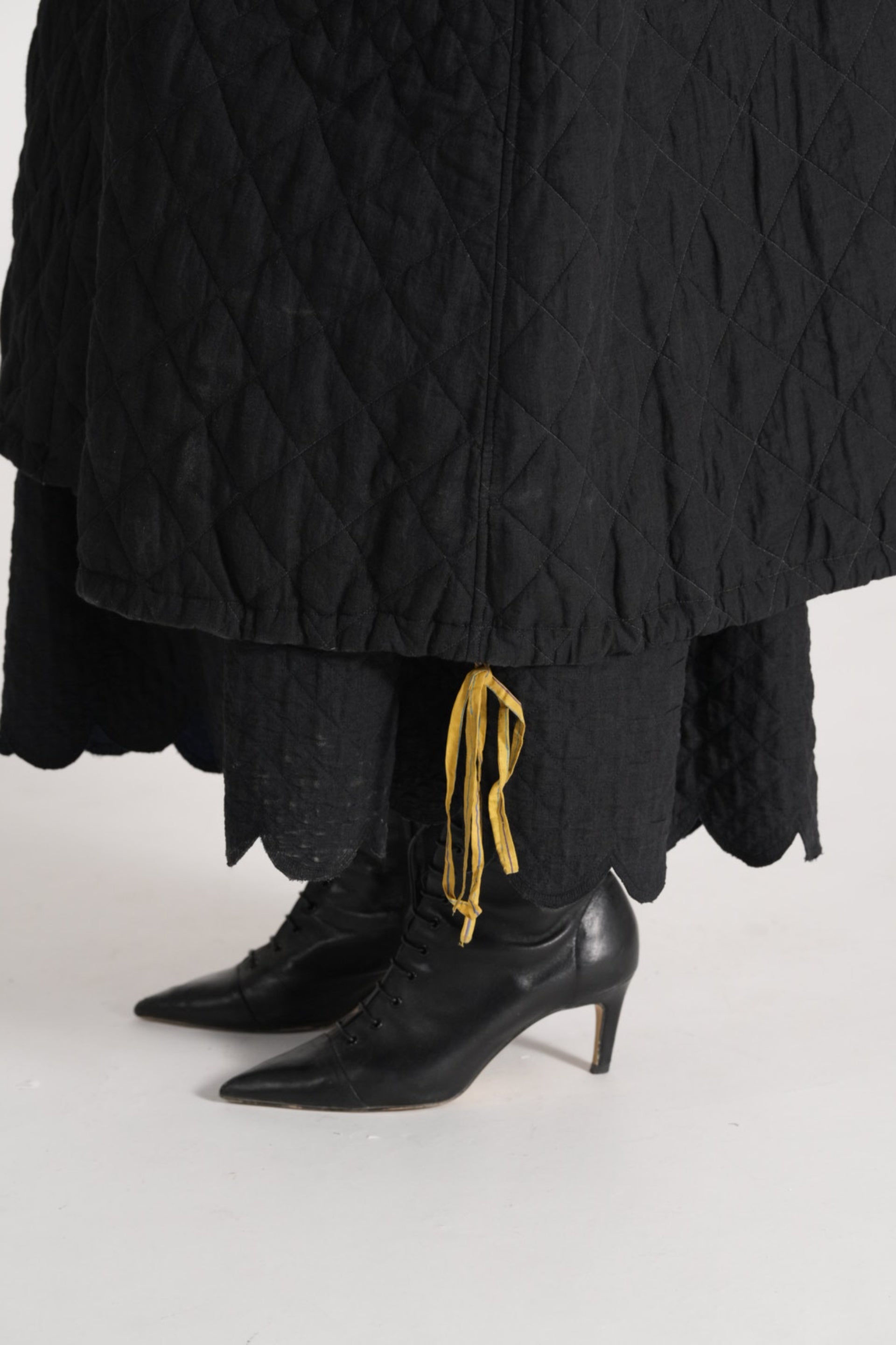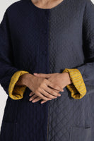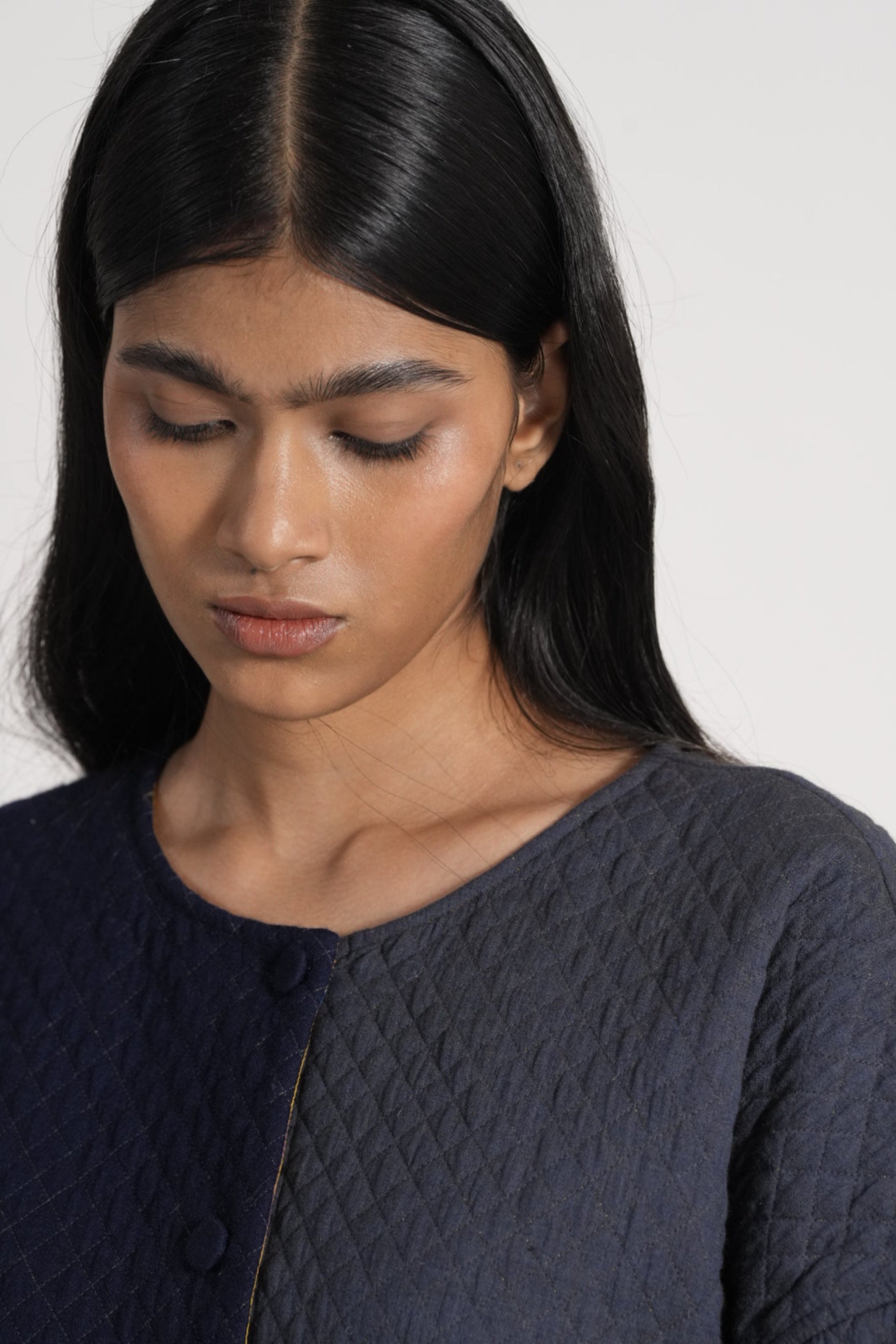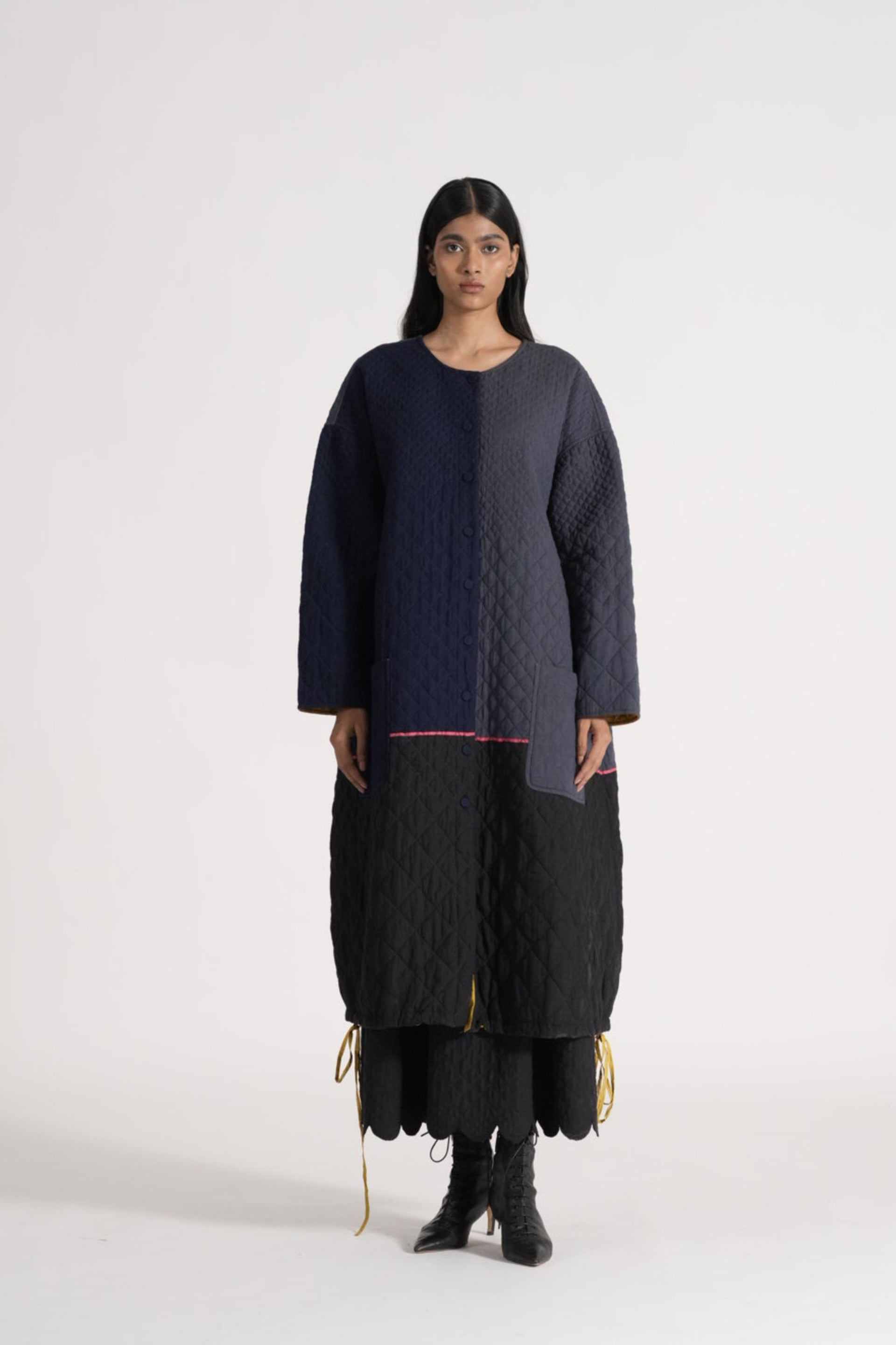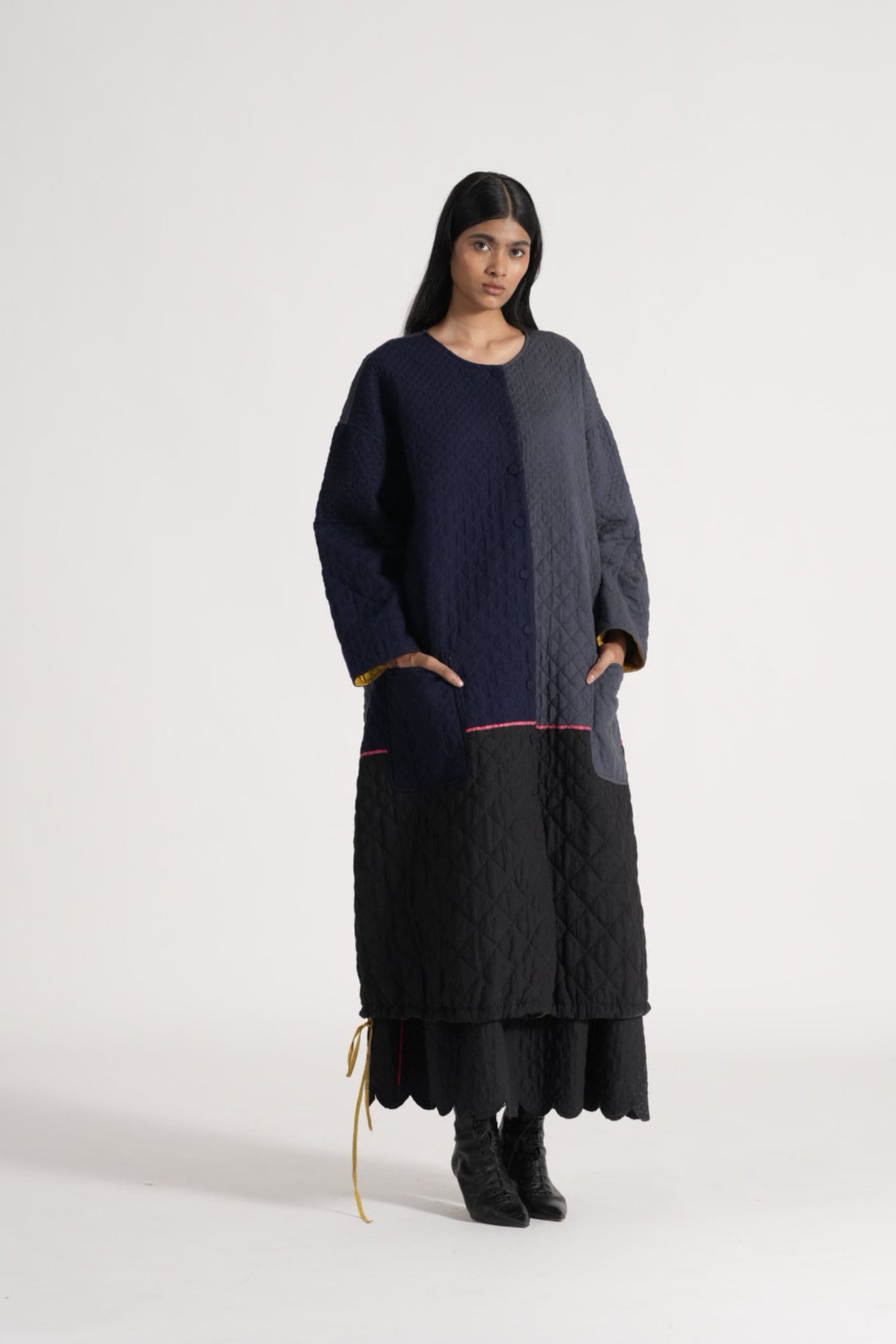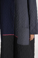 Round neck button down jacket with drawstring detail on hem in all over quilted patchwork 100% merino wool and wool silk linen blend.
