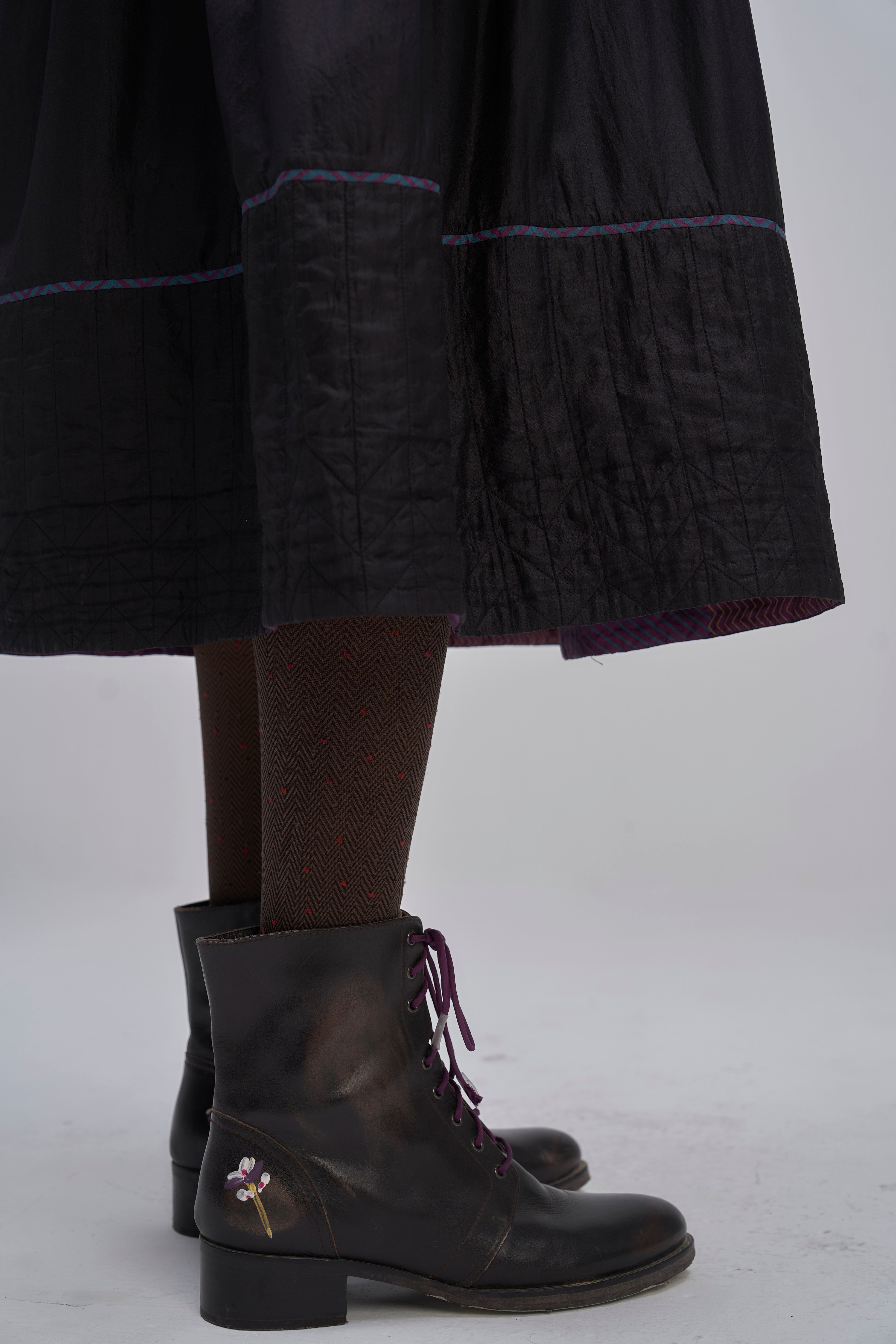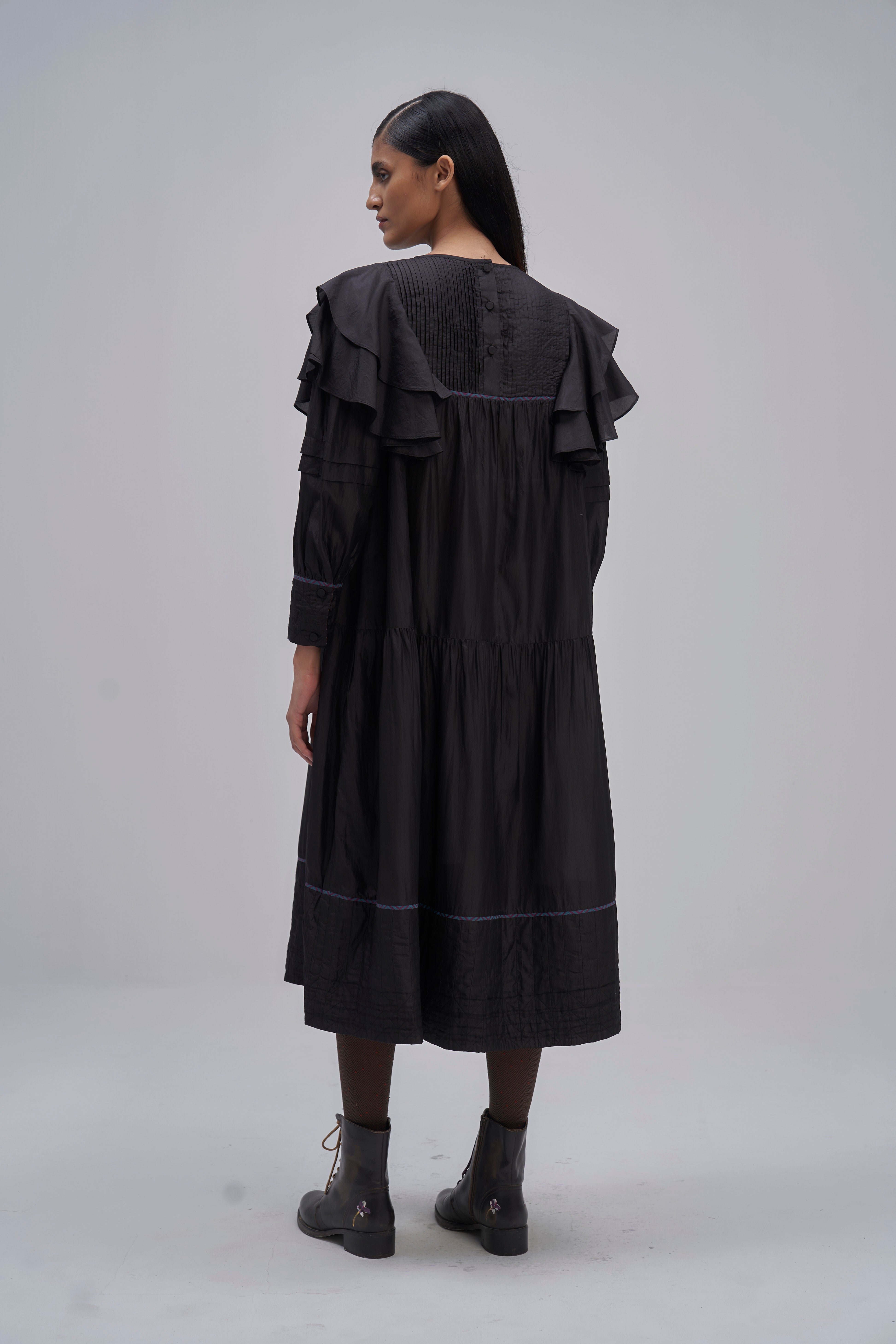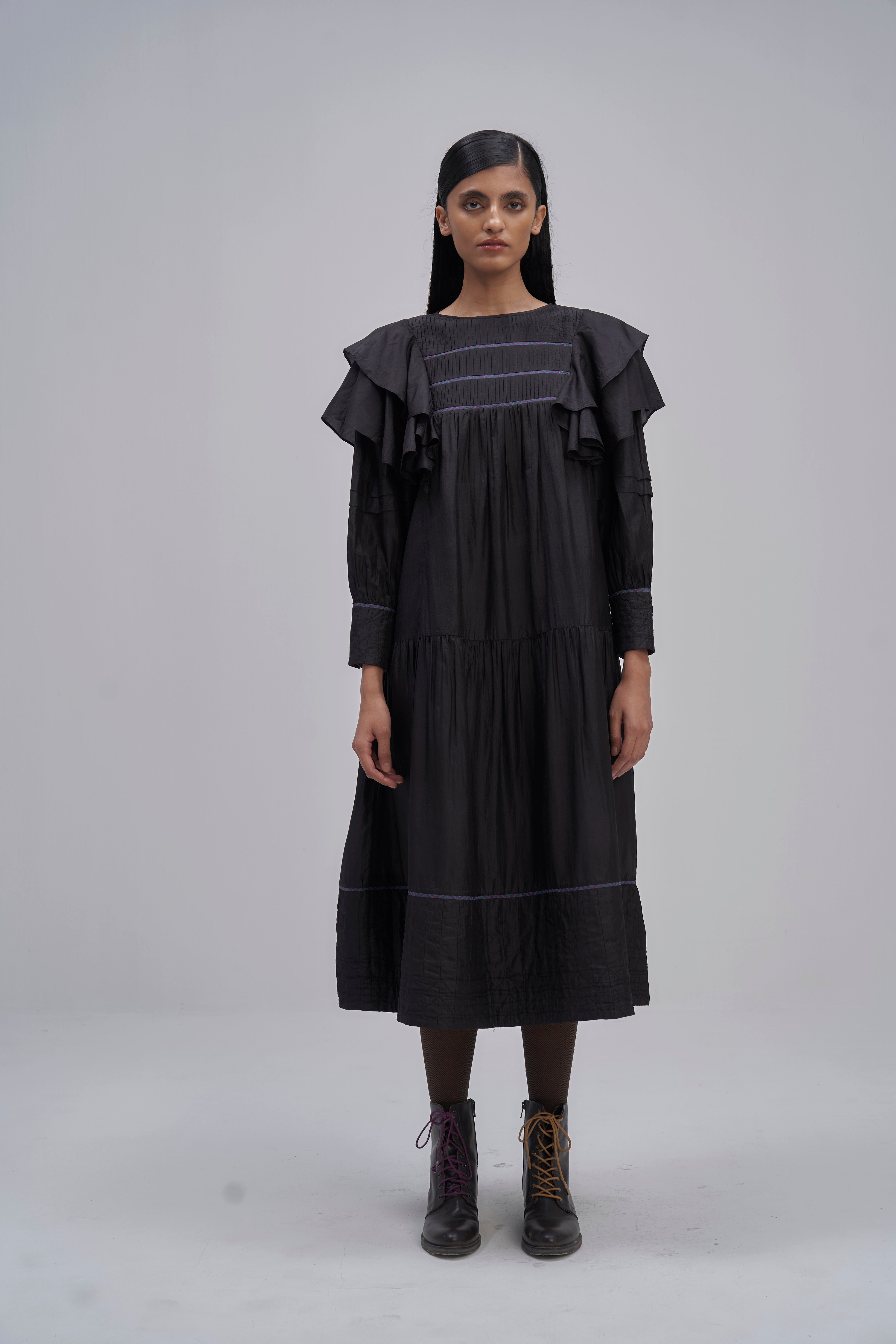 Round neckline gathered tier detail midi dress with 3/4 puff sleeves, ruffle detail on armhole and quilting detail on hem. Constructed in solid 100% silk fabric. Finished with contrast handblock print 100% silk fabric piping detail across the seams of the dress and contrast collage handblock print 100% silk fabric facing detail.