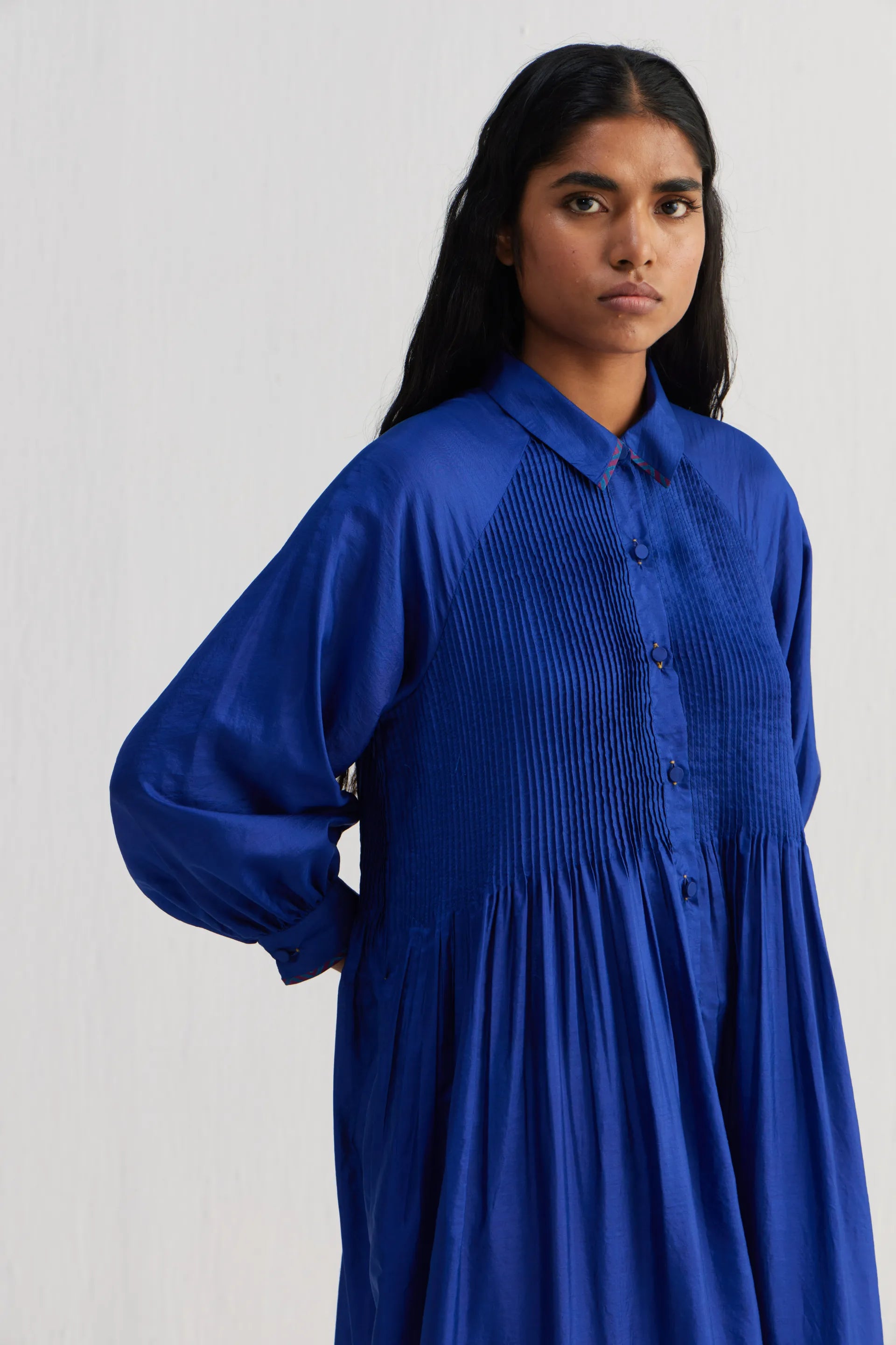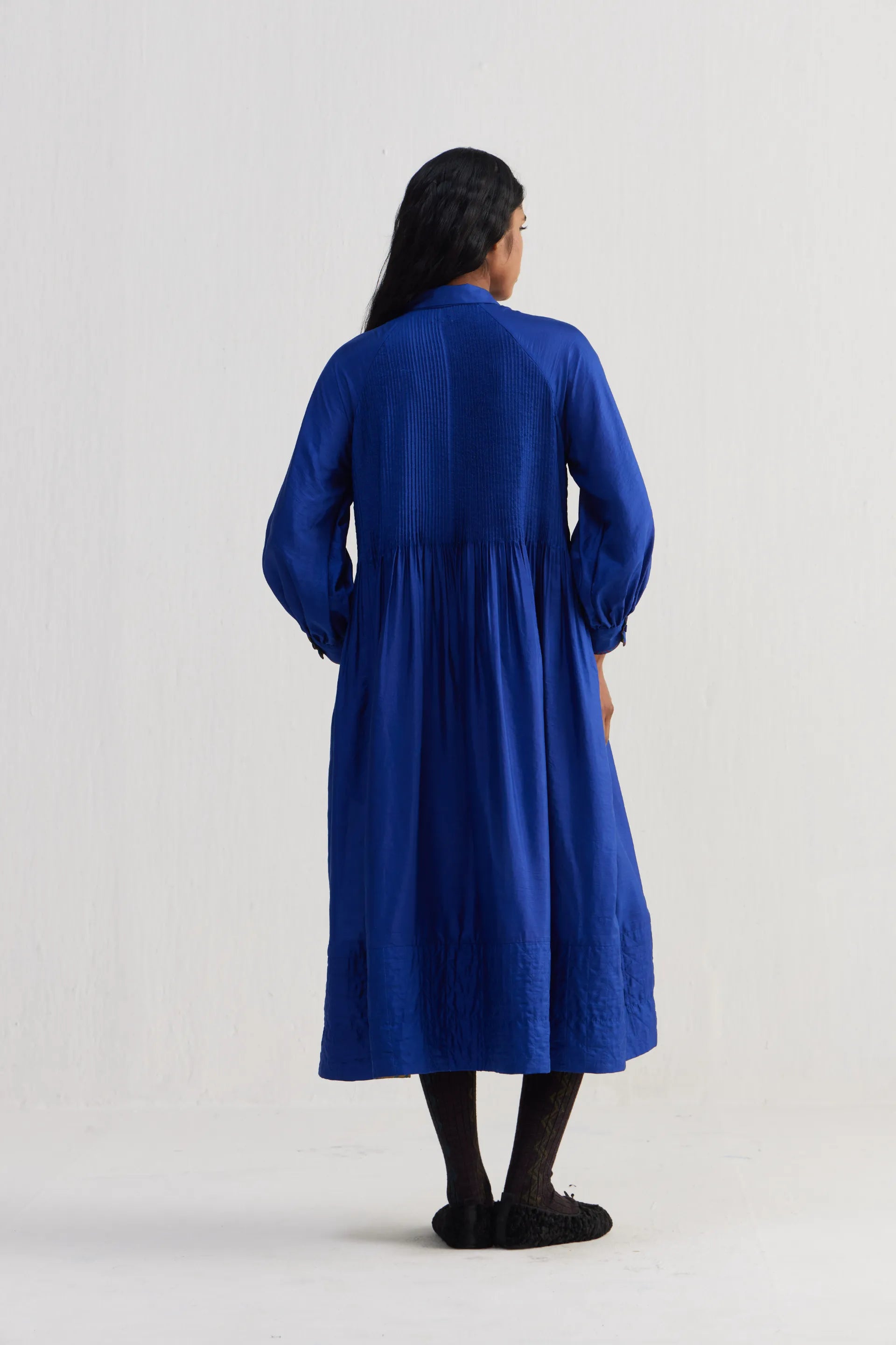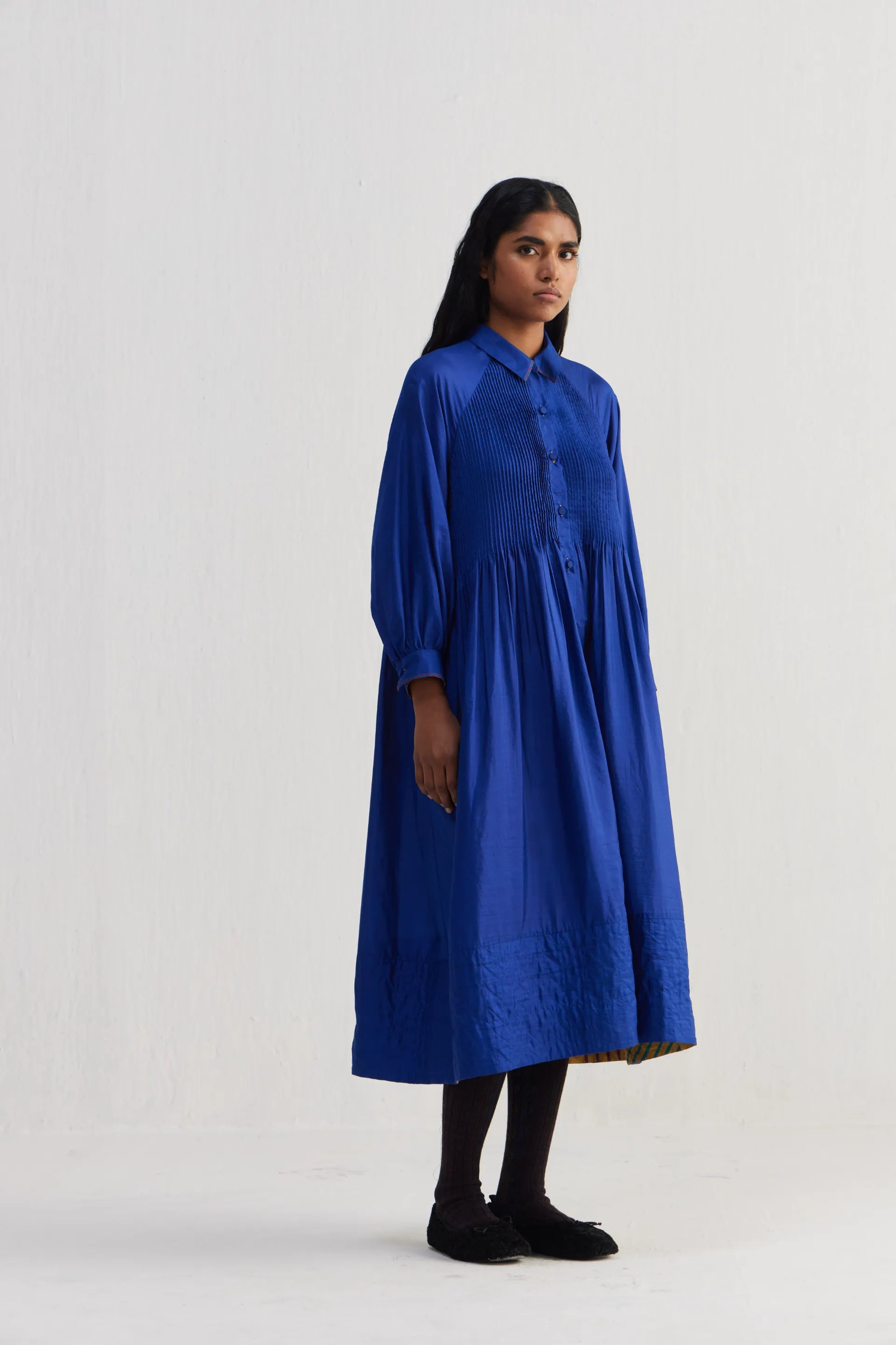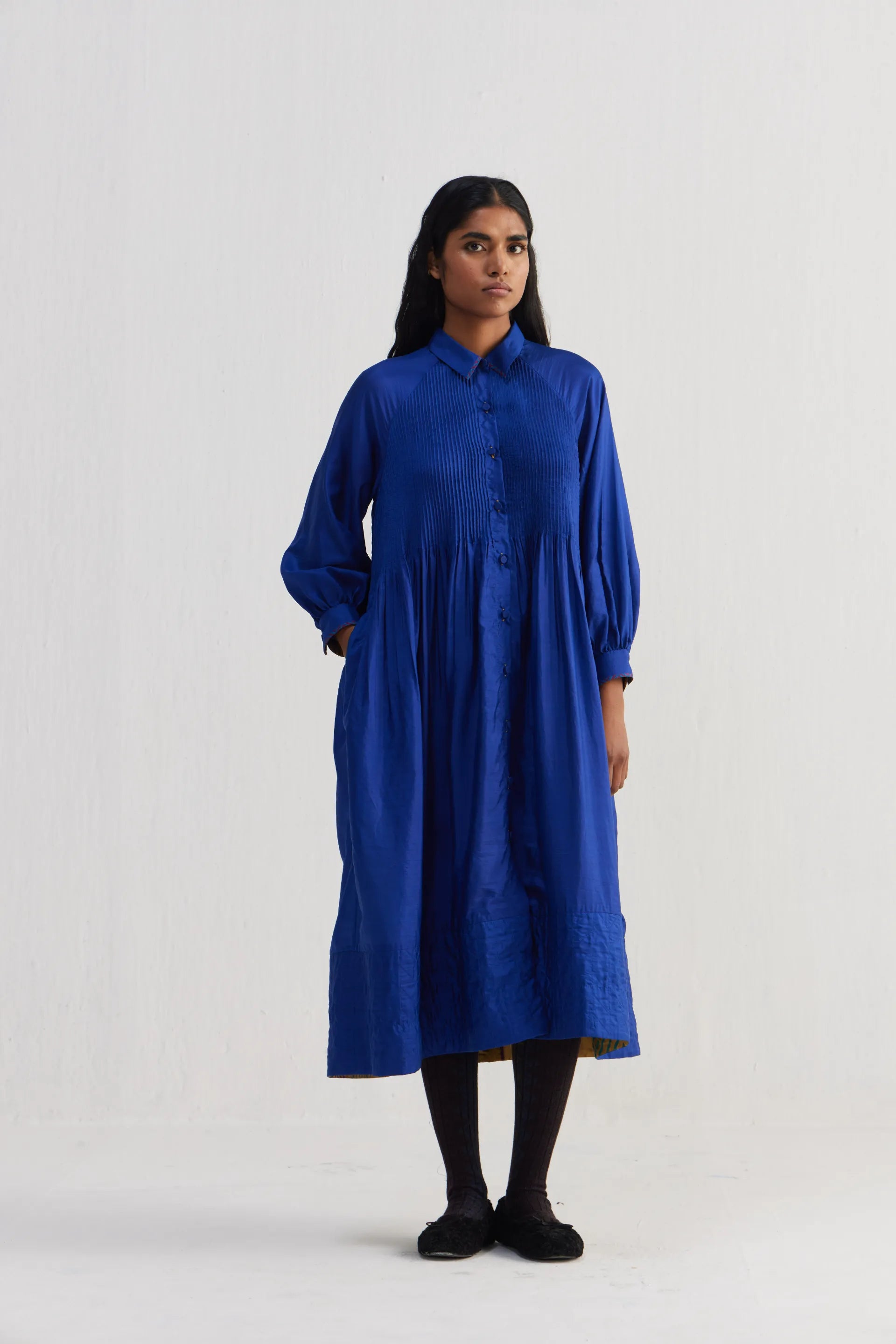 Relaxed fit front open button down collar midi dress with full puff sleeves, pintucks allover the bodice and quilting detail on hem. Constructed in solid 100% silk fabric. Finished with contrast handblock print 100% silk fabric piping and facing detail.