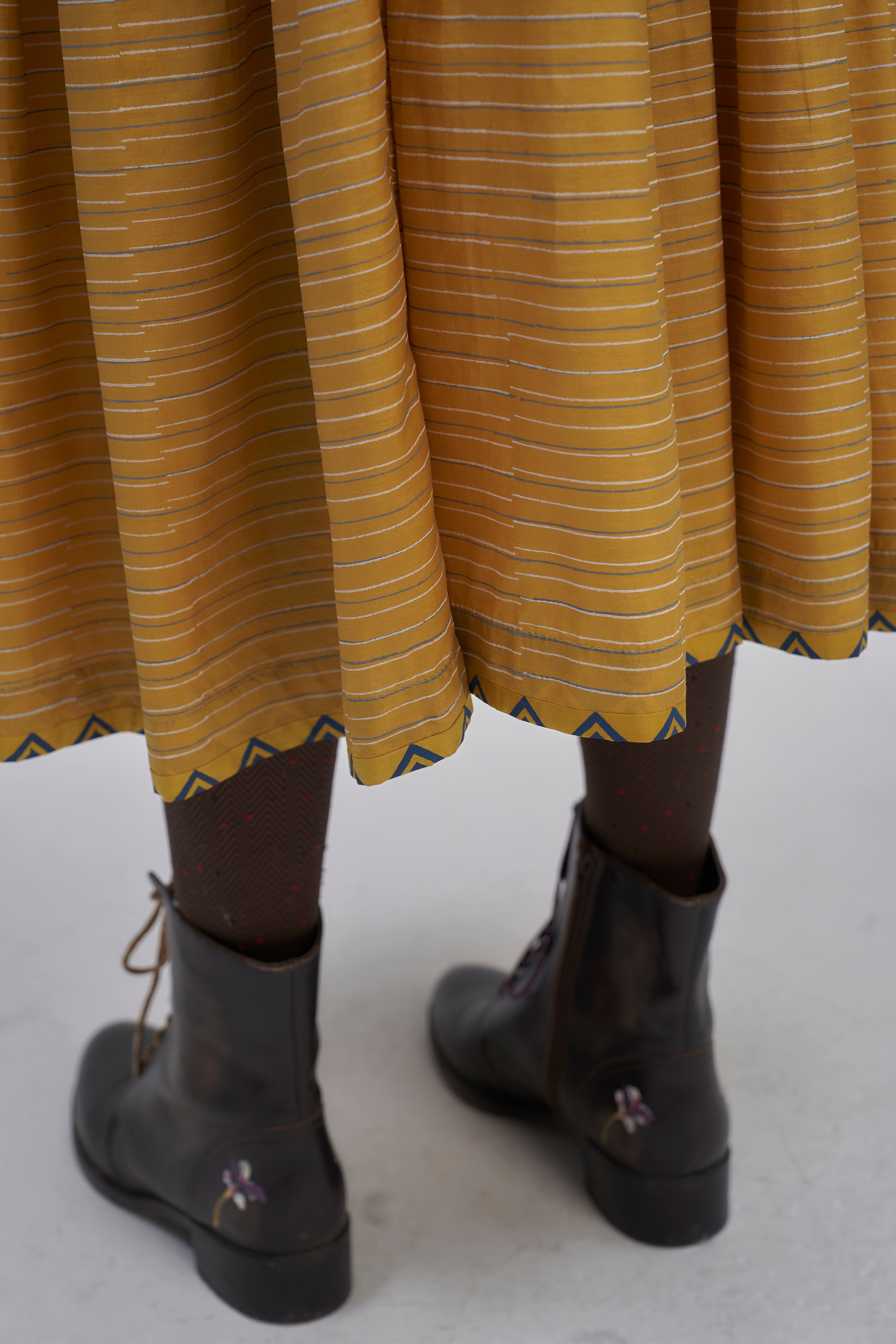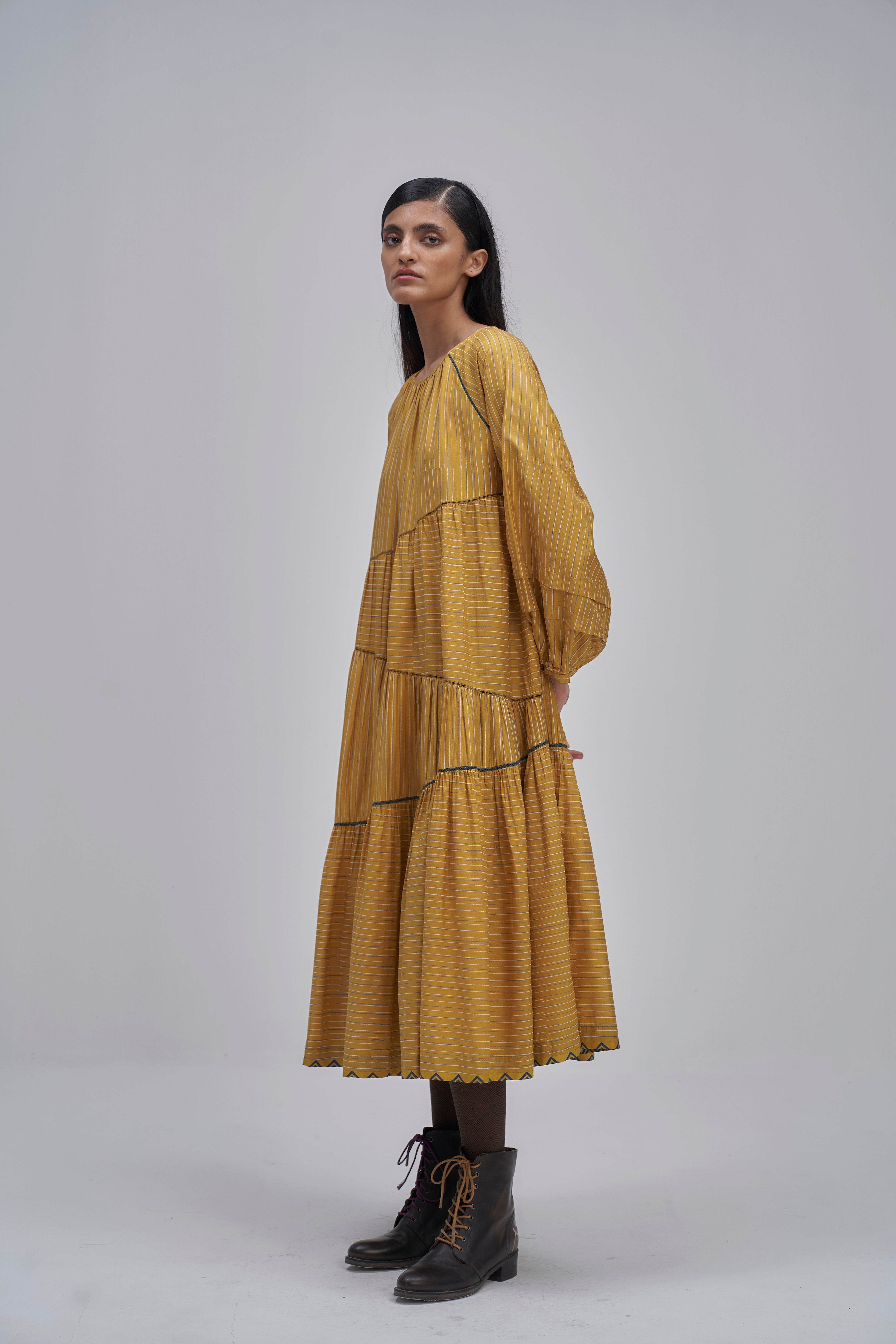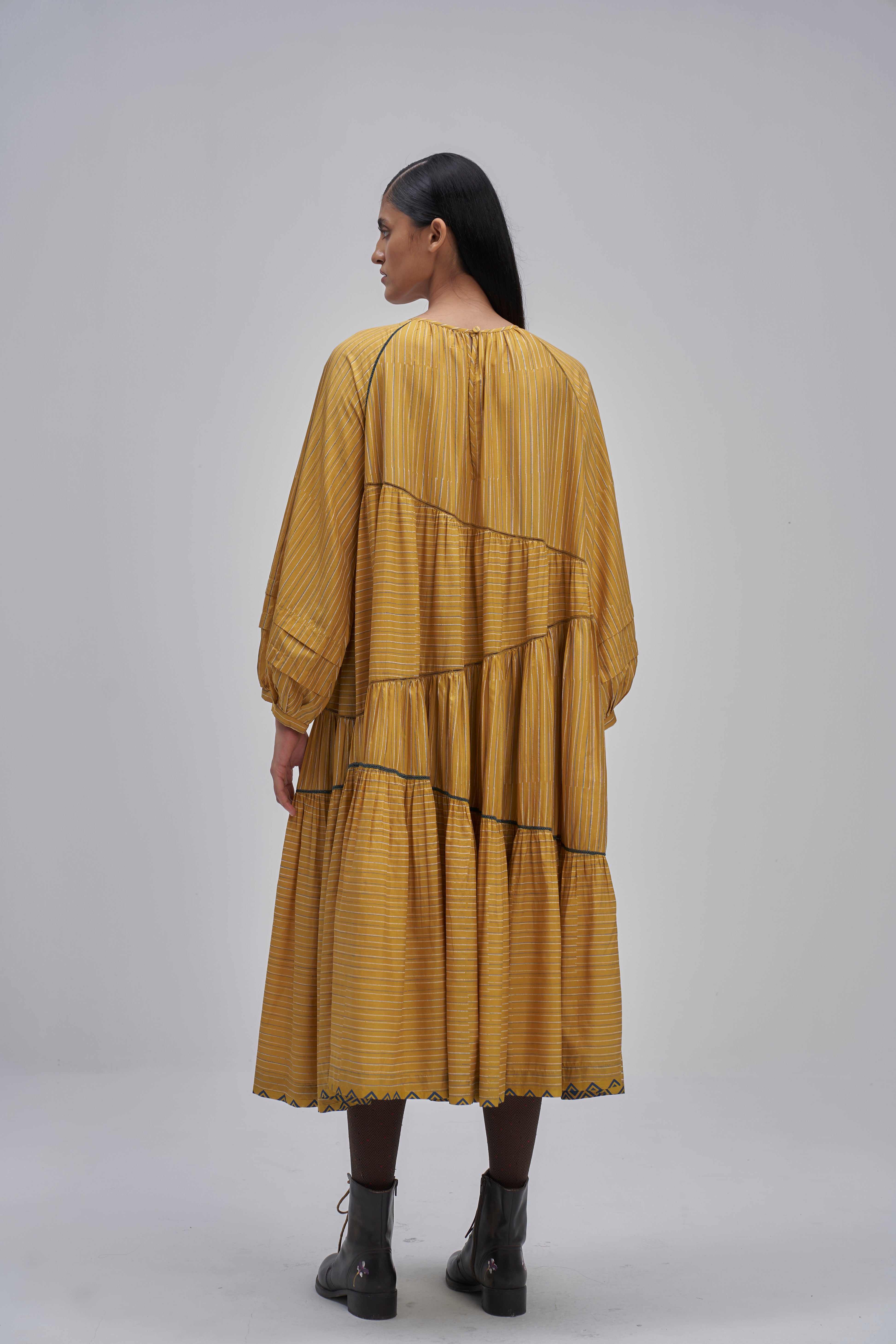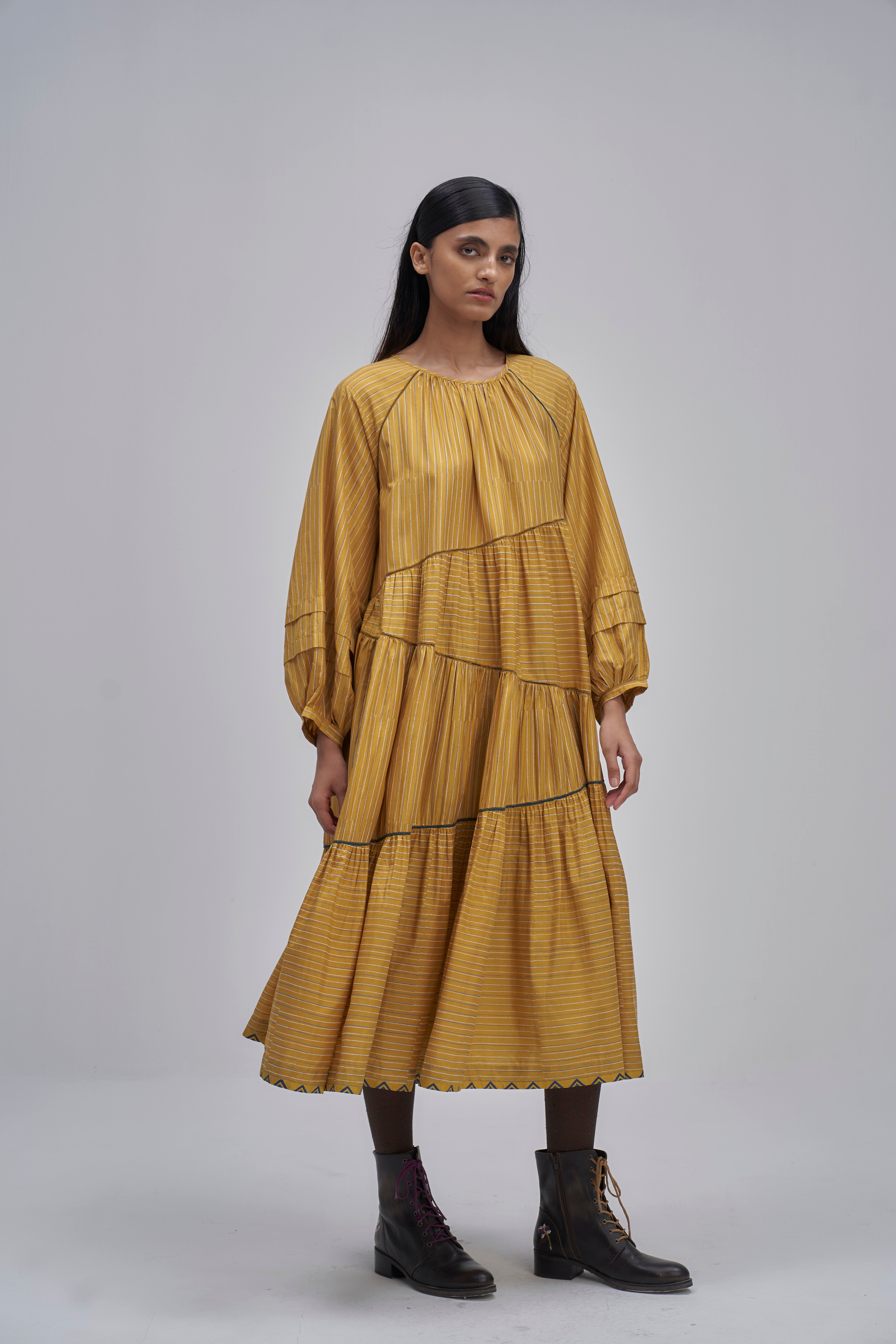 Round neckline raglan sleeve asymmetrical tier maxi dress with tuck detail on full puff sleeves and back button closure detail. Constructed in solid 100% silk fabric. Finished with contrast handblock print piping detail and collage handblock printed 100% silk fabric facing detail.