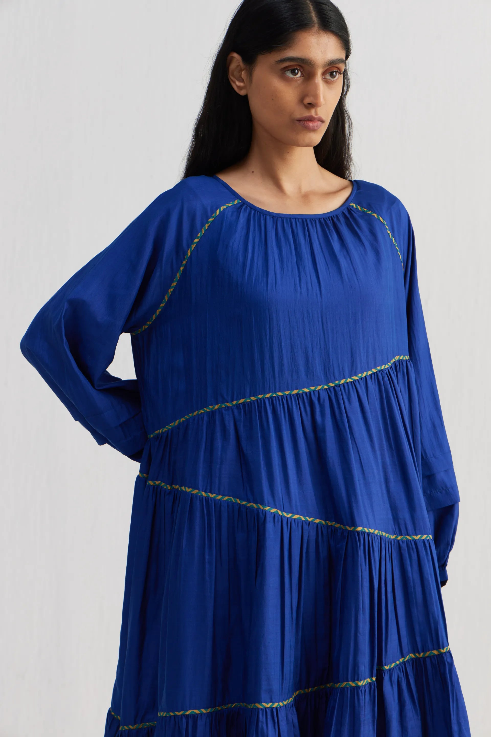 Round neckline raglan sleeve asymetrical tier maxi dress with tuck deatil on full puff sleeves and back button closure detail. Constructed in solid 100% silk fabric. Finished with contrast handblock print piping detail and collage handblock printed 100% silk fabric facing detail.