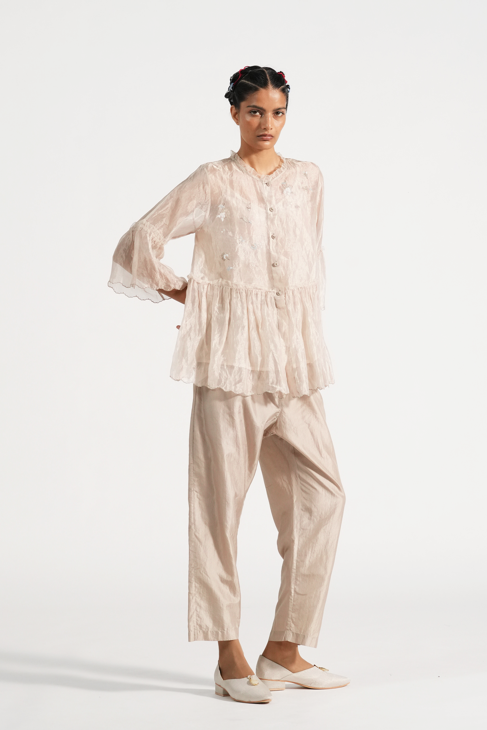 Button down tiered top with gathers in golden tissue. With multicolor floral embroidery. Comes with a complimentary cotton silk lining.