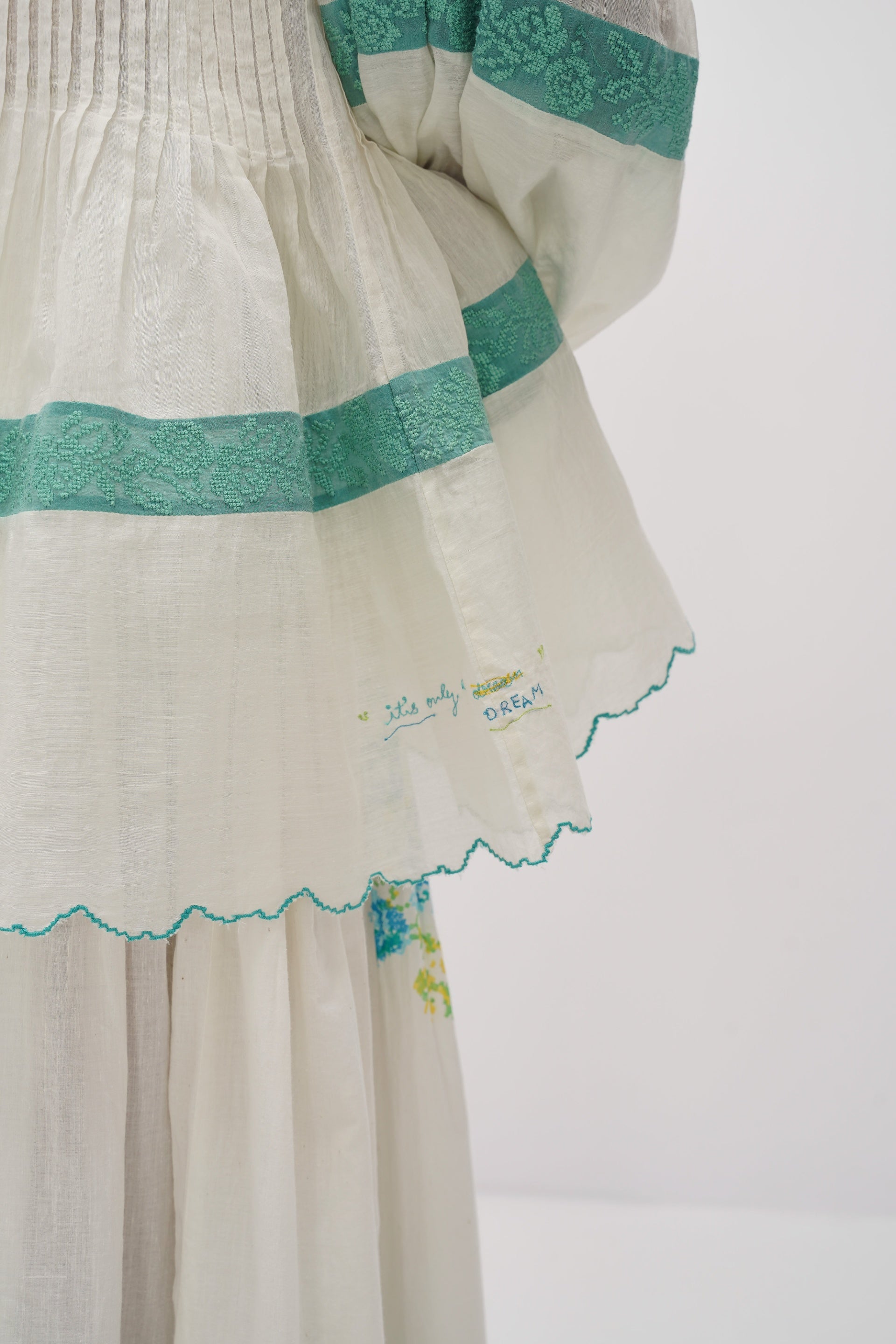 Off white silk chanderi front open pinktuck detail top with cross sticth embroidered inserts and scallop detail. Comes with a separate cotton silk lining