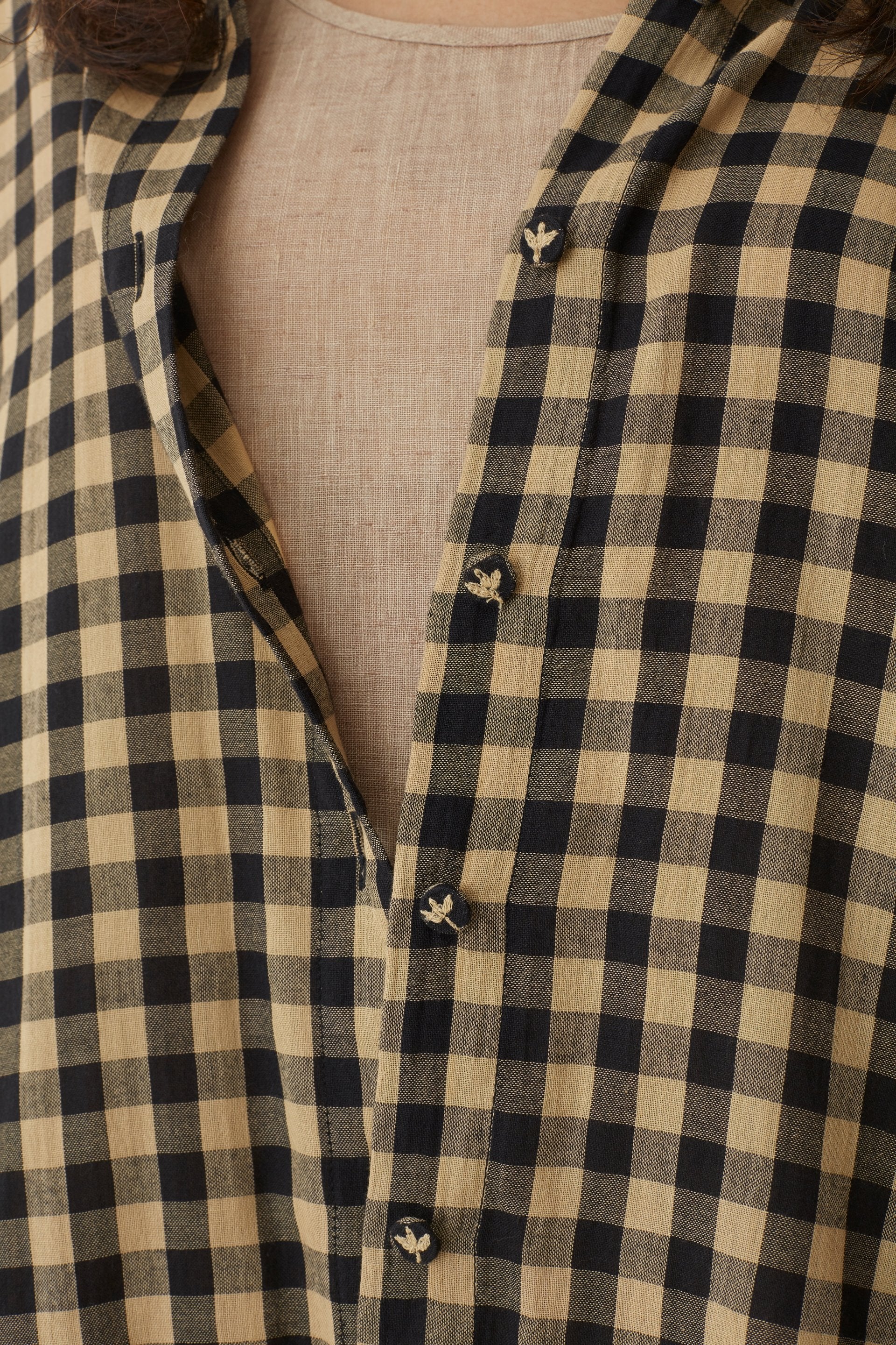 Beige and black checks shirt with mandarin collar and front open embroidered buttons with curved hem, made in cotton