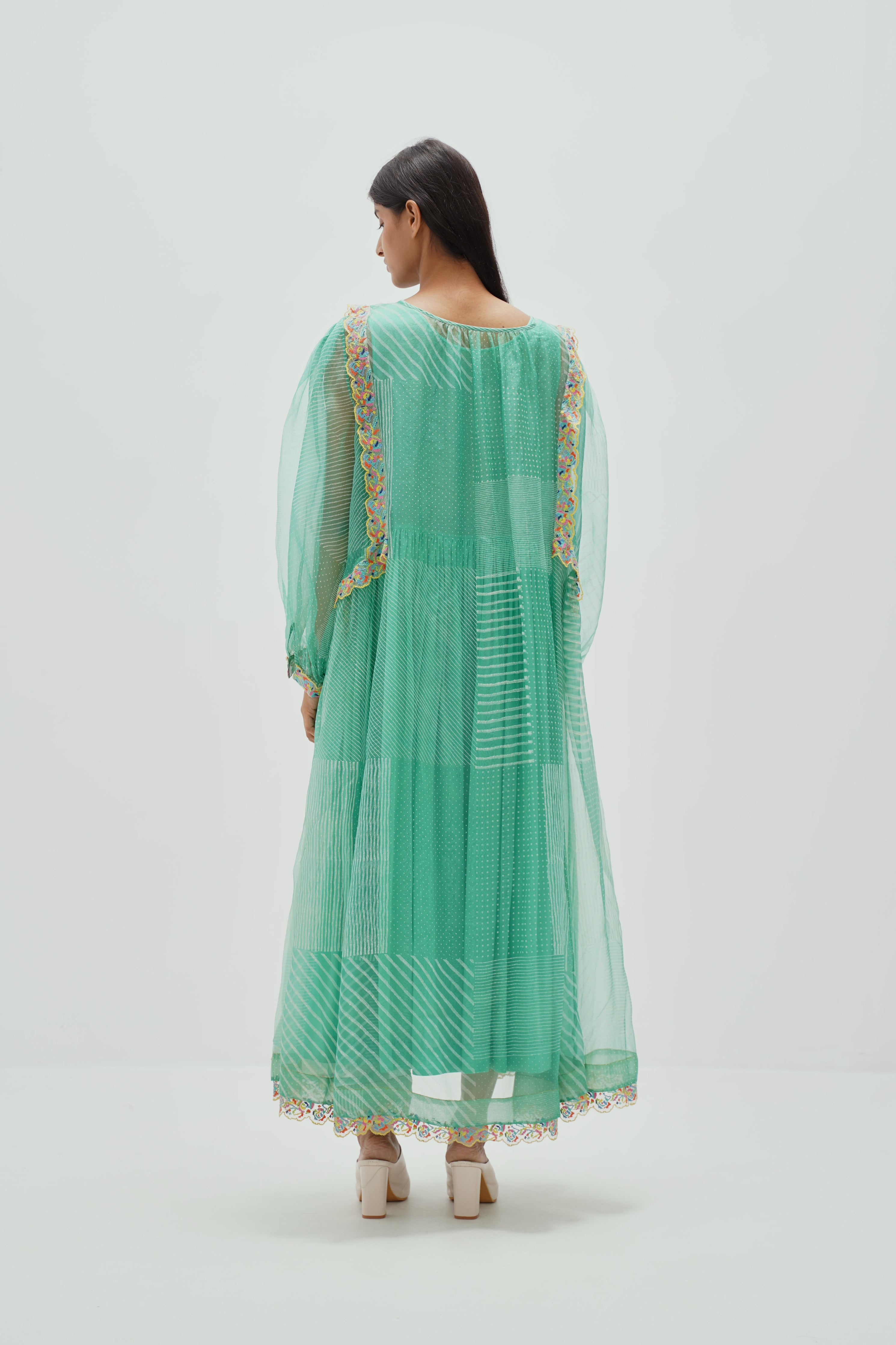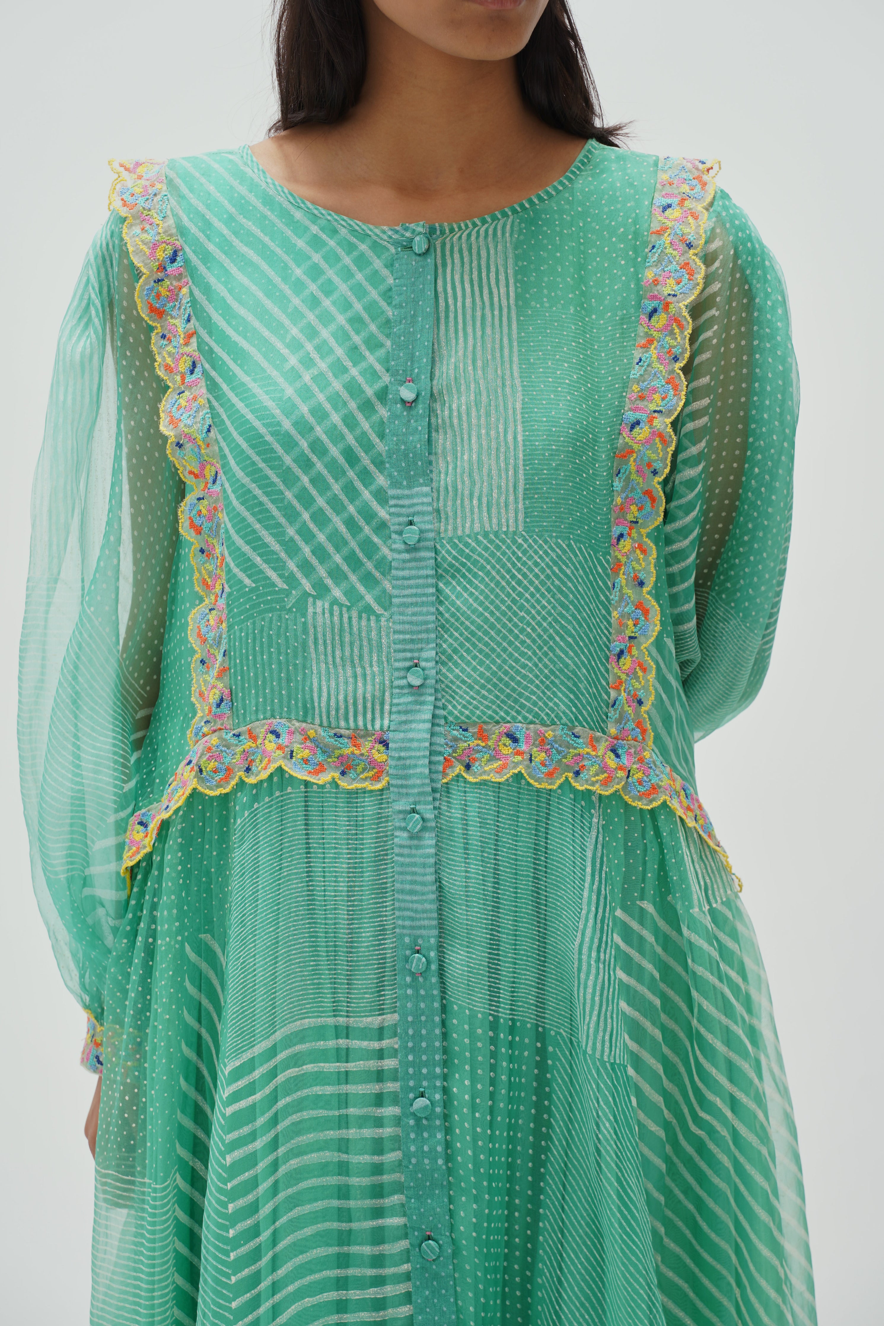Front button down hand block discharge dress with multicolor lace trim inserts. Comes with solid mint cotton silk lining.