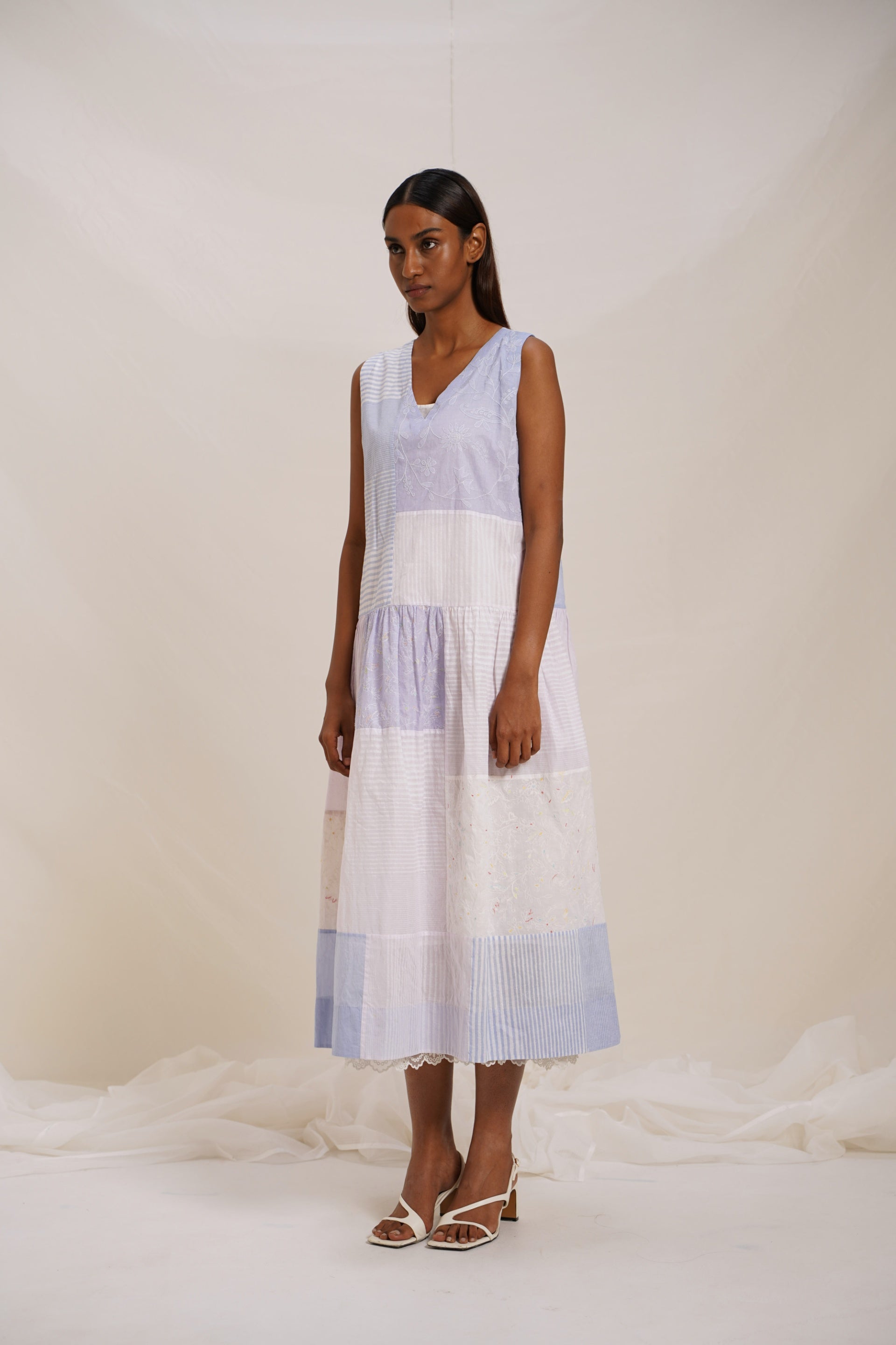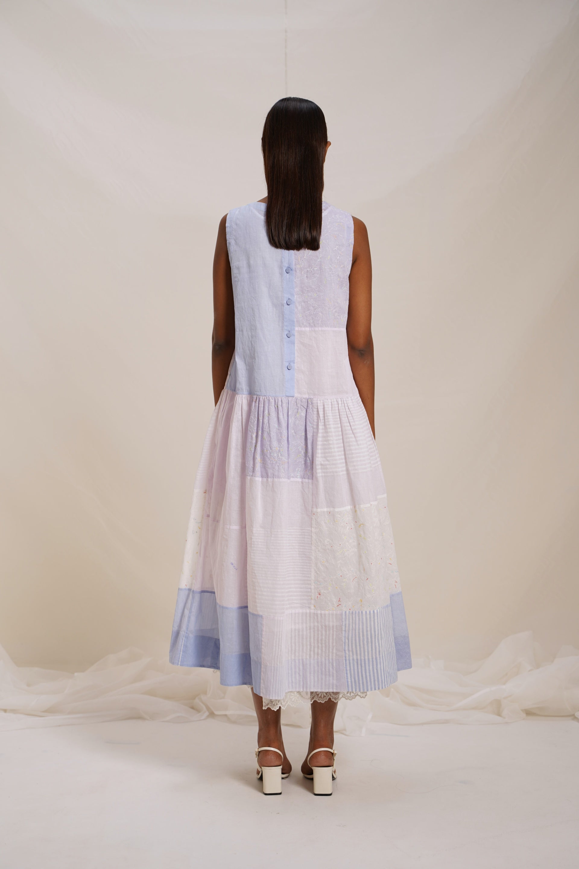 Sleeveless midi paneled dress with floral hand embroidery and contrasting chevron applique detail, hand block print with multiple patch work. The dress features a series of meticulously joined panels, each contributing to its flattering, structured fit, comes with a separate lining.