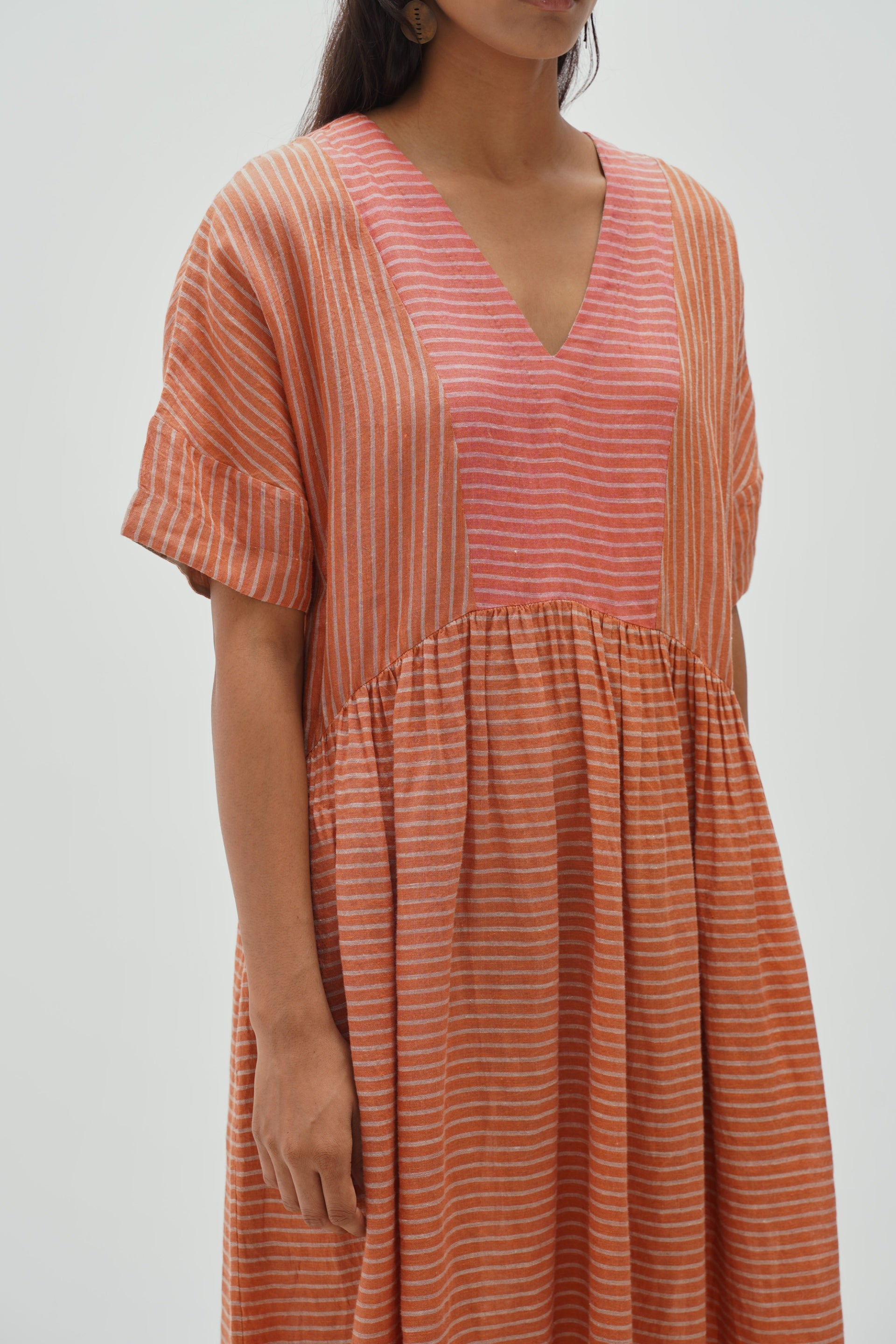 V- neck dress in contrast yoke and hem with curved waist seam detail