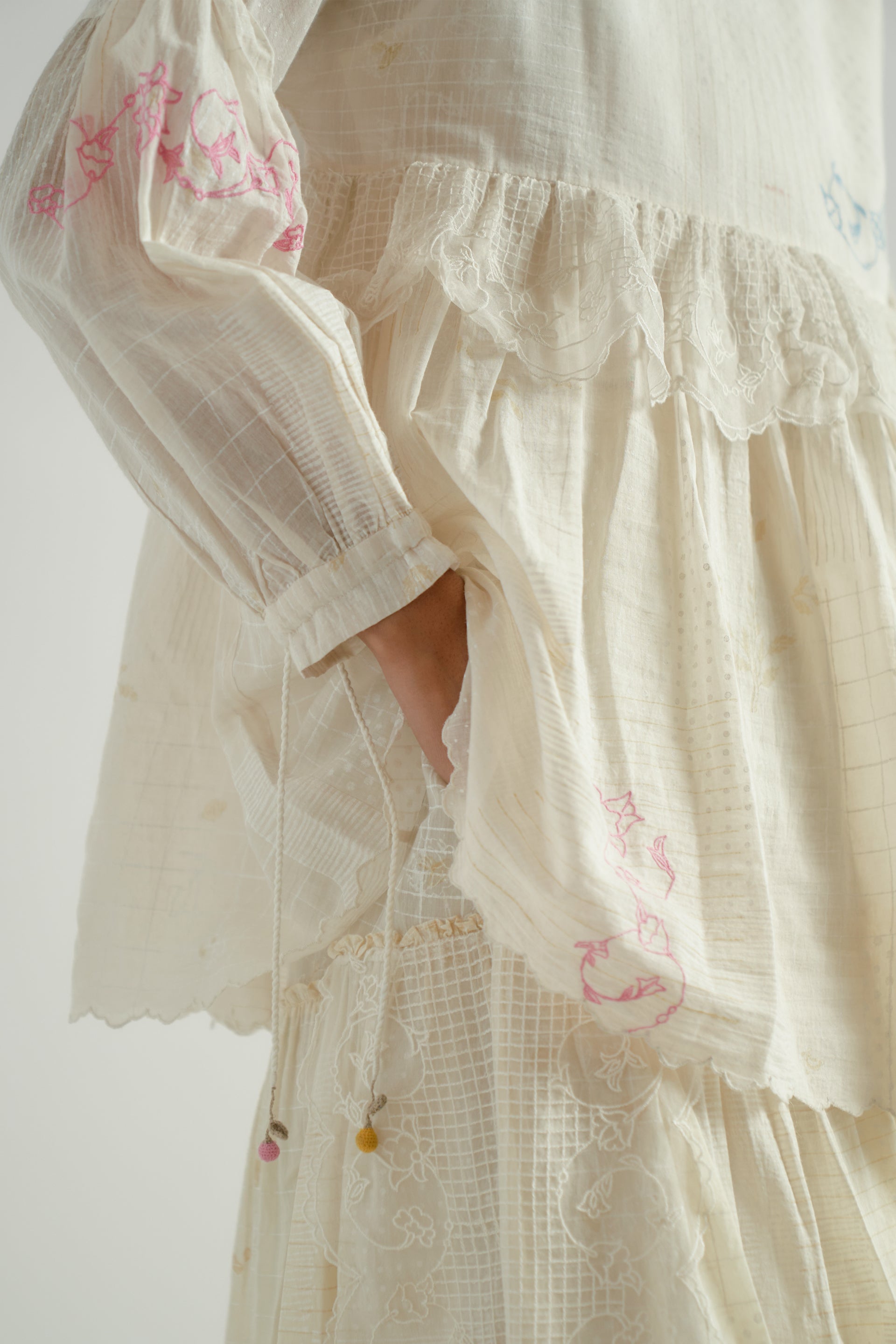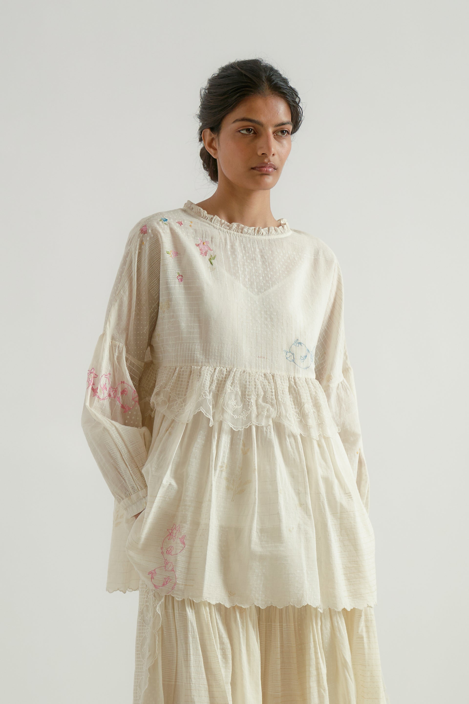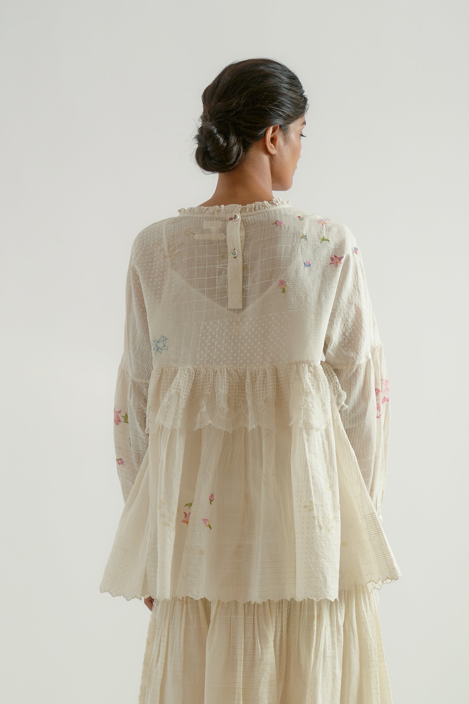 Round-neck gathered tiered top featuring puff sleeves with gathers and a tie-up detail, accented with multicolor hand-crocheted berry tassels and a scalloped edge hem. Crafted from a cotton-silk blend, this top features a back placket with embroidered buttons and multi-technique, multicolor floral embroidery on a tonal hand-block printed fabric.