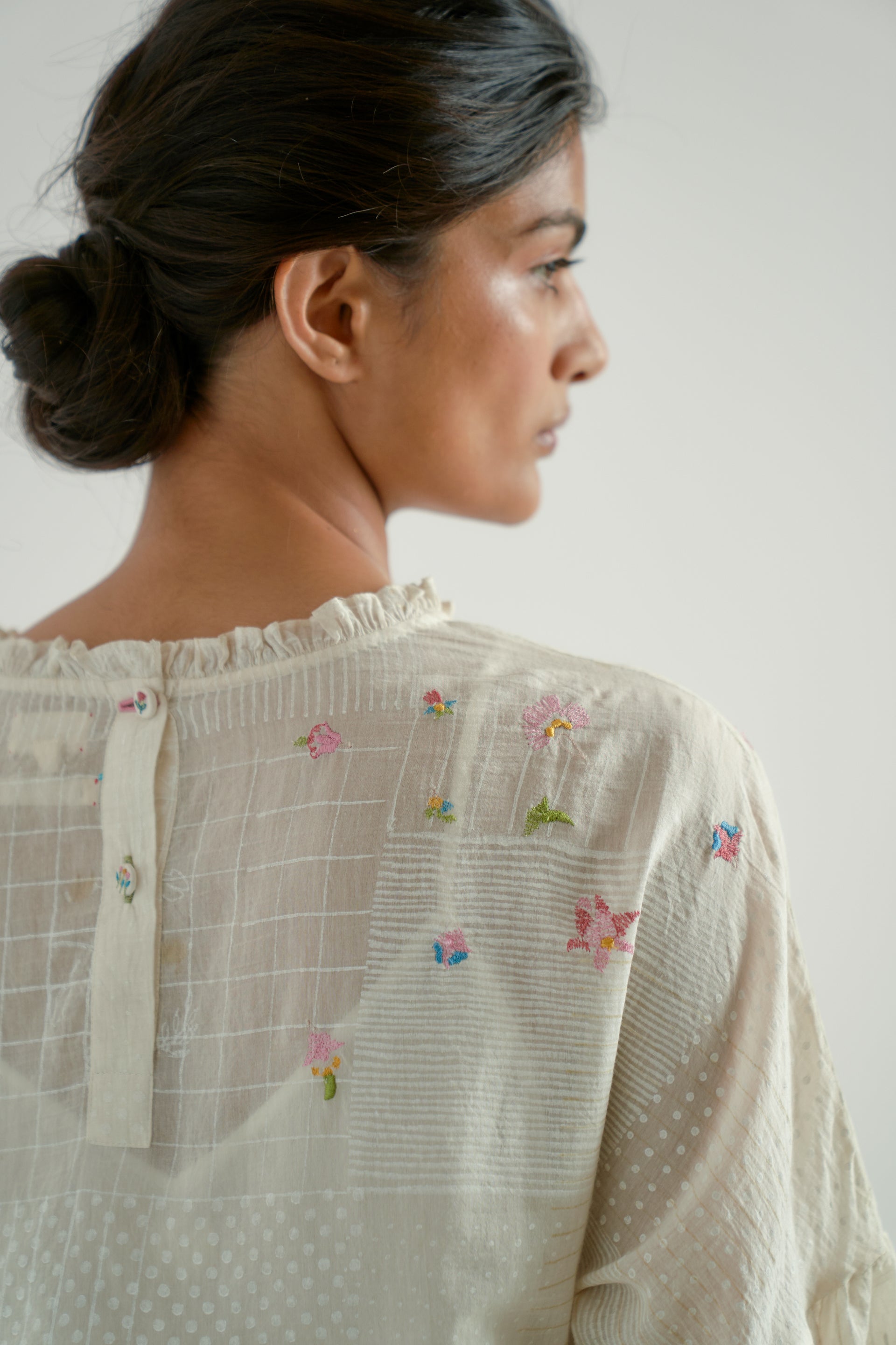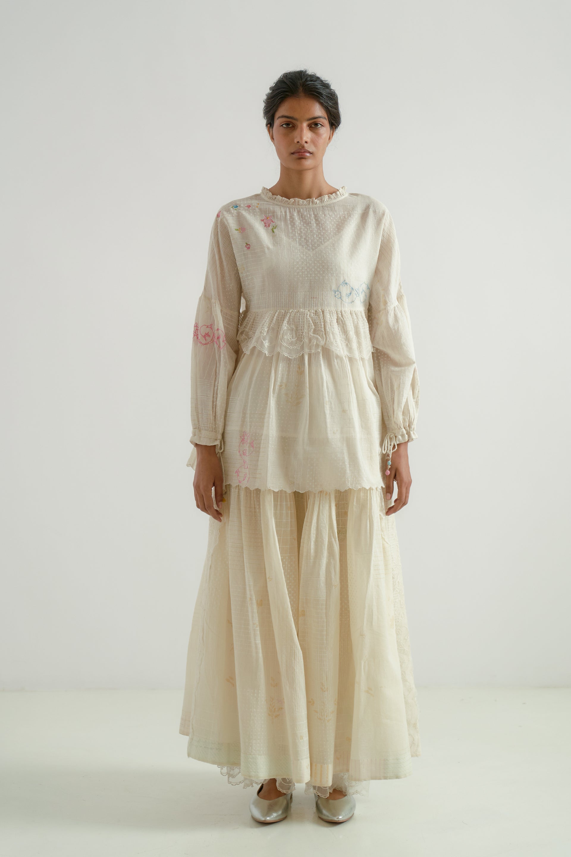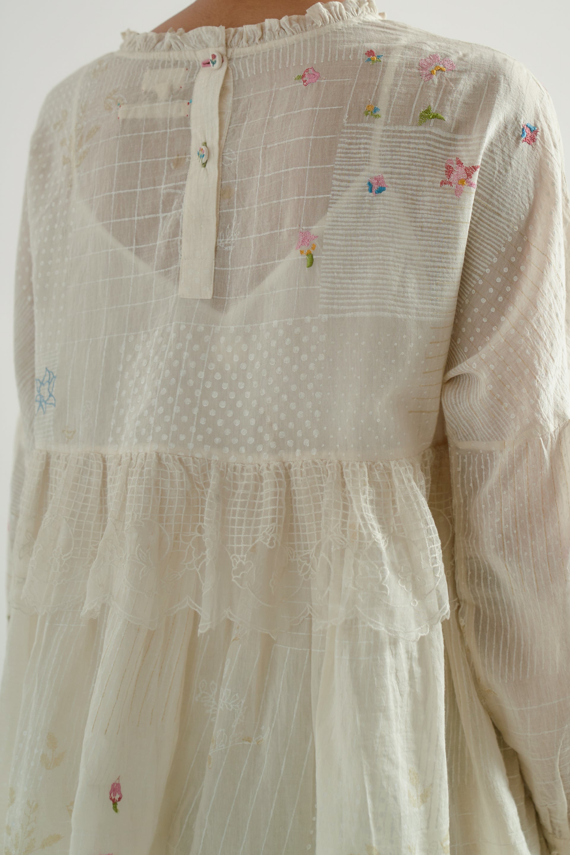 Round-neck gathered tiered top featuring puff sleeves with gathers and a tie-up detail, accented with multicolor hand-crocheted berry tassels and a scalloped edge hem. Crafted from a cotton-silk blend, this top features a back placket with embroidered buttons and multi-technique, multicolor floral embroidery on a tonal hand-block printed fabric.