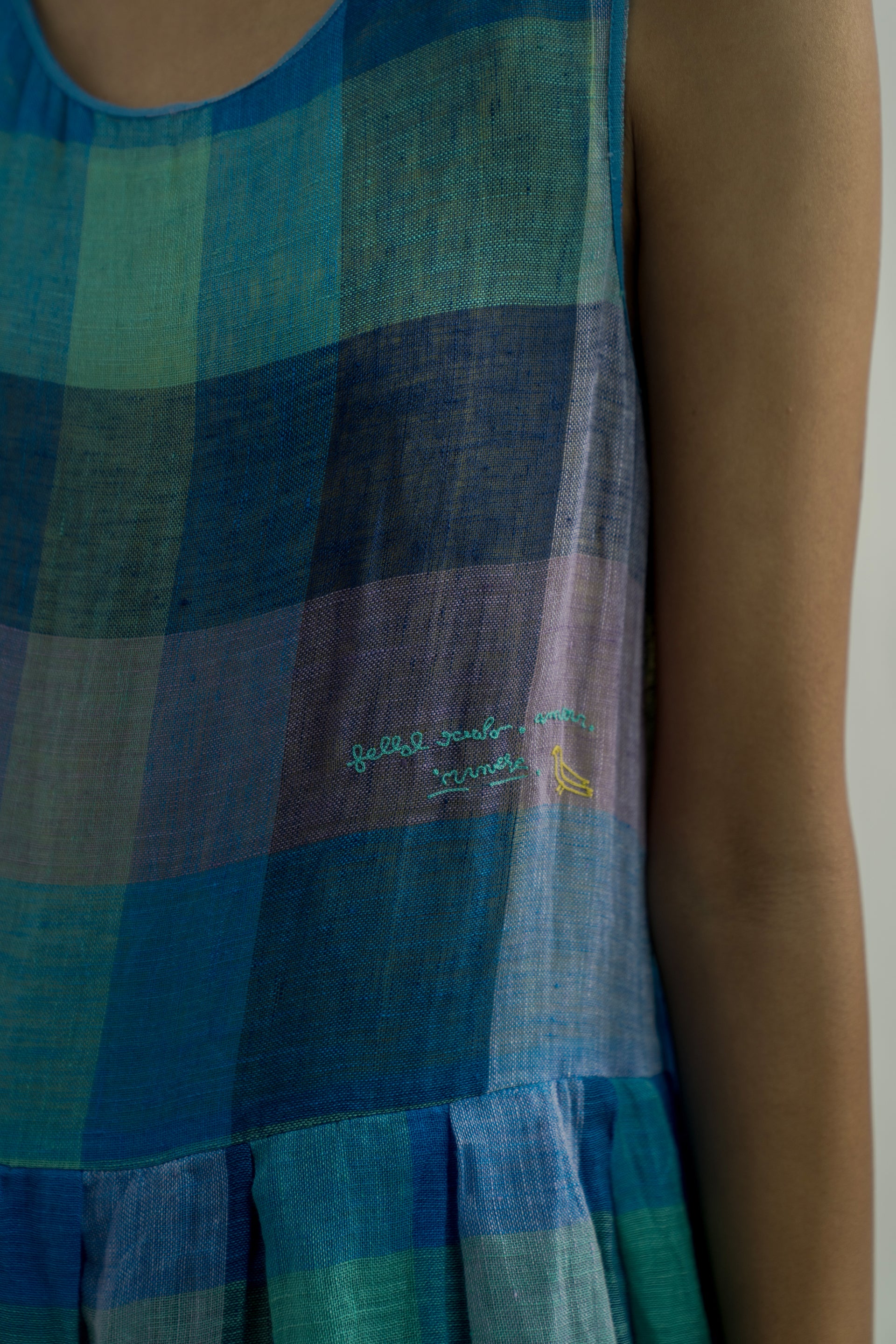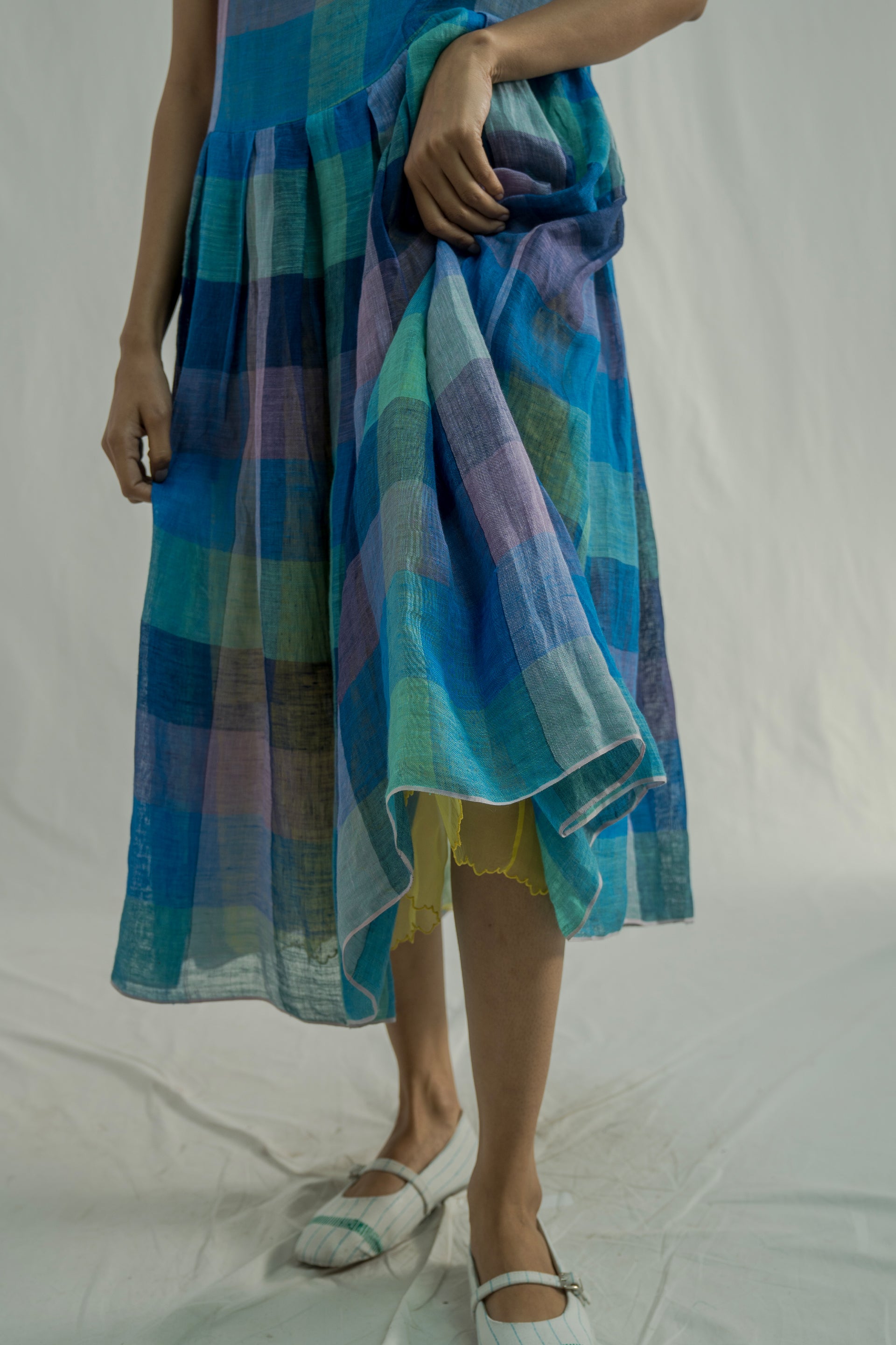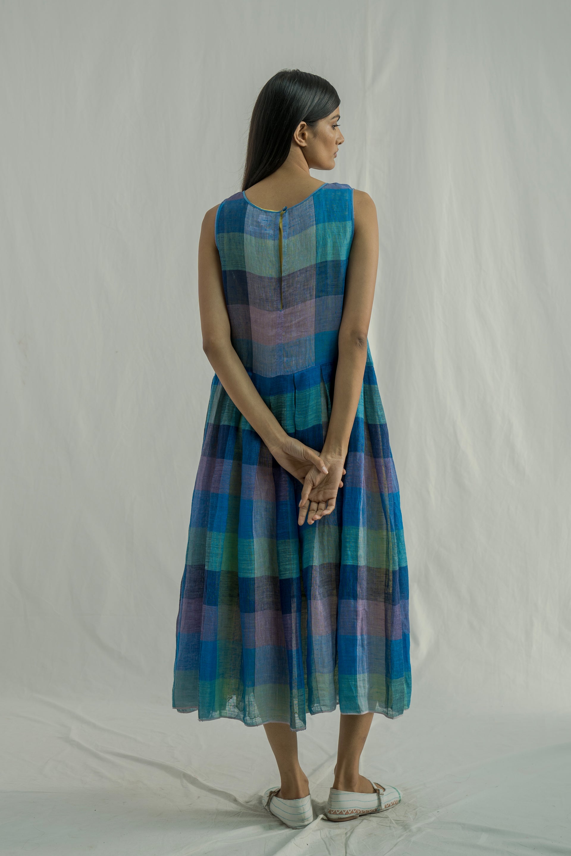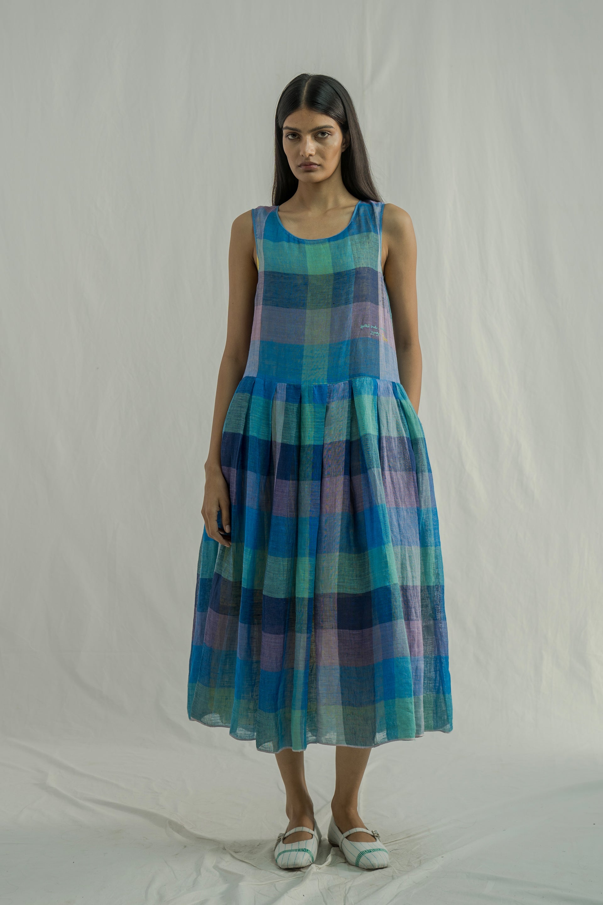 A sleeveless midi dress with a boat neckline, featuring box pleats at the waist and selvedge detailing on the hem. Crafted from multicolor checked 100% linen gauze fabric, it is lined with an attached multicolor placement handblock print cotton-silk lining.