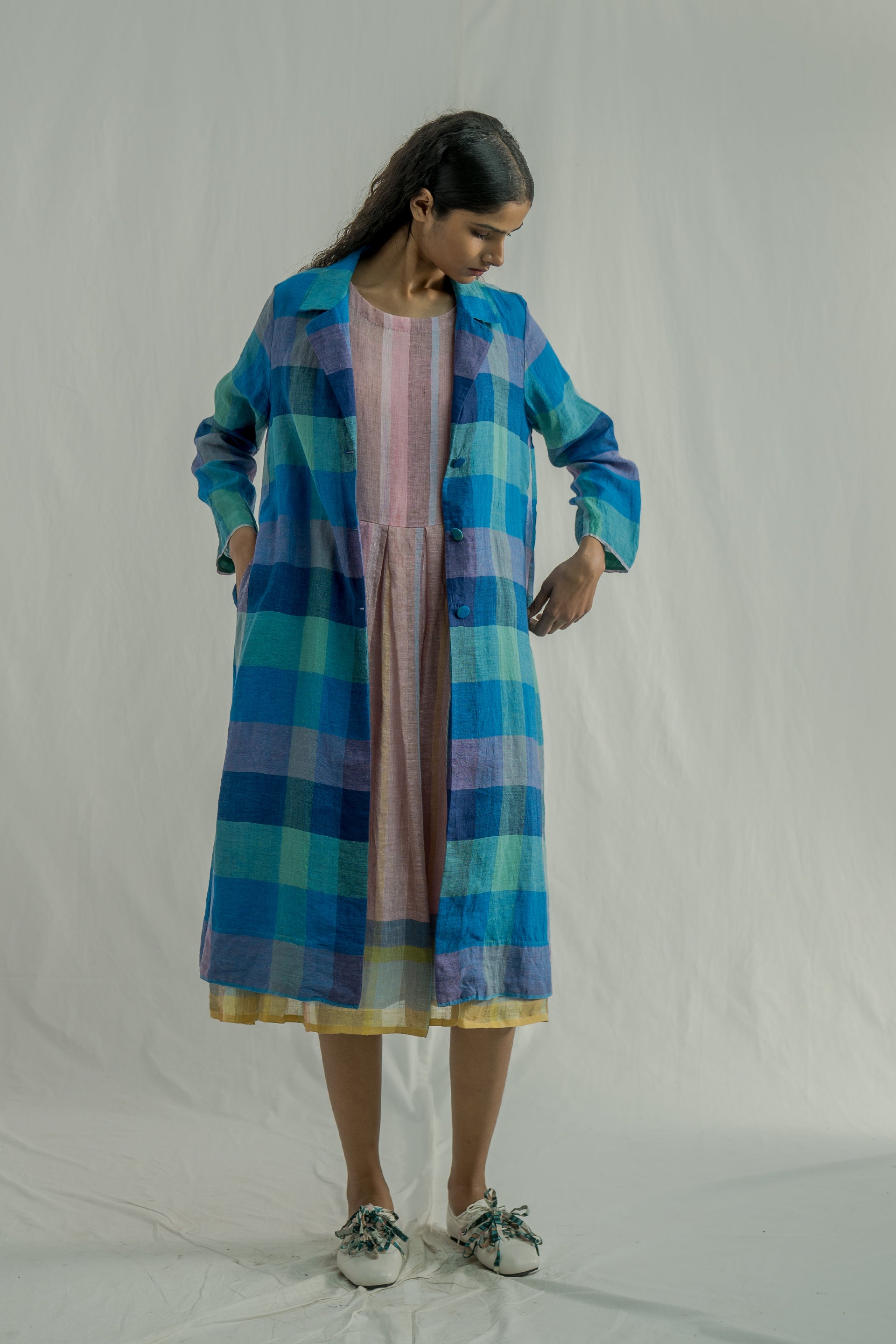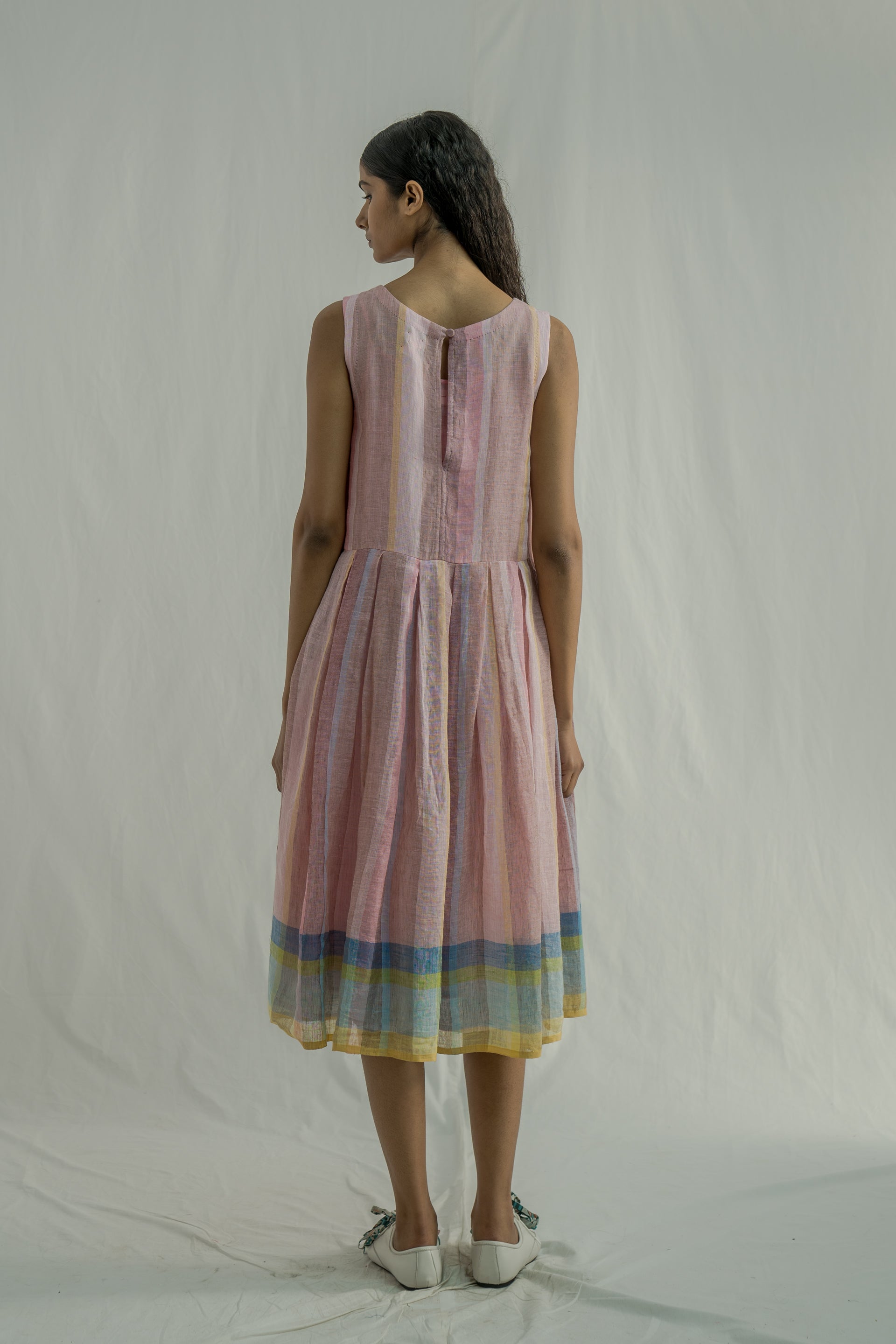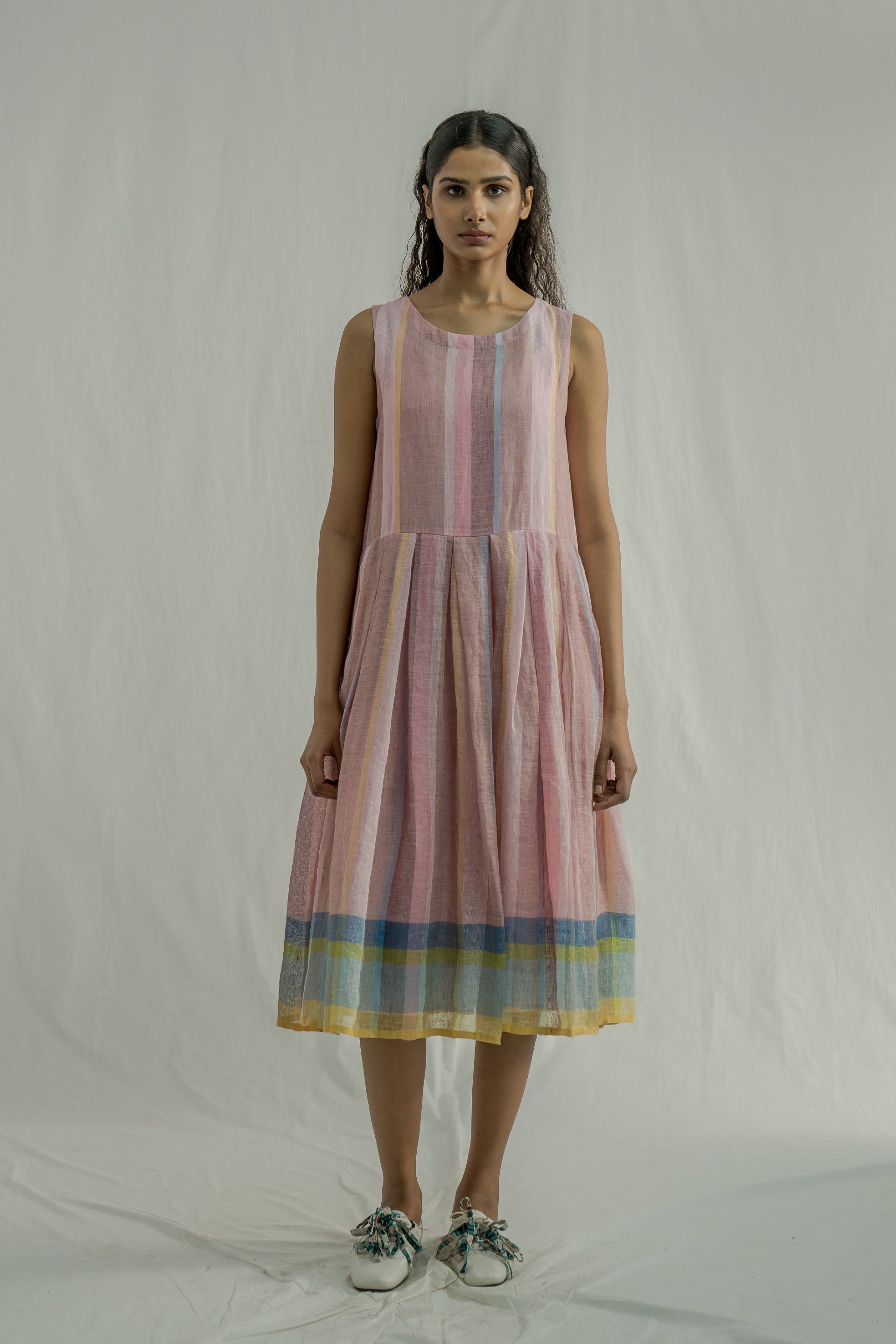 Boat neckline sleeveless midi dress with box pleat on the waist line and selvedge detail on hem. Constructed in multicolor striper and border mix 100% linen gauze fabric. Comes with an attached multicolor placement handblock print cotton silk lining.
