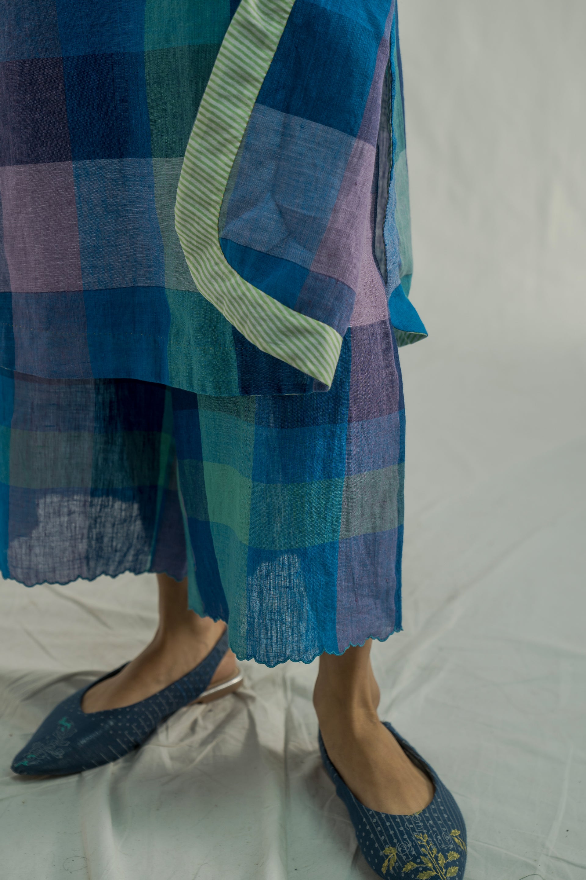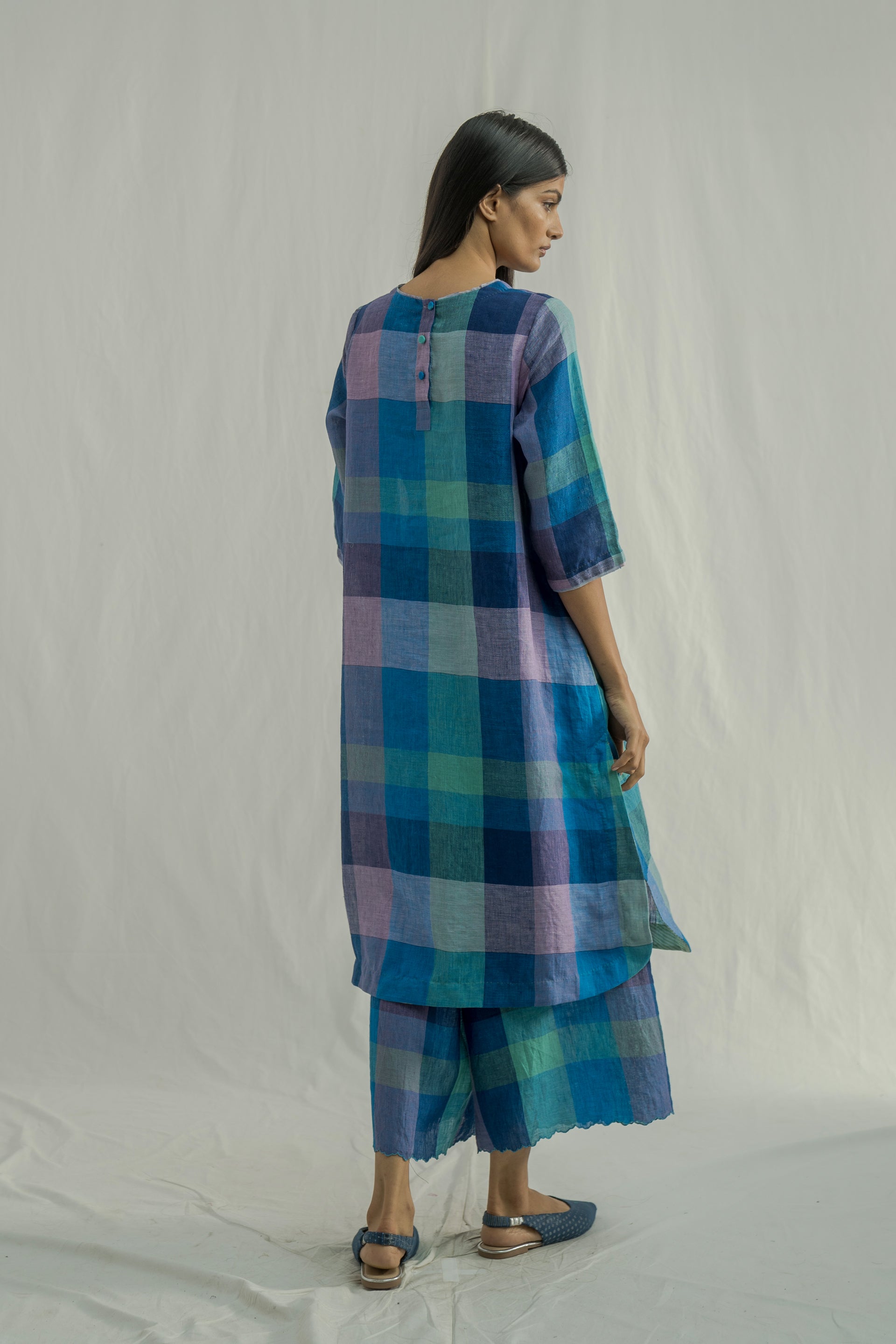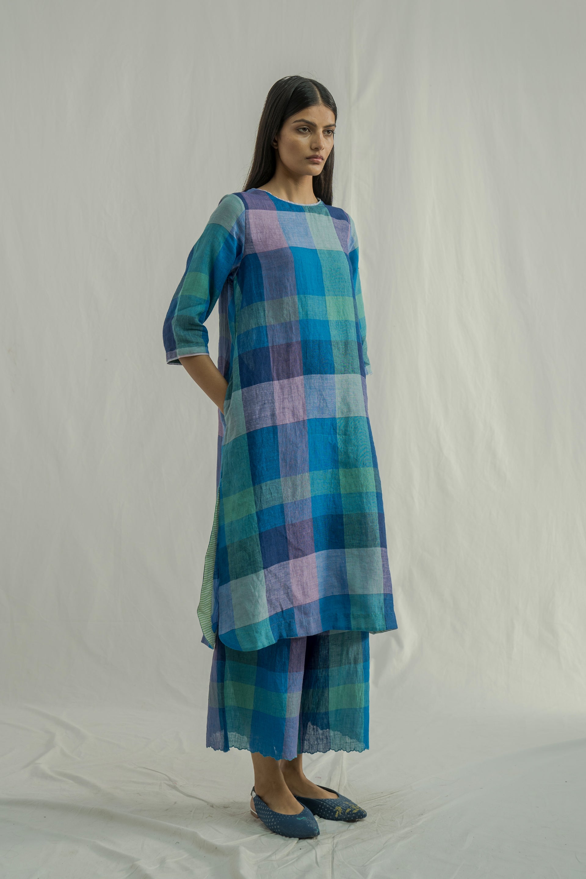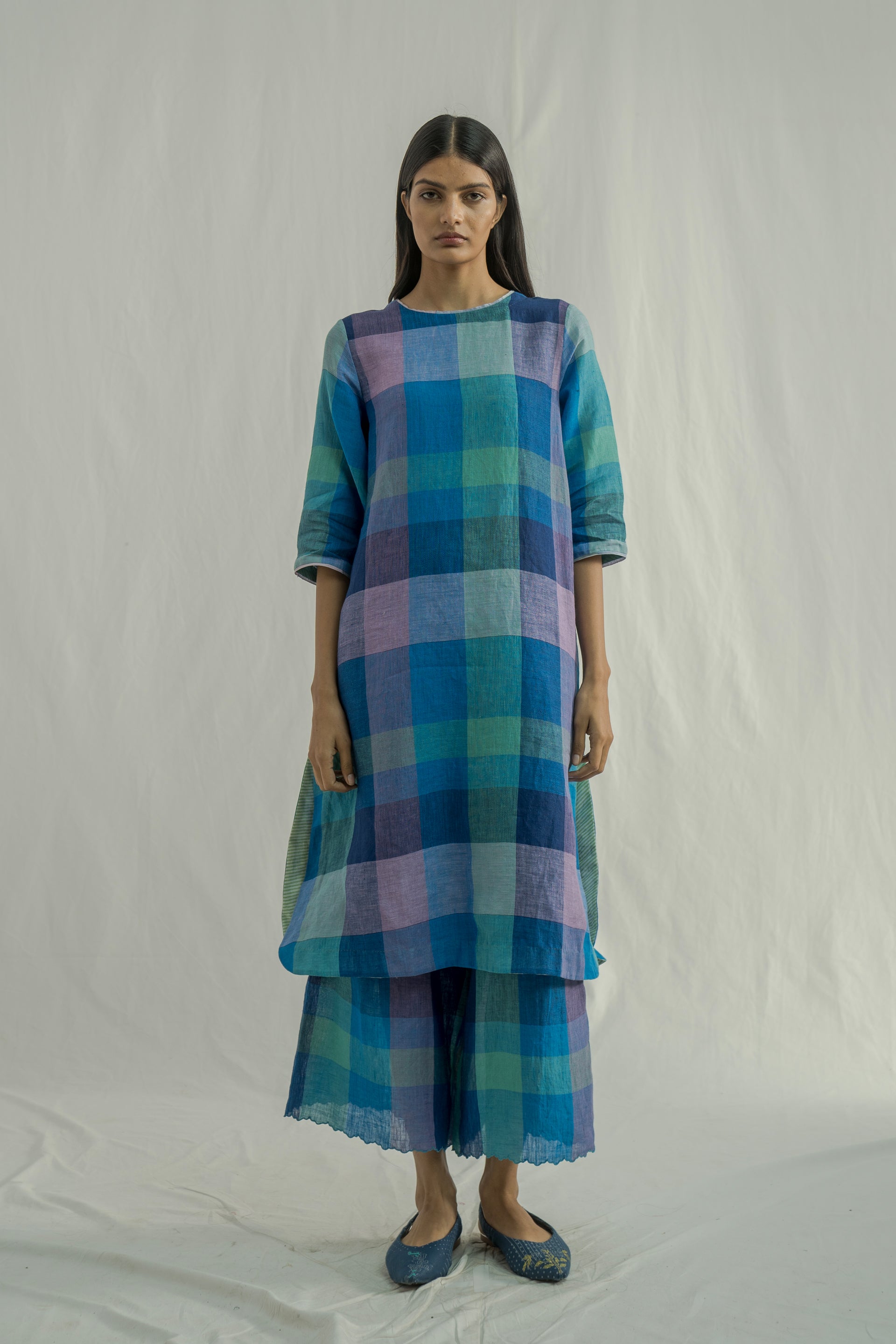 A straight-fit, round-neck midi-length kurta dress with a curved hemline, crafted from multicolor chunky checkered 100% linen. The dress features selvedge detailing on the neckline and sleeves for a refined touch. It is paired with relaxed-fit culottes, featuring scalloped hem, made from the same fabric.