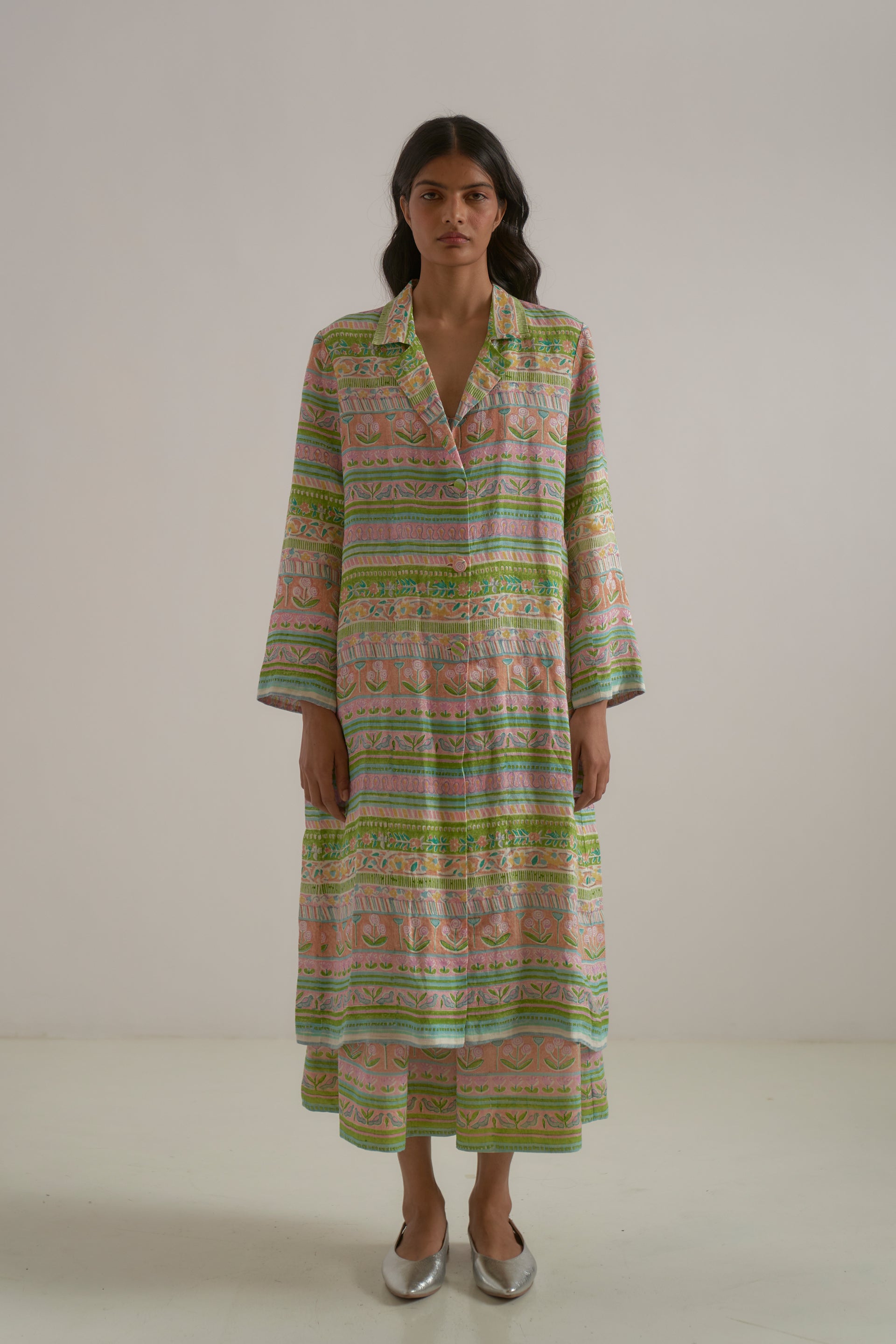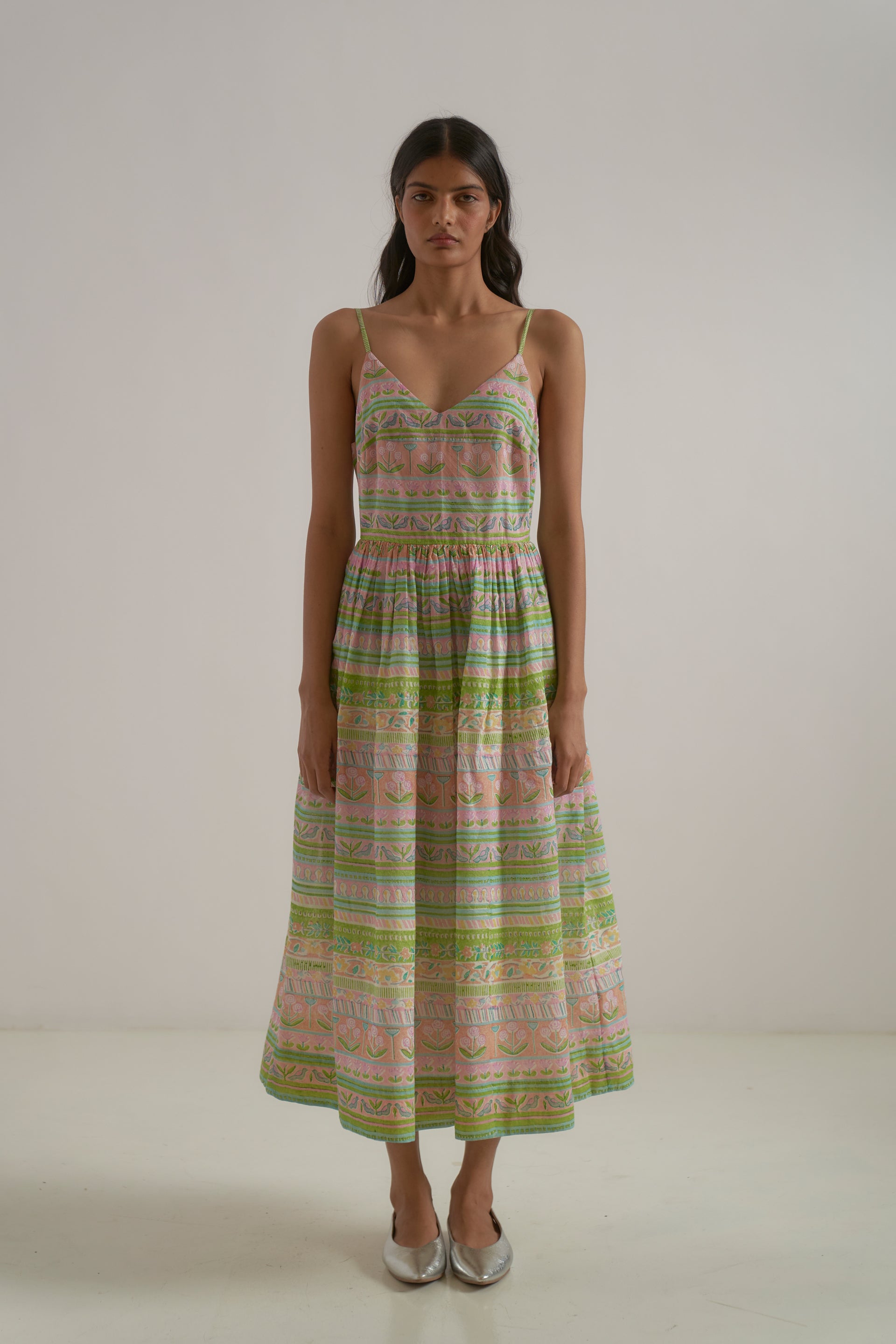 A midi-length sleeveless dress with spaghetti straps, featuring an elasticated back detail for a comfortable fit. Crafted from a cotton-silk blend fabric, this dress showcases a vibrant multicolor allover panel handblock print. it also comes with an attached handblock printed lining.