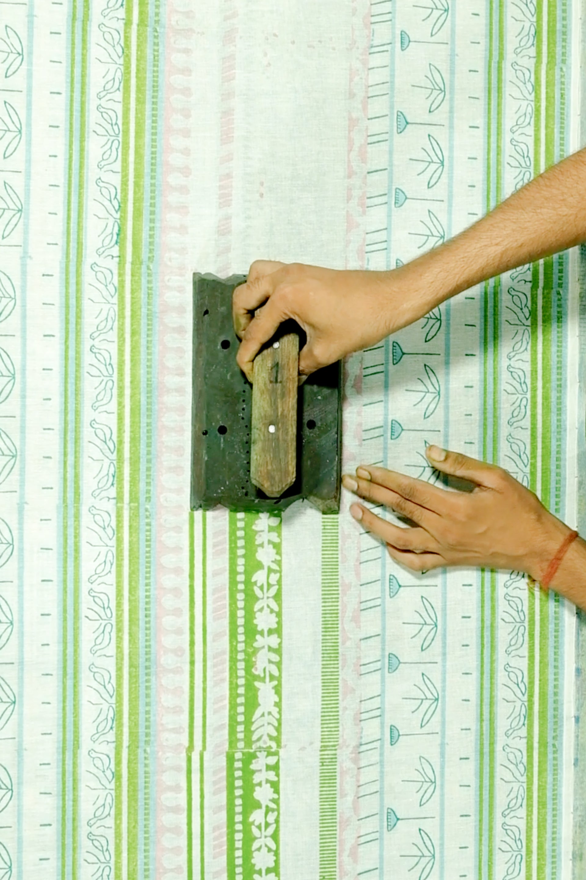 A short jacket with a notch collar and a curved-edge placket detail, made from 100% linen fabric. The piece features a vibrant multicolor handblock print, where 17 distinct handblocks are carefully combined to form a unique, panelled design.