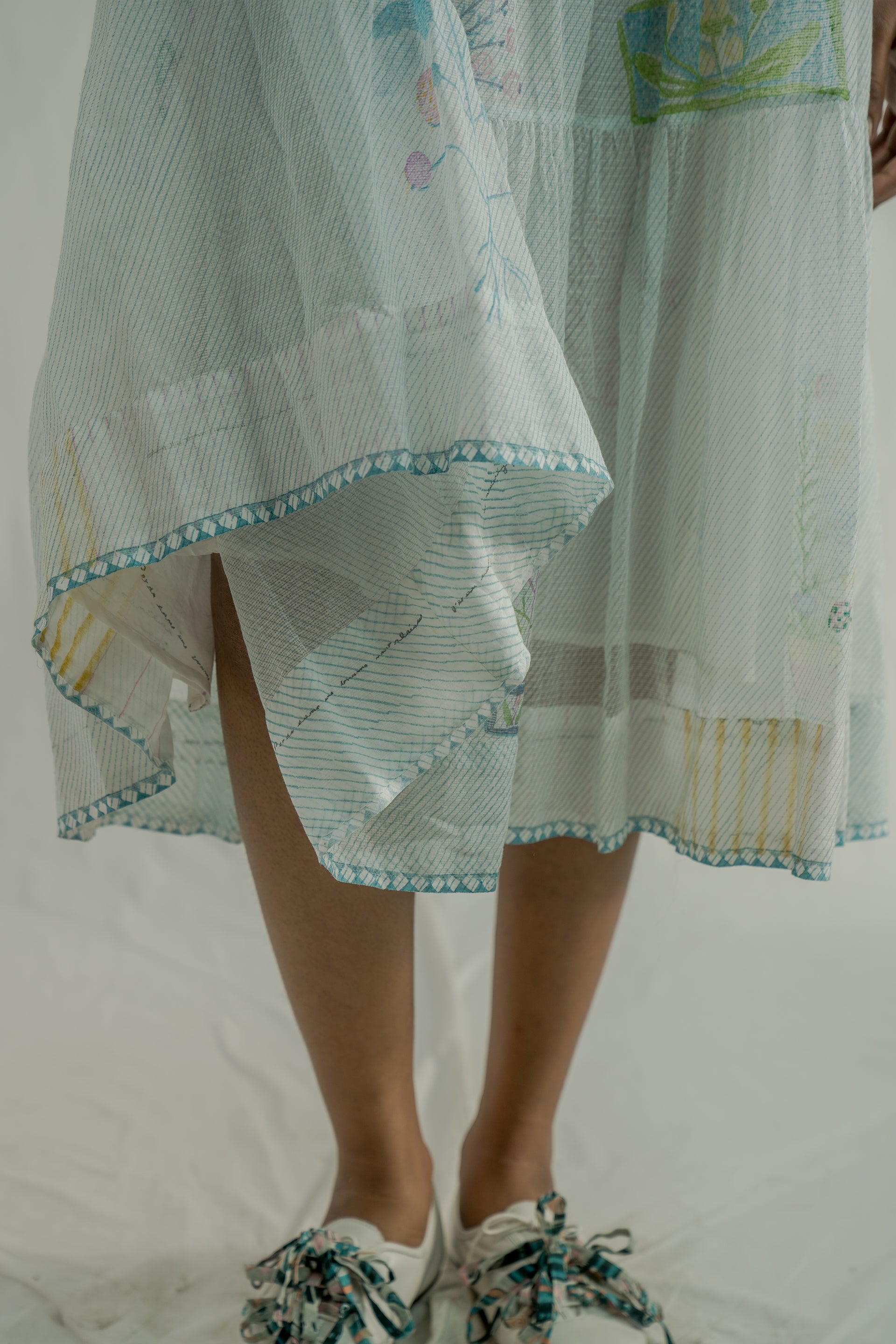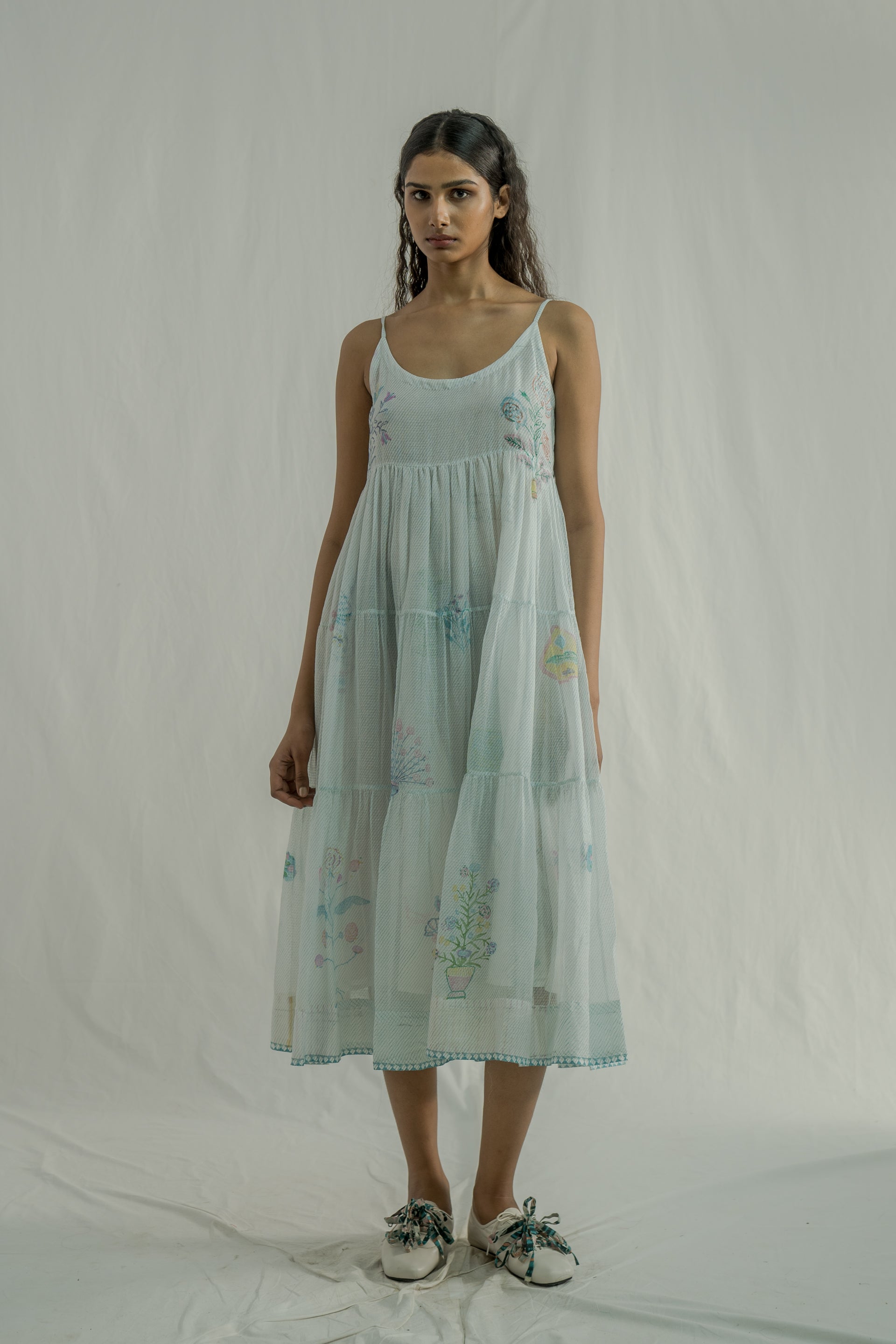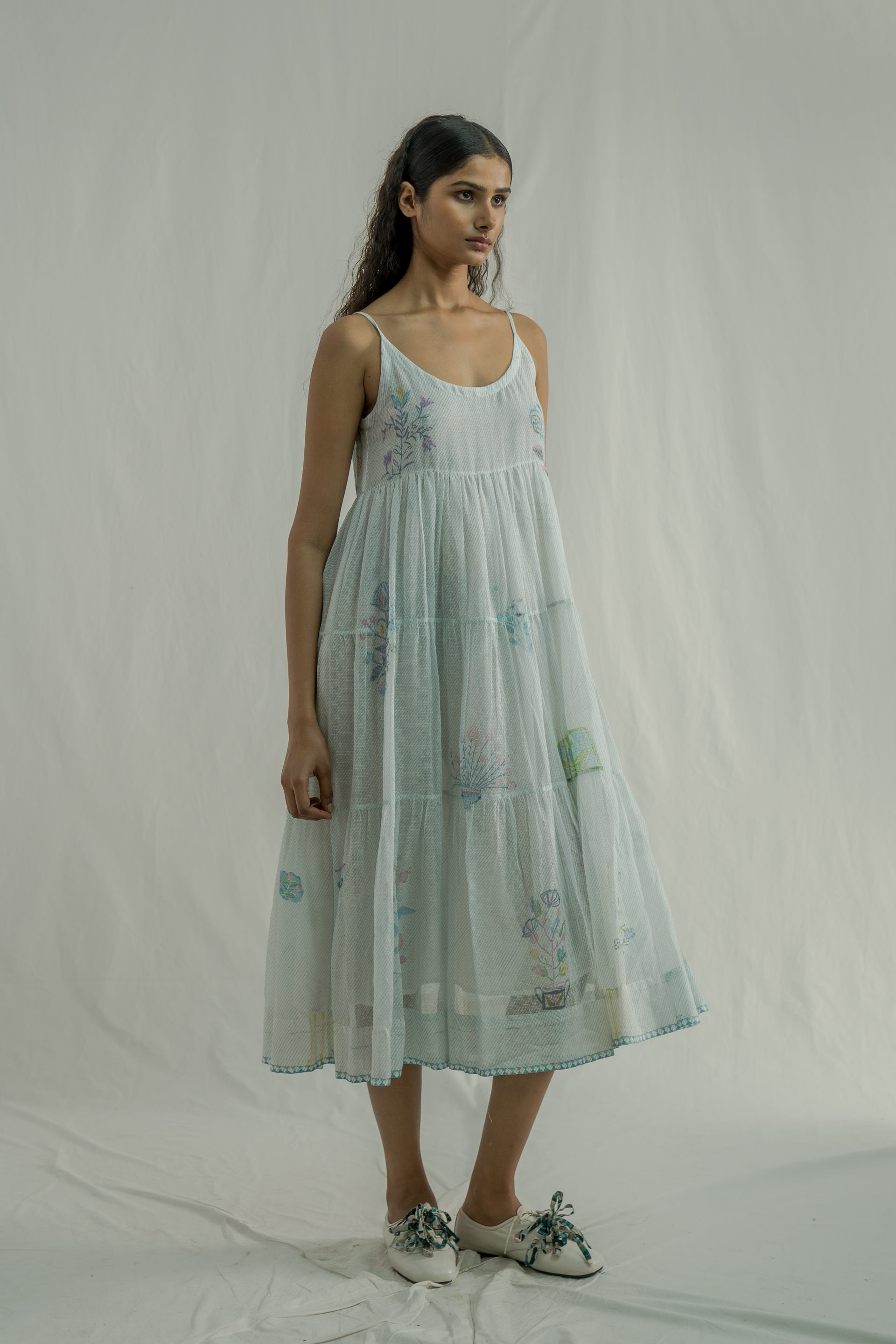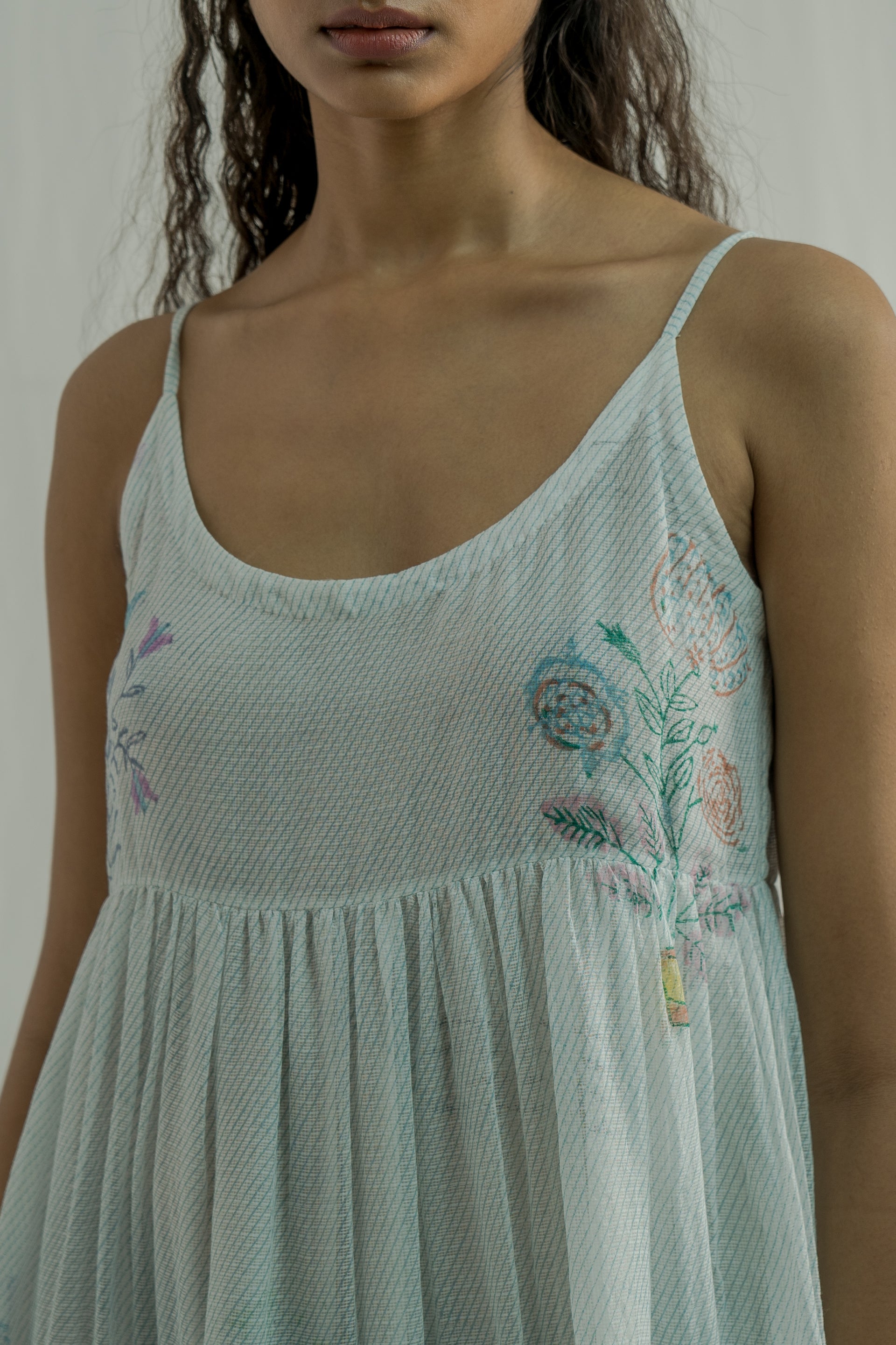 Round deep-neck, adjustable spaghetti strap tiered dress featuring soft gathers for a flattering, flowy silhouette. Crafted from diagonal pinstripes and a placement hand-block print in Kota Doriya fabric, the dress is lined with a matching cotton-silk hand-block print lining.
