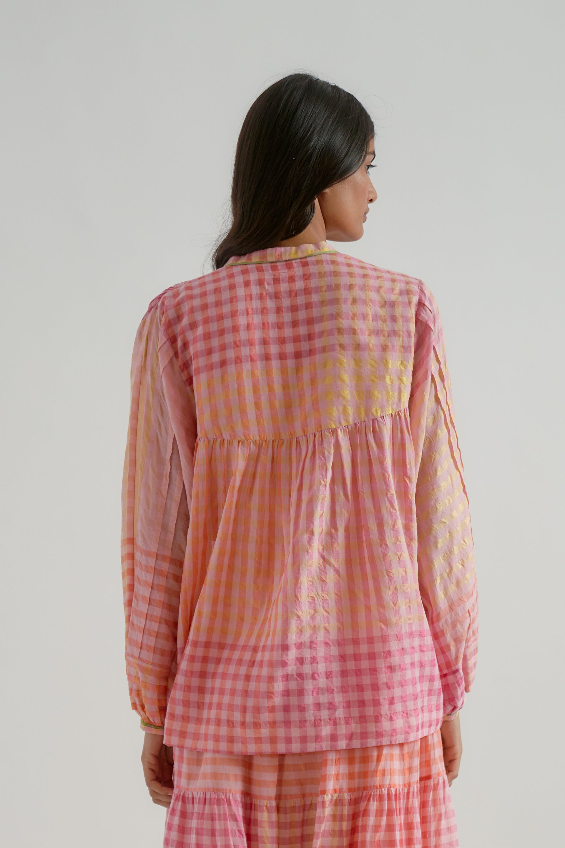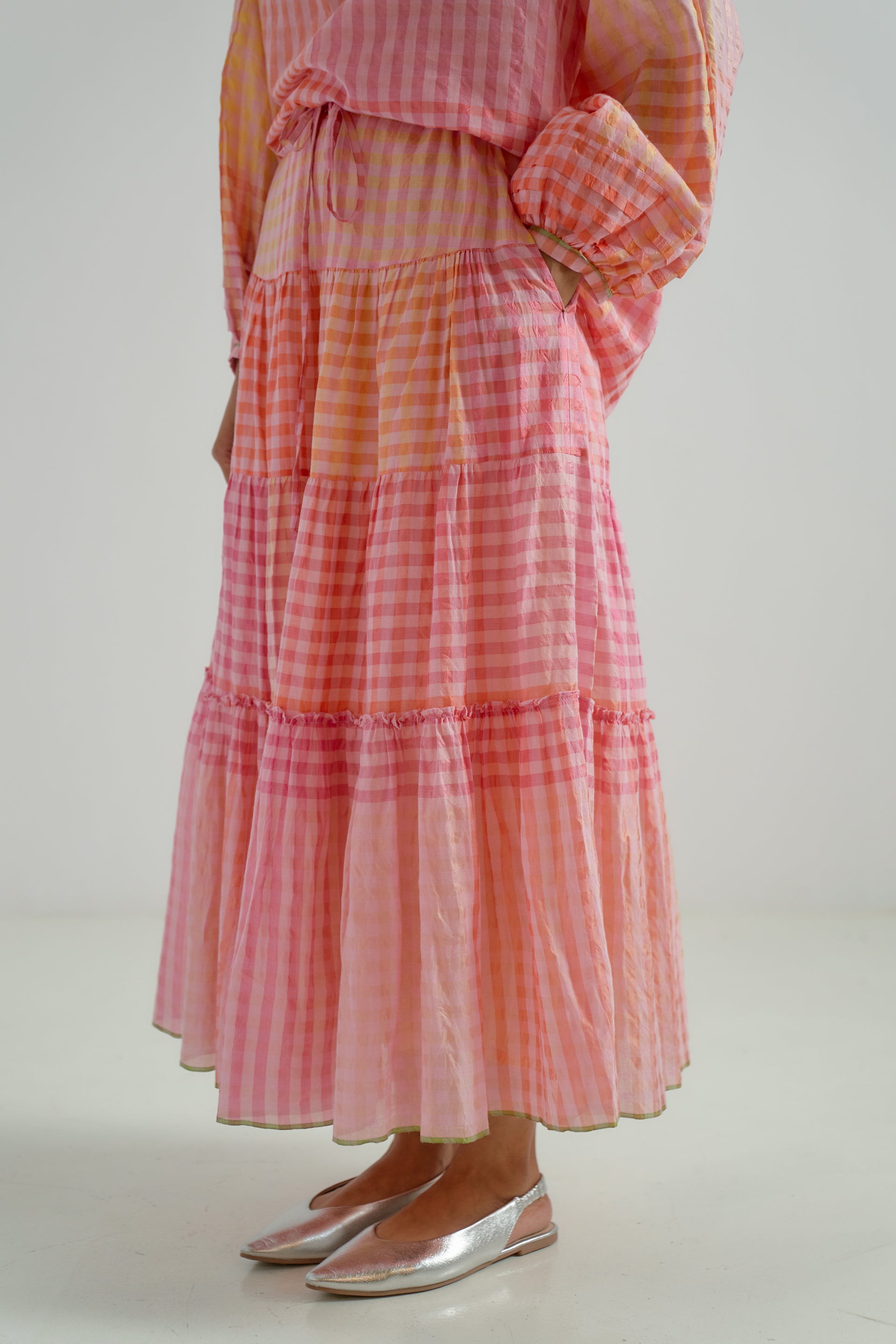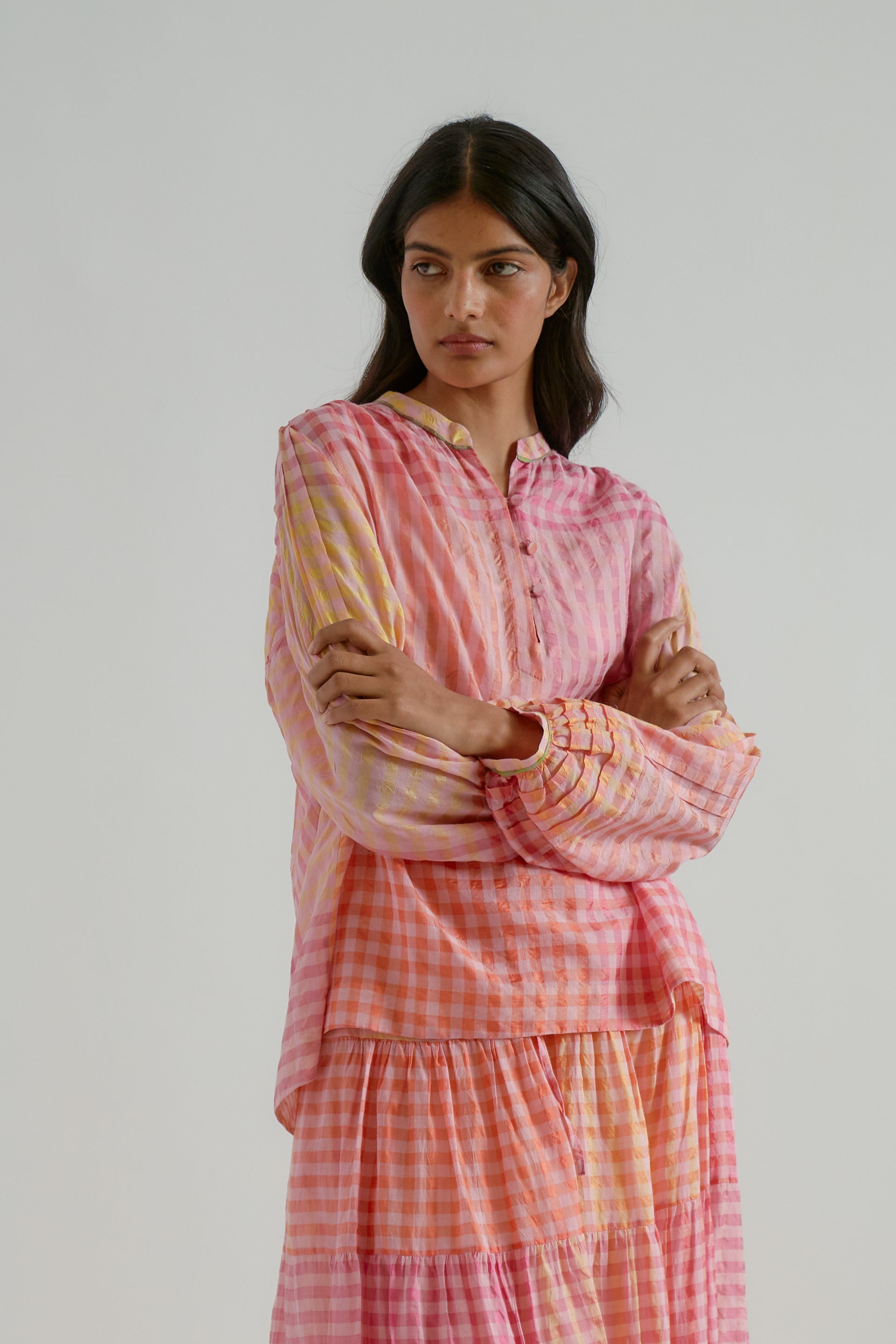 Front-open stand collar top with puff sleeves and tuck details on the sleeves. Comes along with a maxi-length tiered skirt with gathers and selvedge detail on hem. Constructed in multicolor checkered cotton silk blend fabric