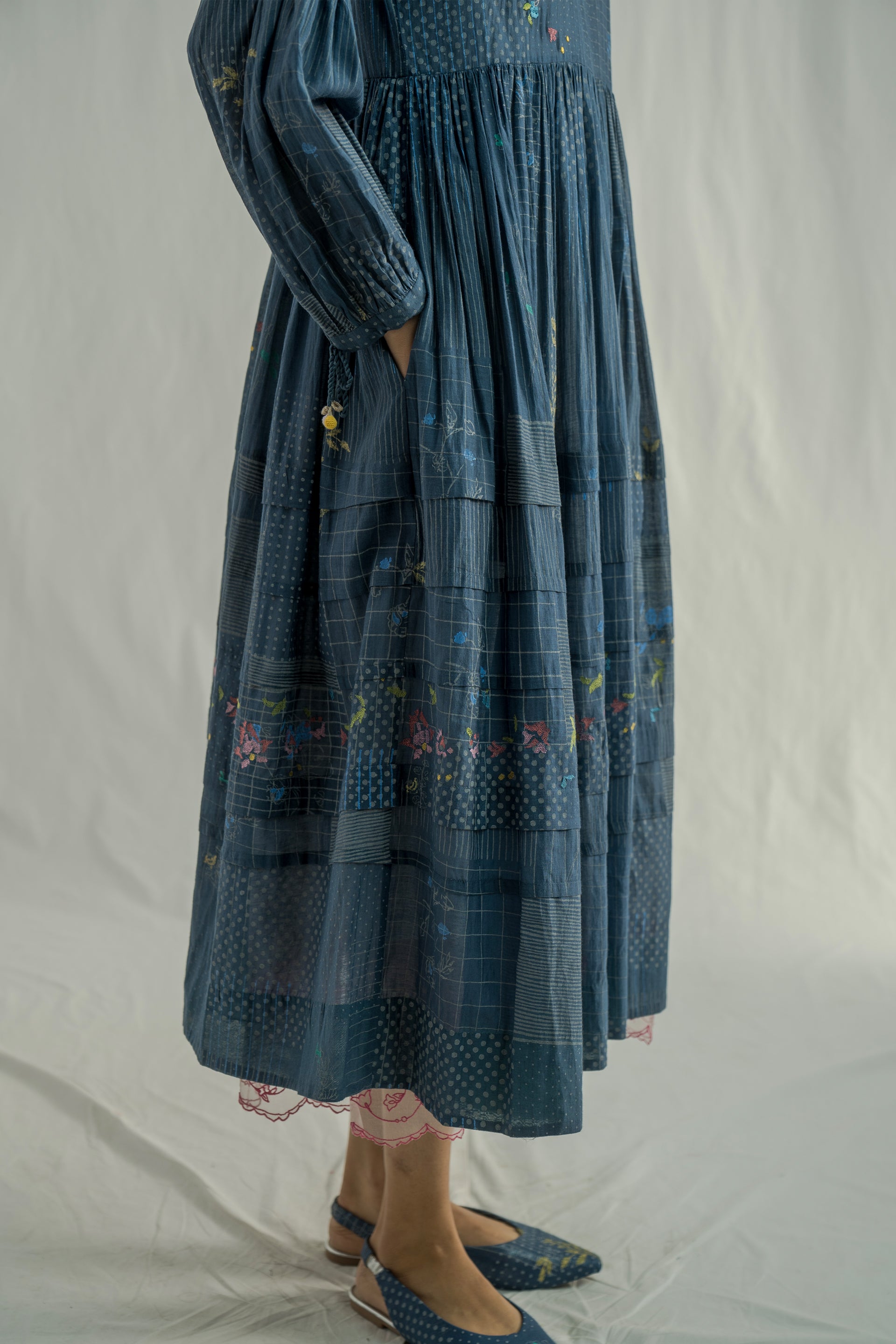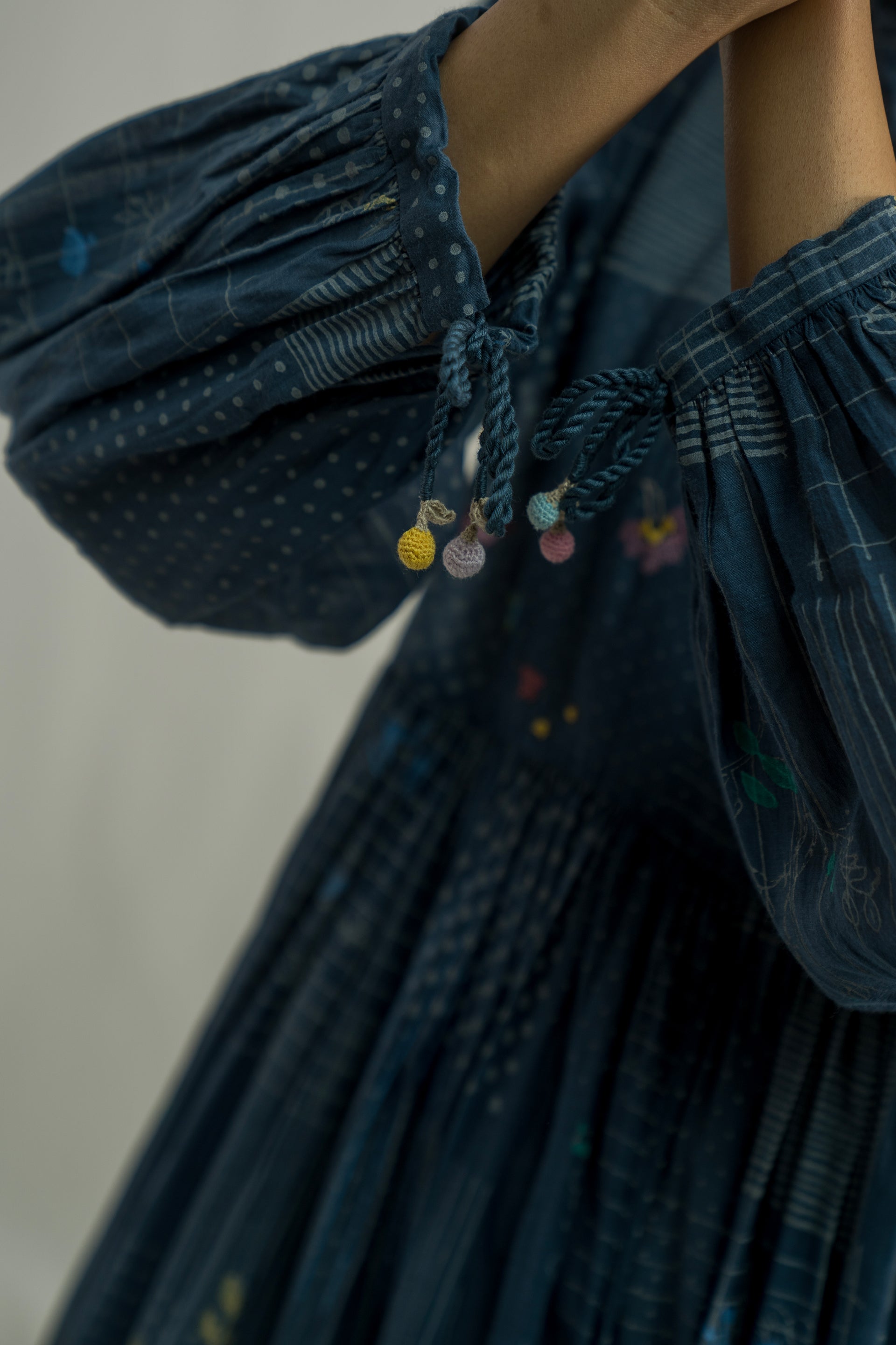 A round neckline midi dress with full puff sleeves, featuring gathers at the waistline, tuck detailing on the hem, frill accents on the neckline, and tie details on the sleeve cuffs. Crafted from a cotton-silk blend fabric, it showcases a unique collage of handblock print, enhanced by scattered multicolor floral embroidery for a striking, textured look. The combination of multi-technique and multi-color embroidery adds depth and dimension to this beautifully detailed piece.