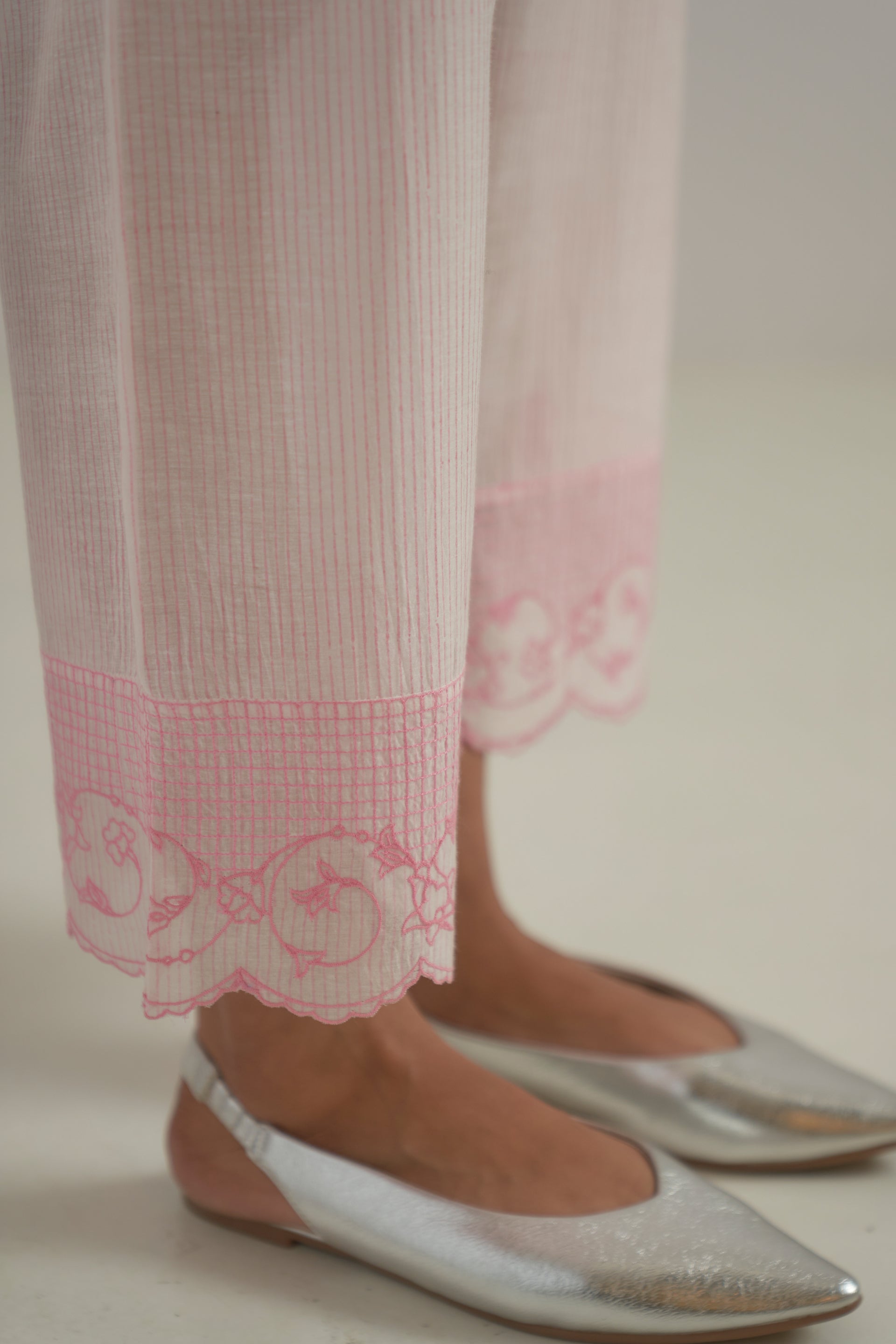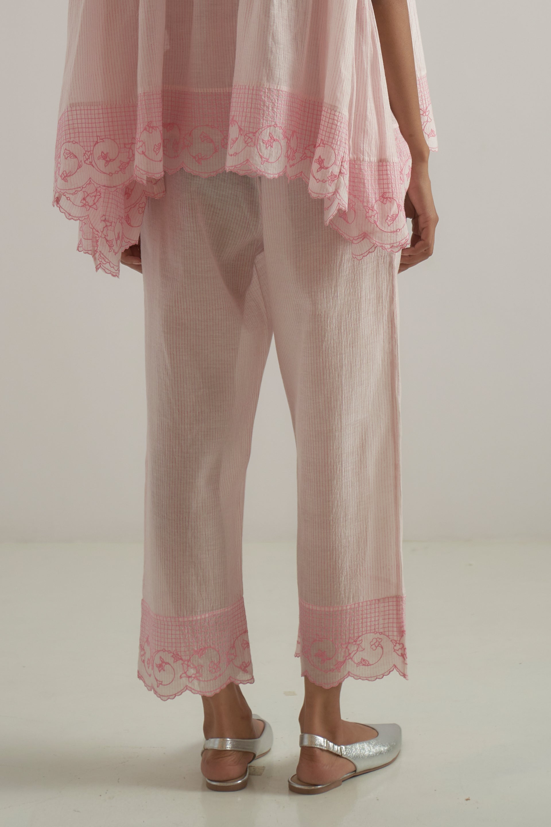 Hand-block printed fine pink striped base straight-fit pants, finished with embroidered scallop detailing on the hem.