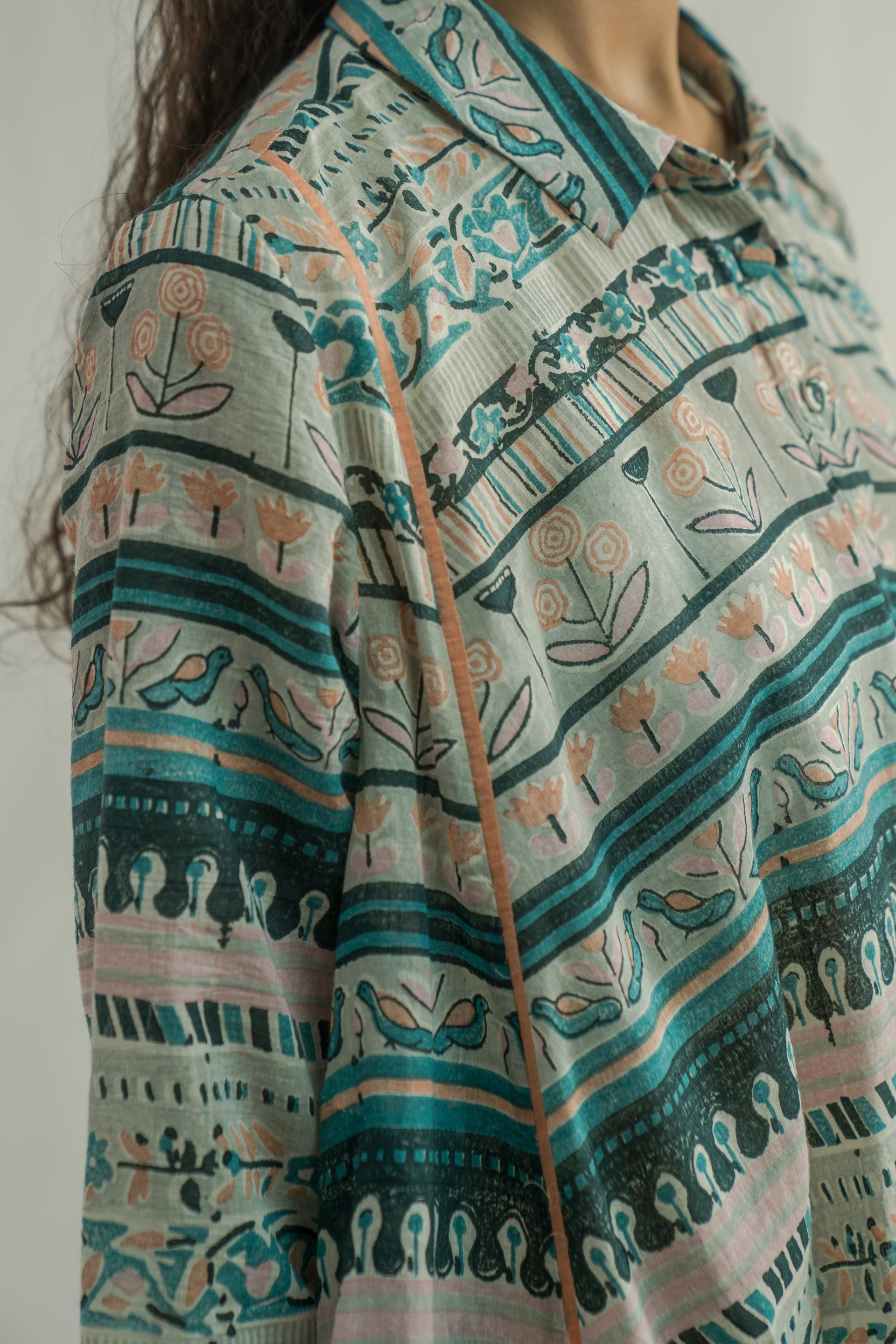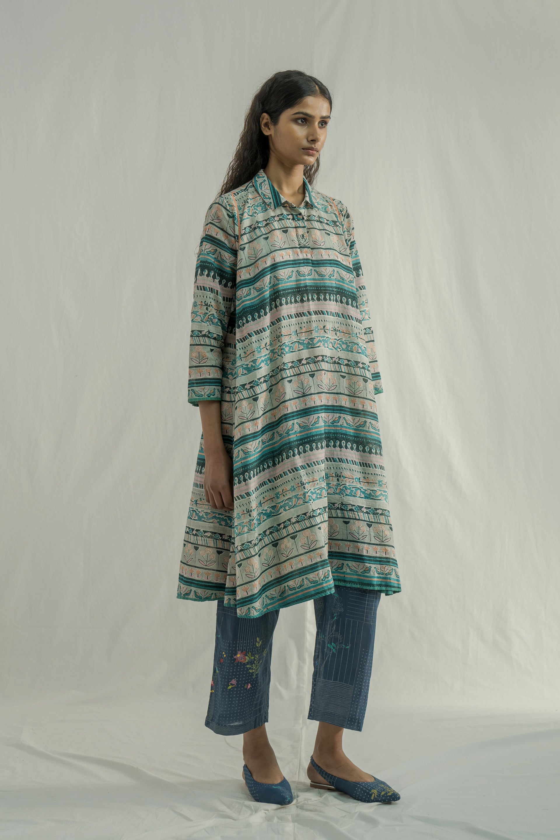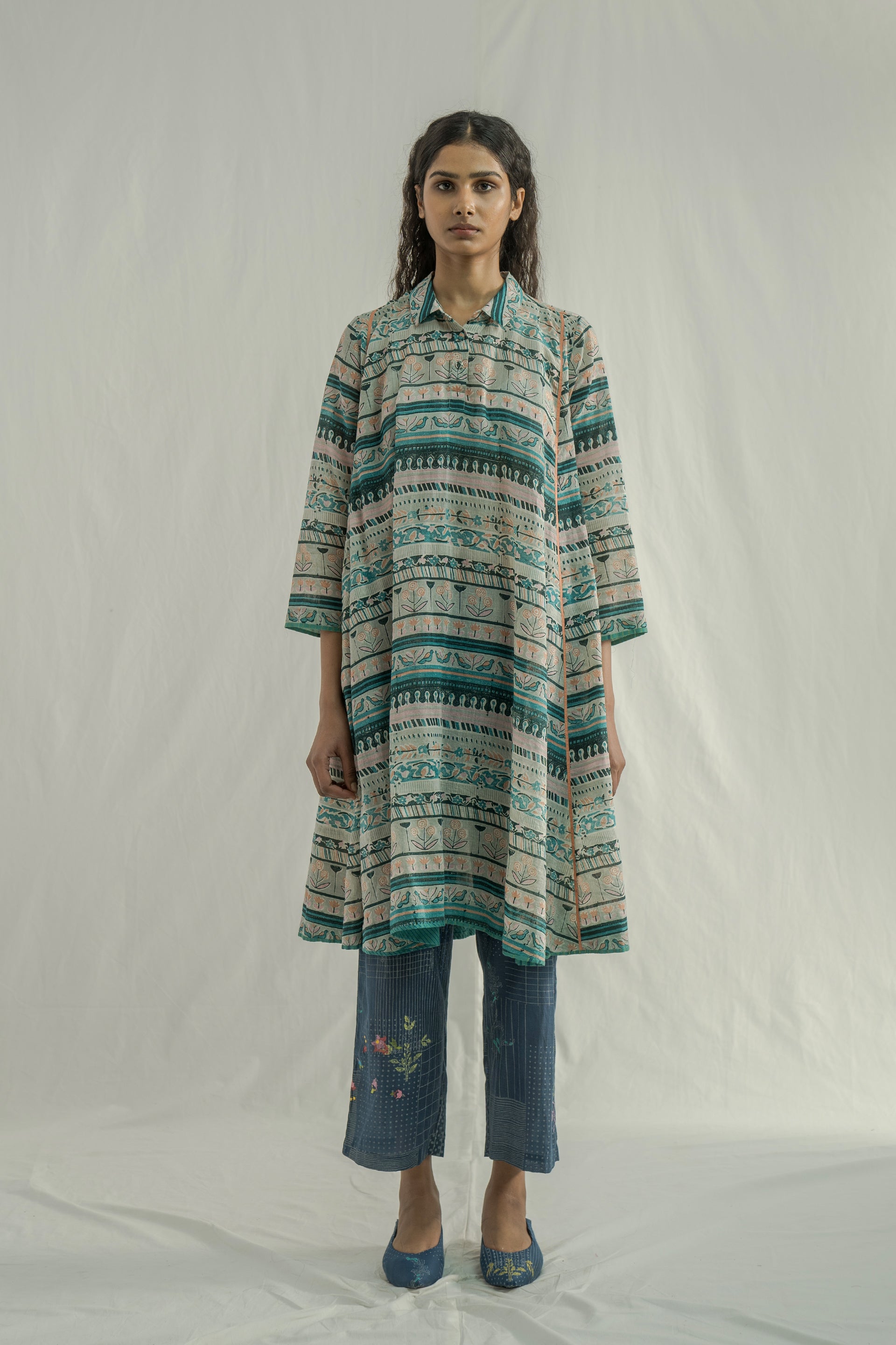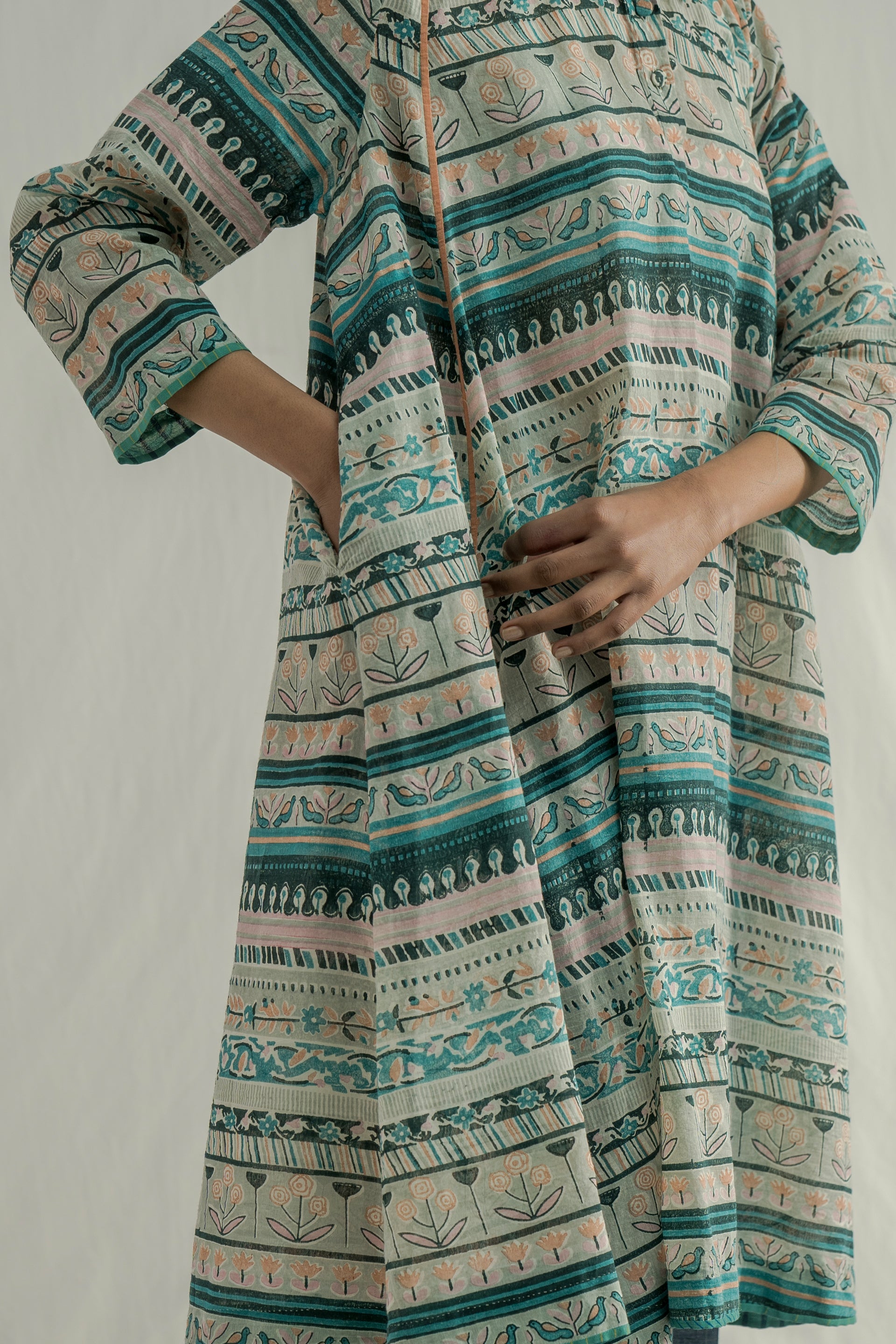 A semi-fitted, panelled flare midi-length dress with a front placket and collar, crafted in a vibrant multicolor all-over panel handblock print. The design features 17 distinct handblocks carefully combined to form a unique, panelled pattern. Finished with contrast color binding along the seams.