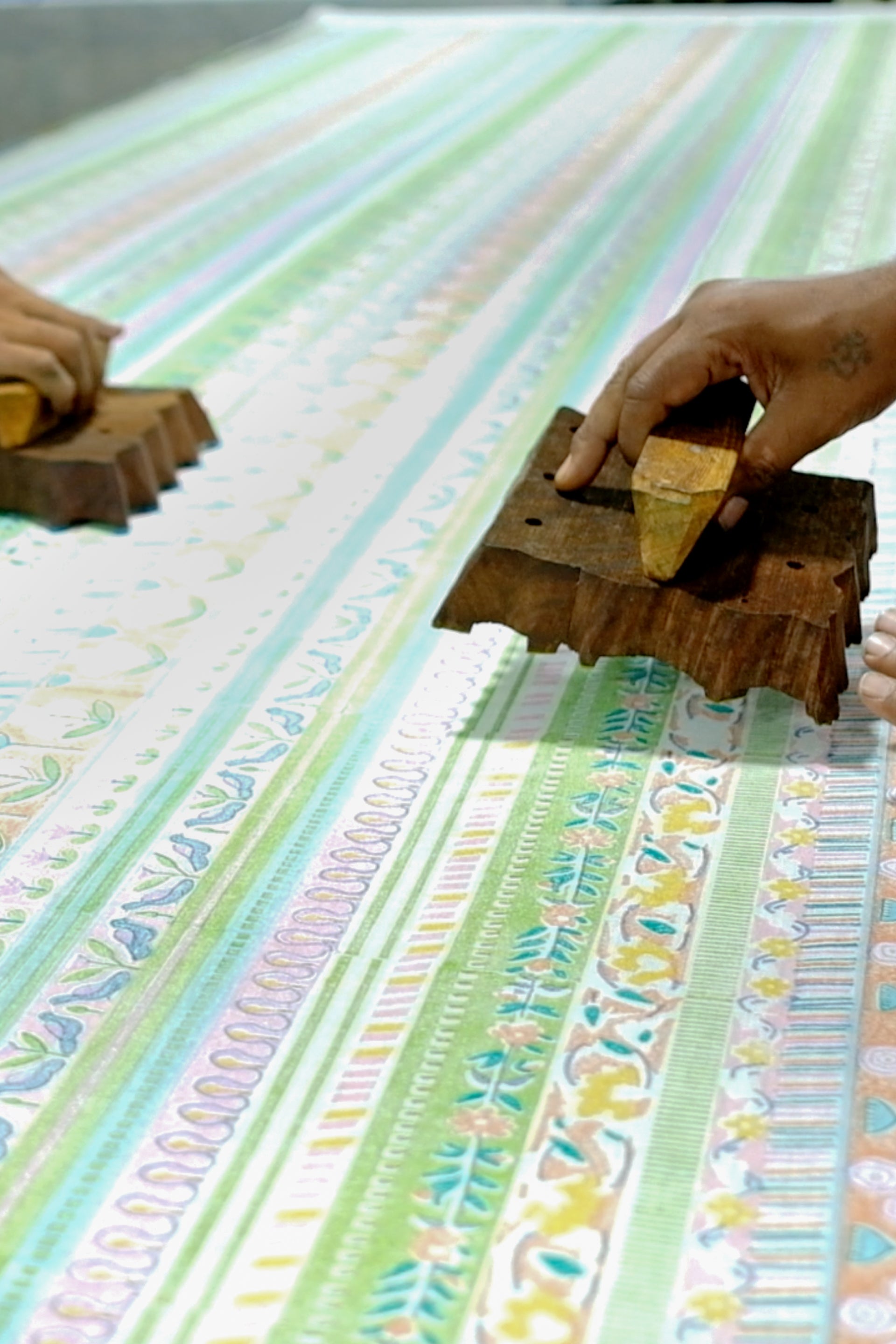 A long, straight jacket with a notch collar, crafted from 100% linen fabric. The piece features a vibrant multicolor handblock print, where 17 distinct handblocks are carefully combined to form a unique, panelled design.