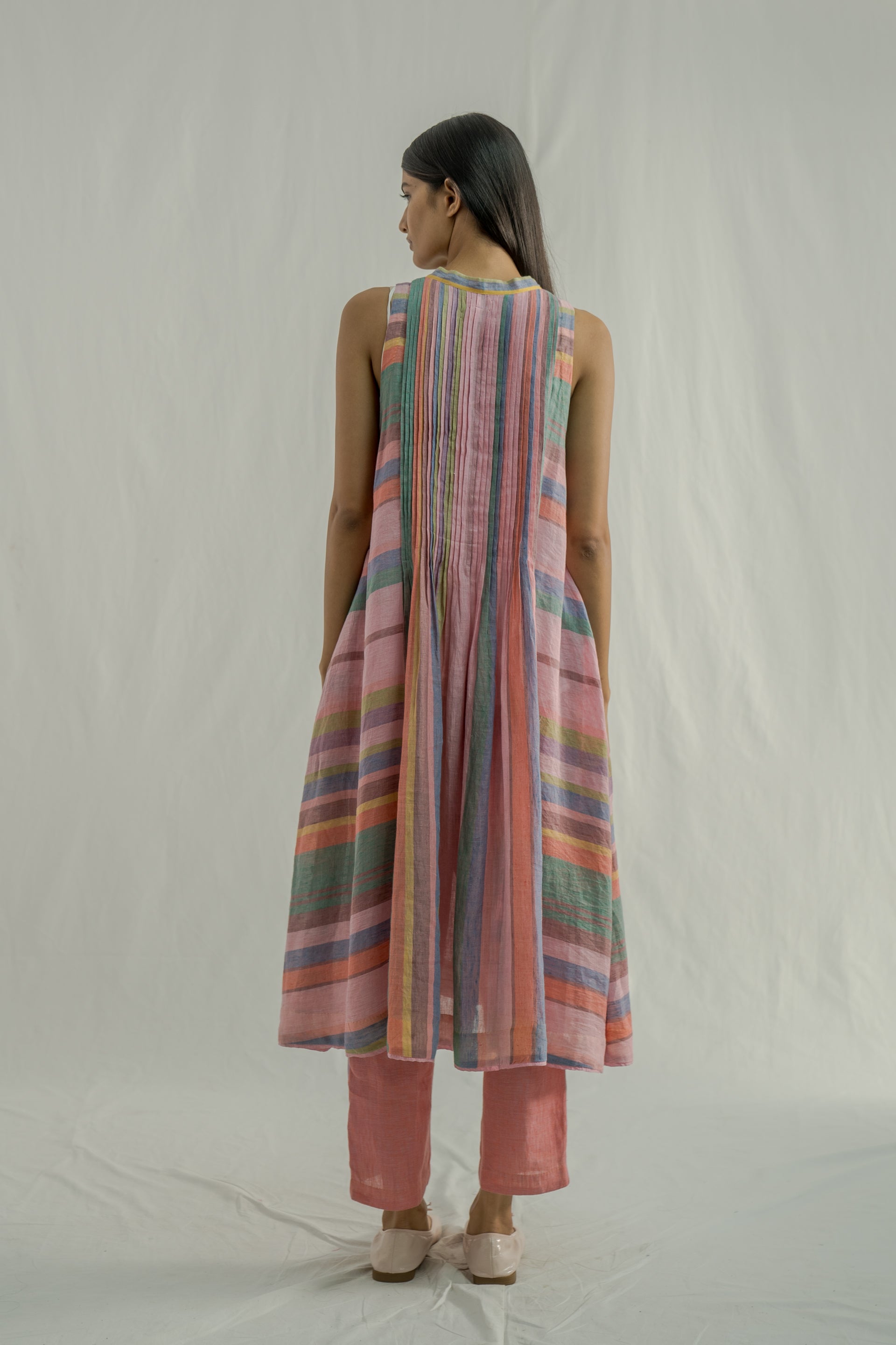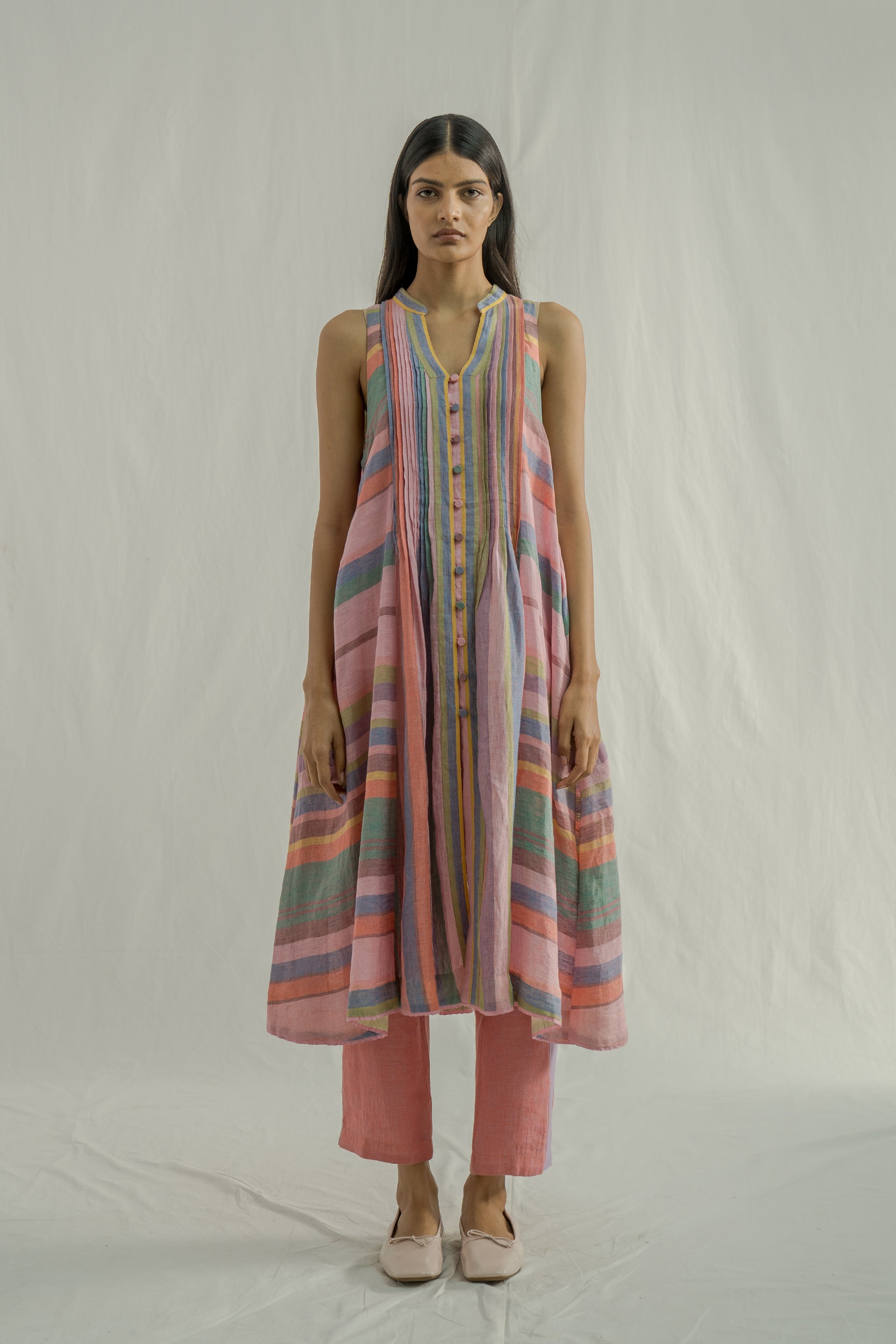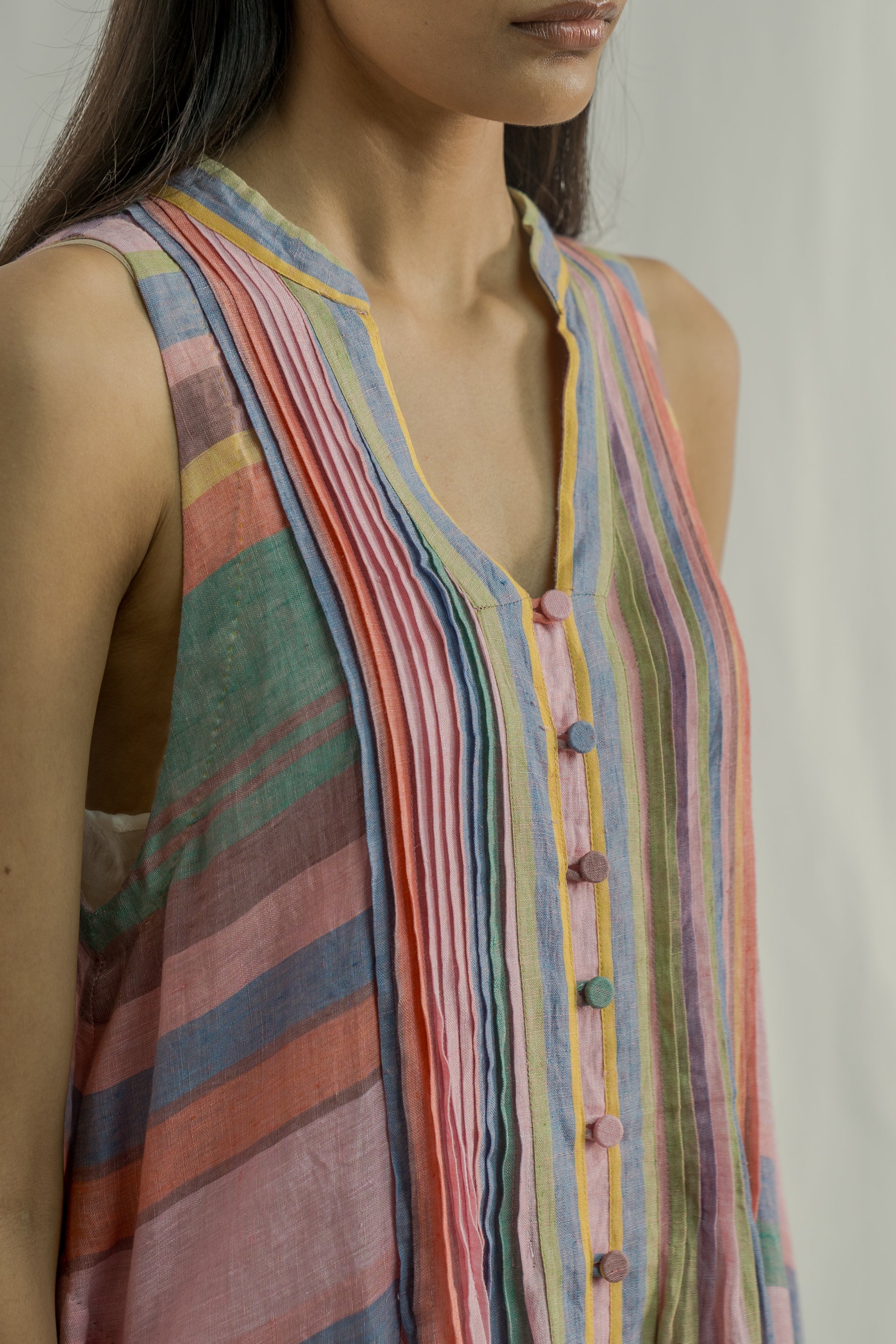 Front-open button-down sleeveless midi dress with a collar, pintuck detailing on the bodice, and contrast selvedge detail on the placket. Crafted from multicolor striped 100% linen fabric