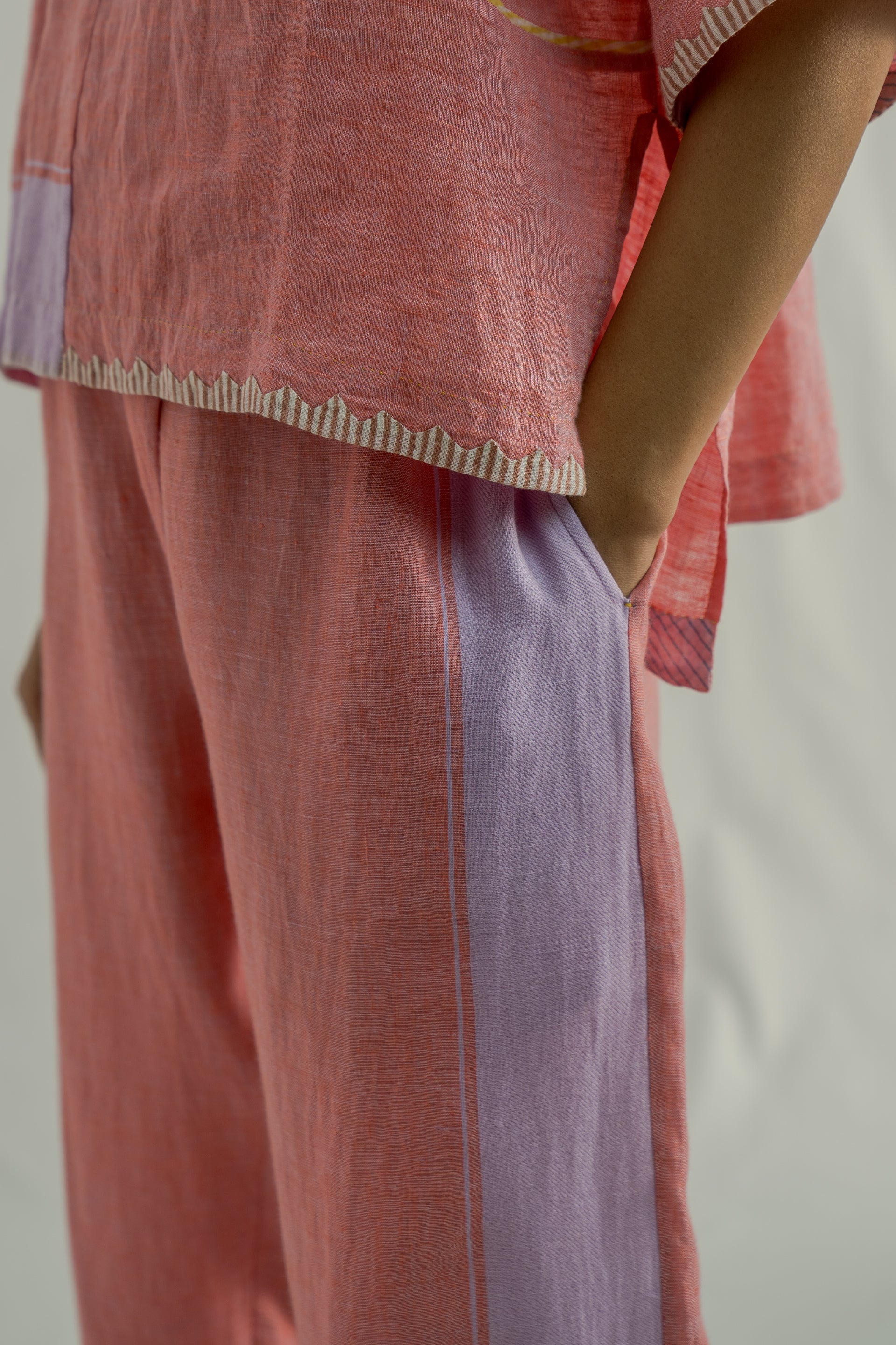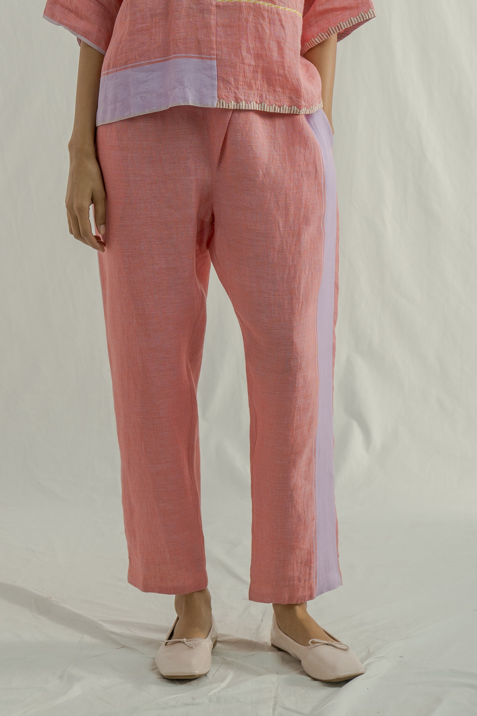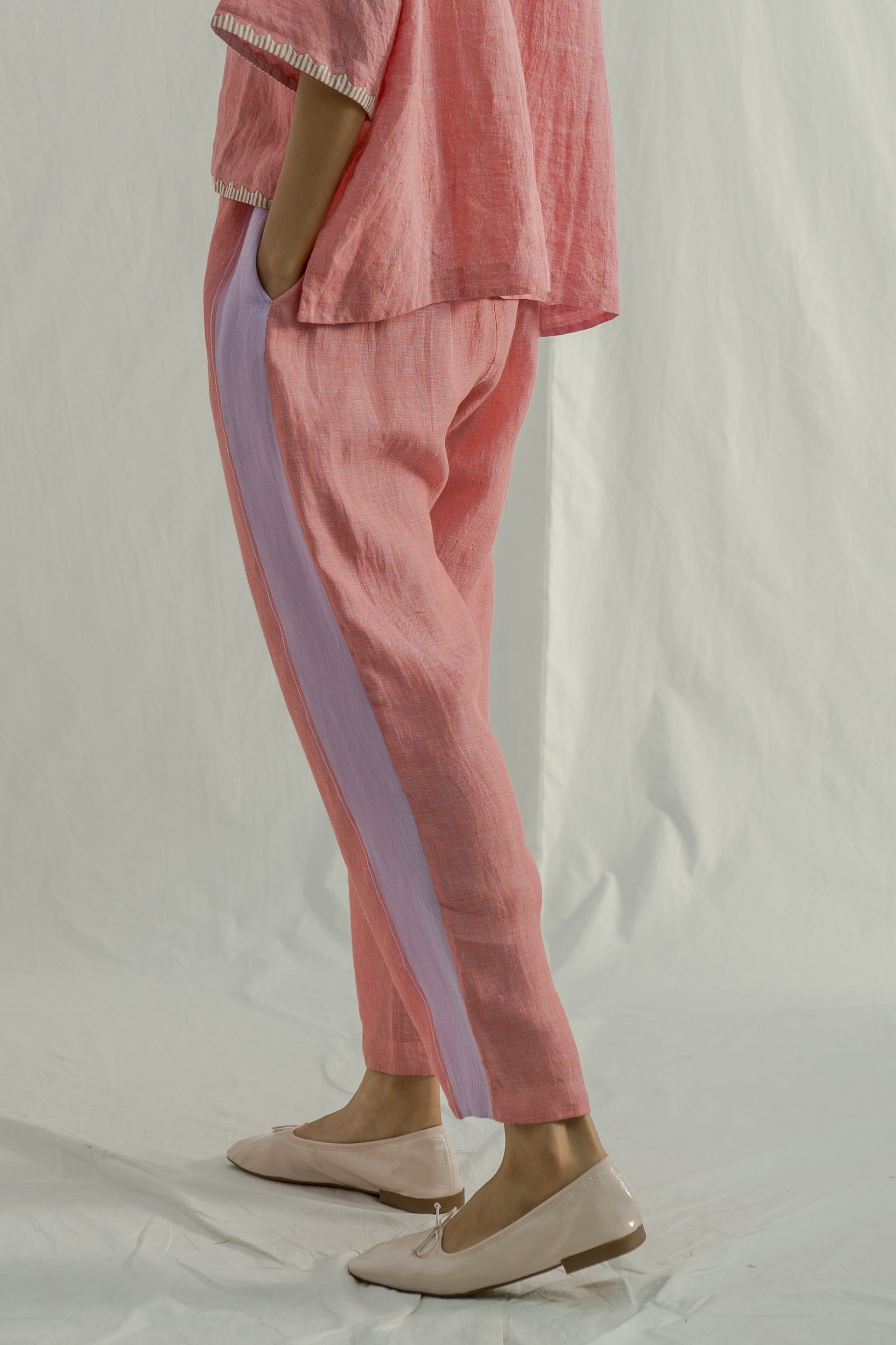 Tapered fit mid rise trouser with contrast selvedge and border detail on the seams. Constructed in solid with border 100% linen fabric.