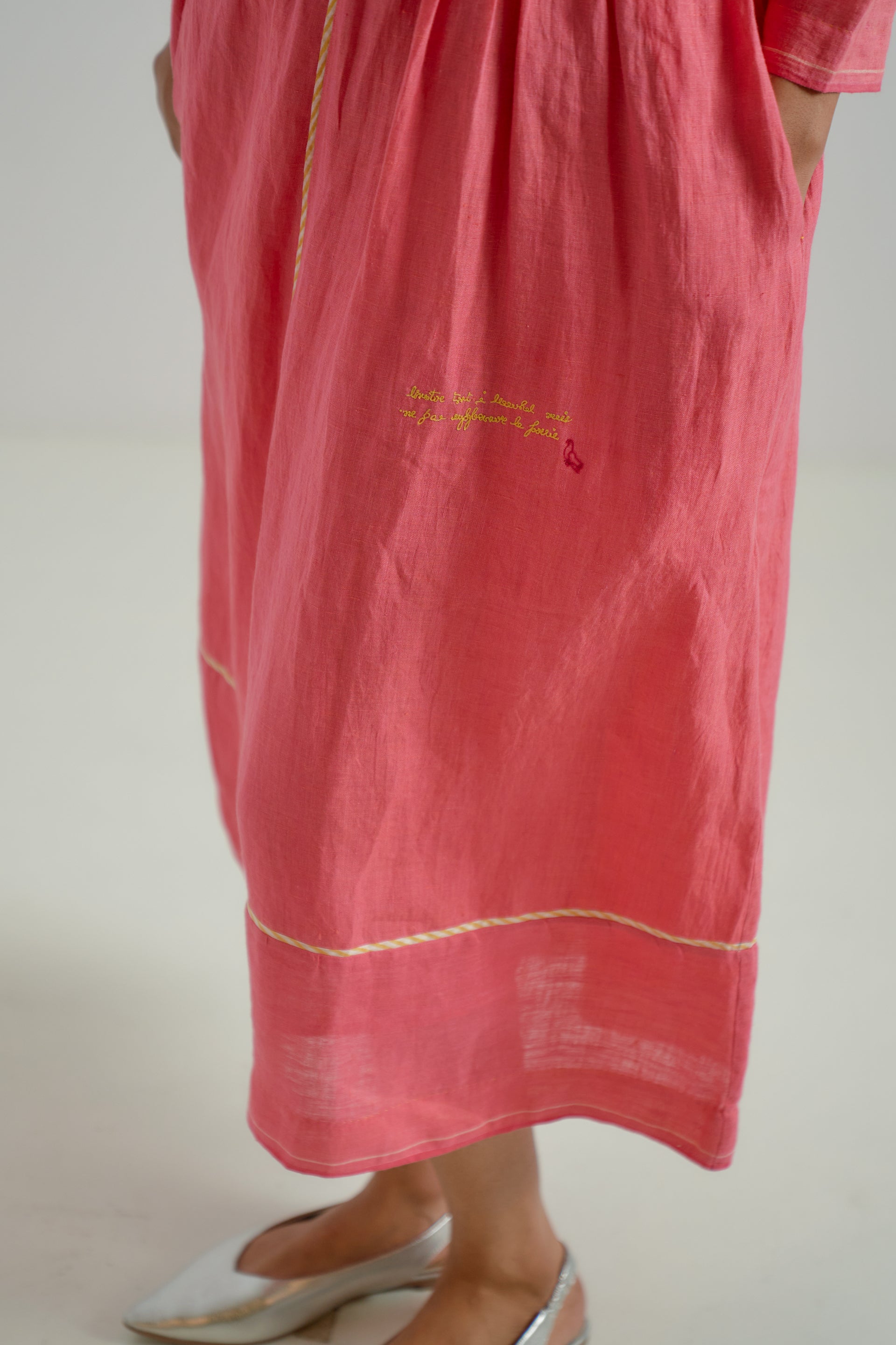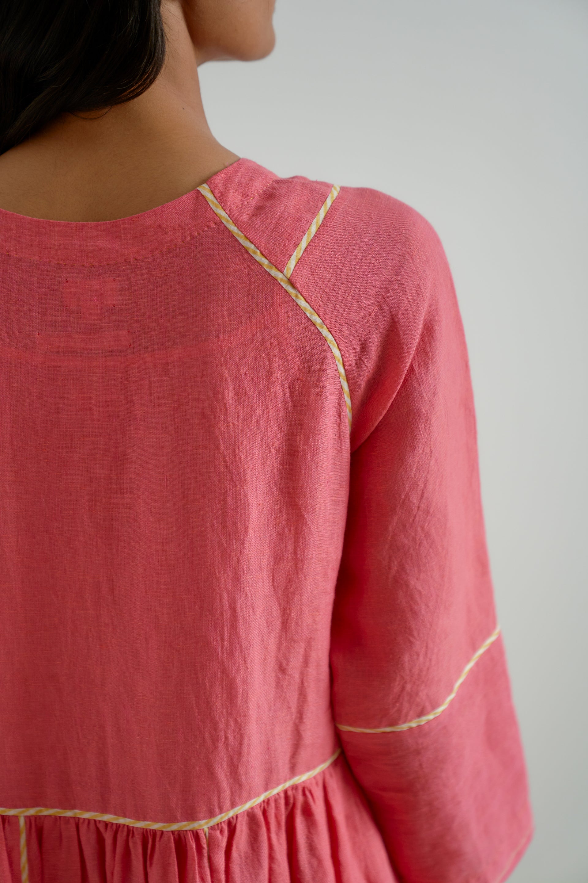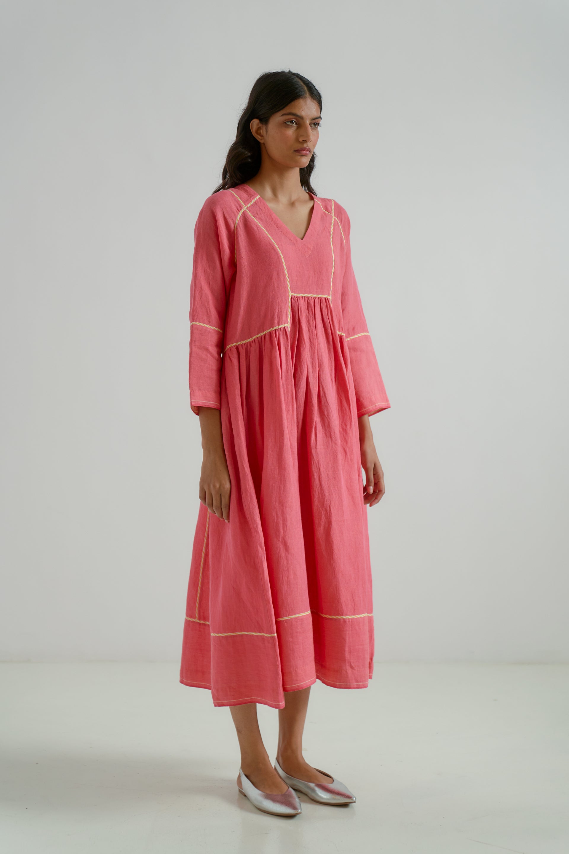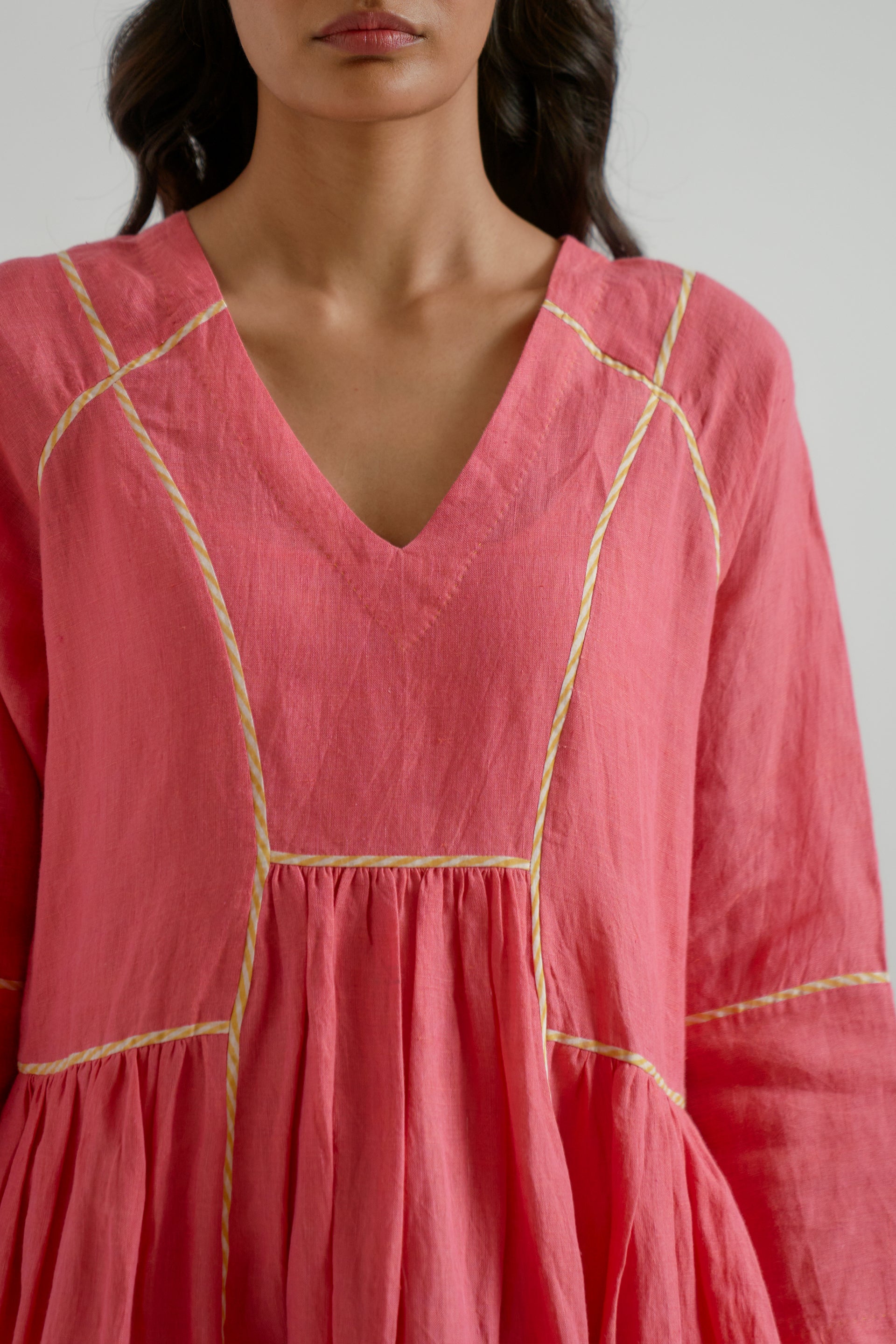 A V-neck patchwork midi dress with gathers around the waist , featuring contrast striped handblock-printed piping along the seams. Crafted from 100% solid linen fabric.