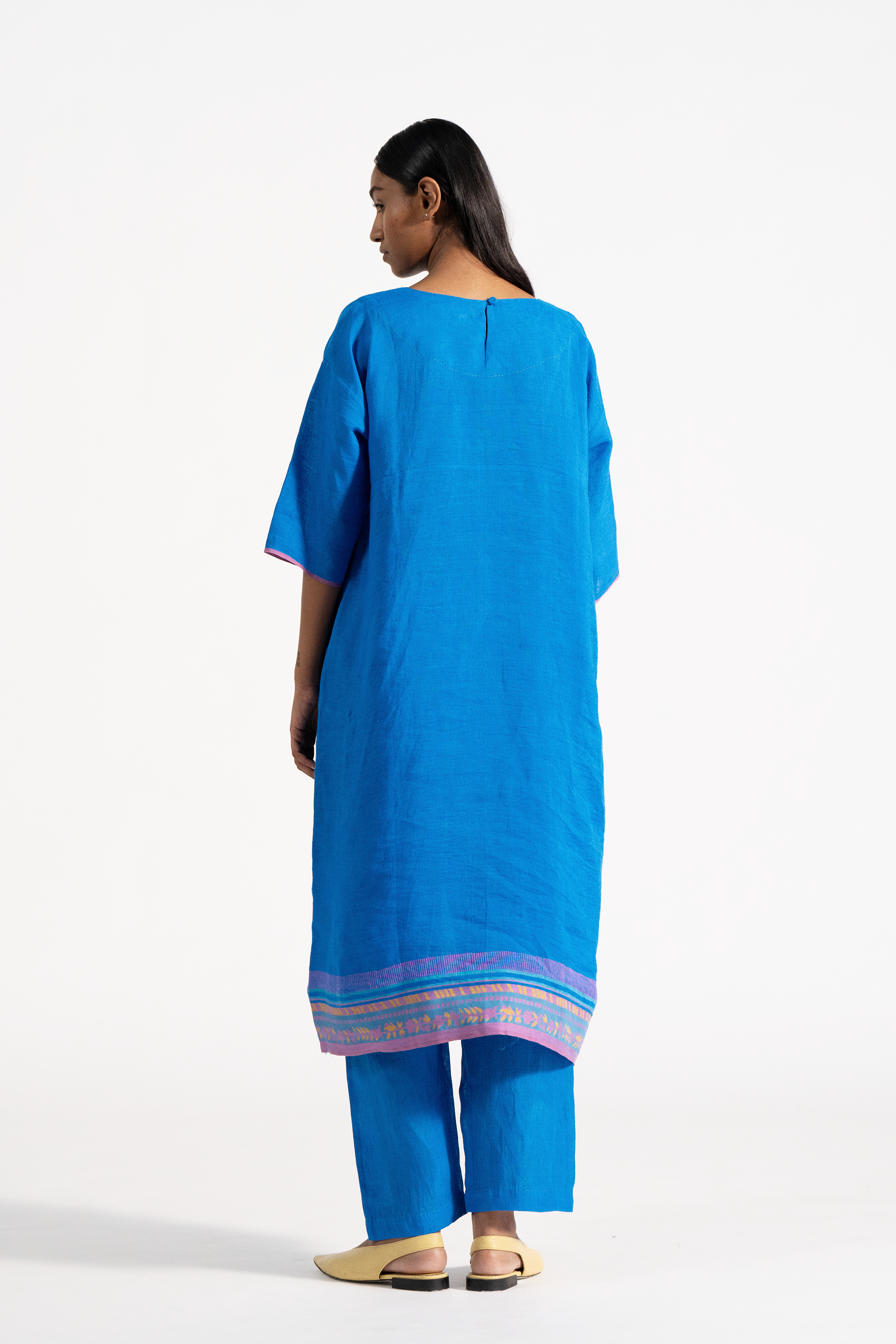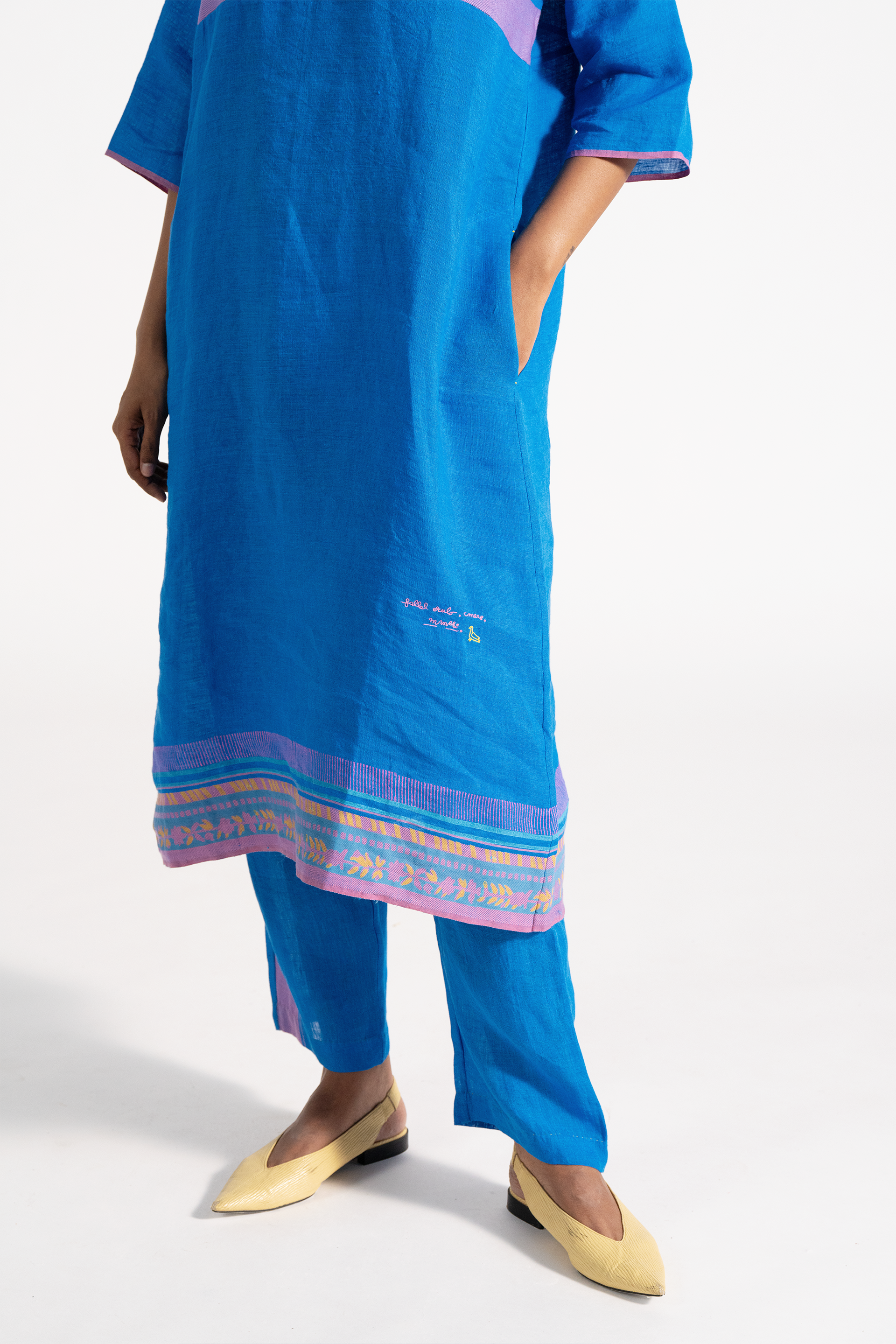 Vibrant blue relaxed fit tunic dress in 100% linen with multicolor handblock print bordered and text print hand embroidery on the side.