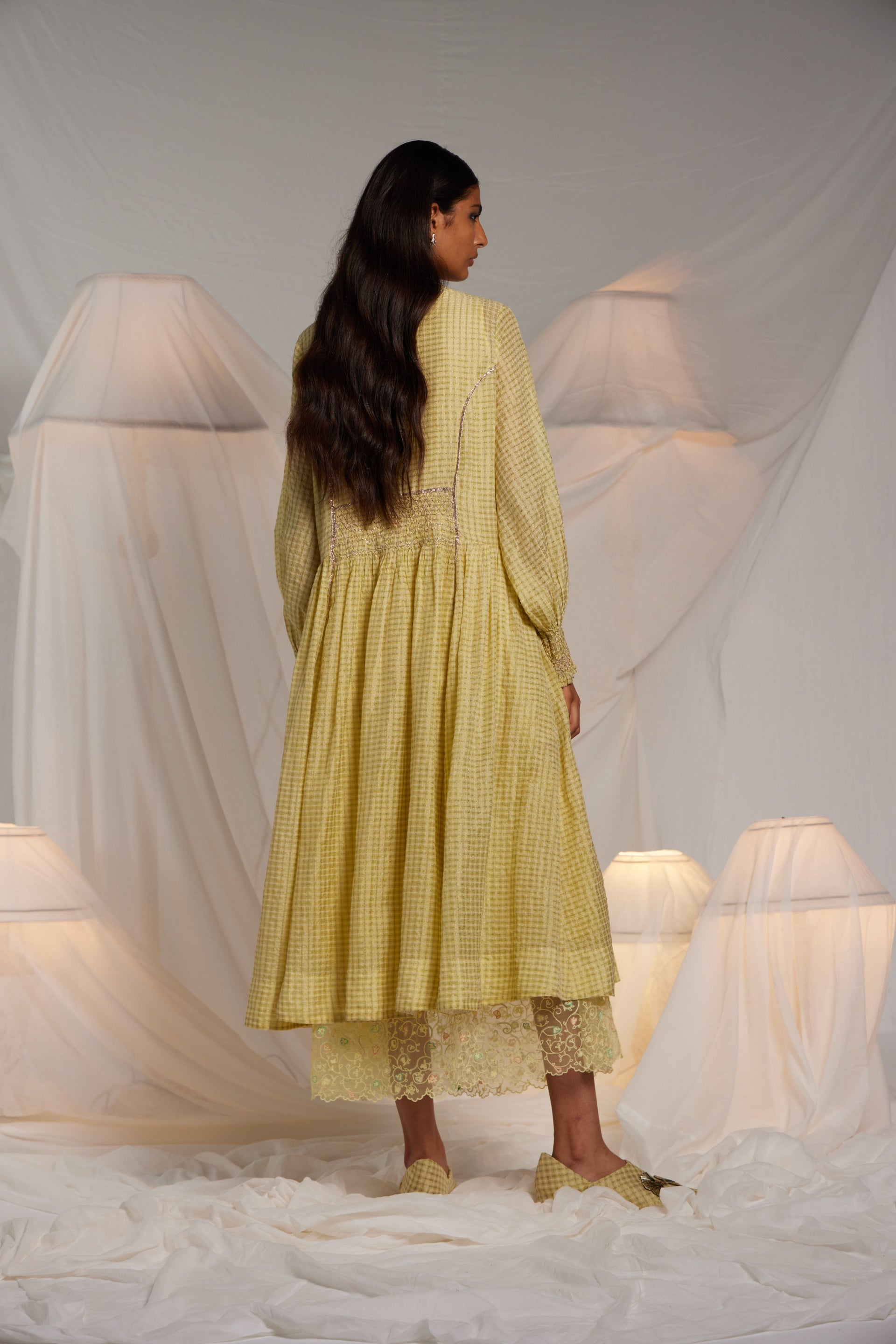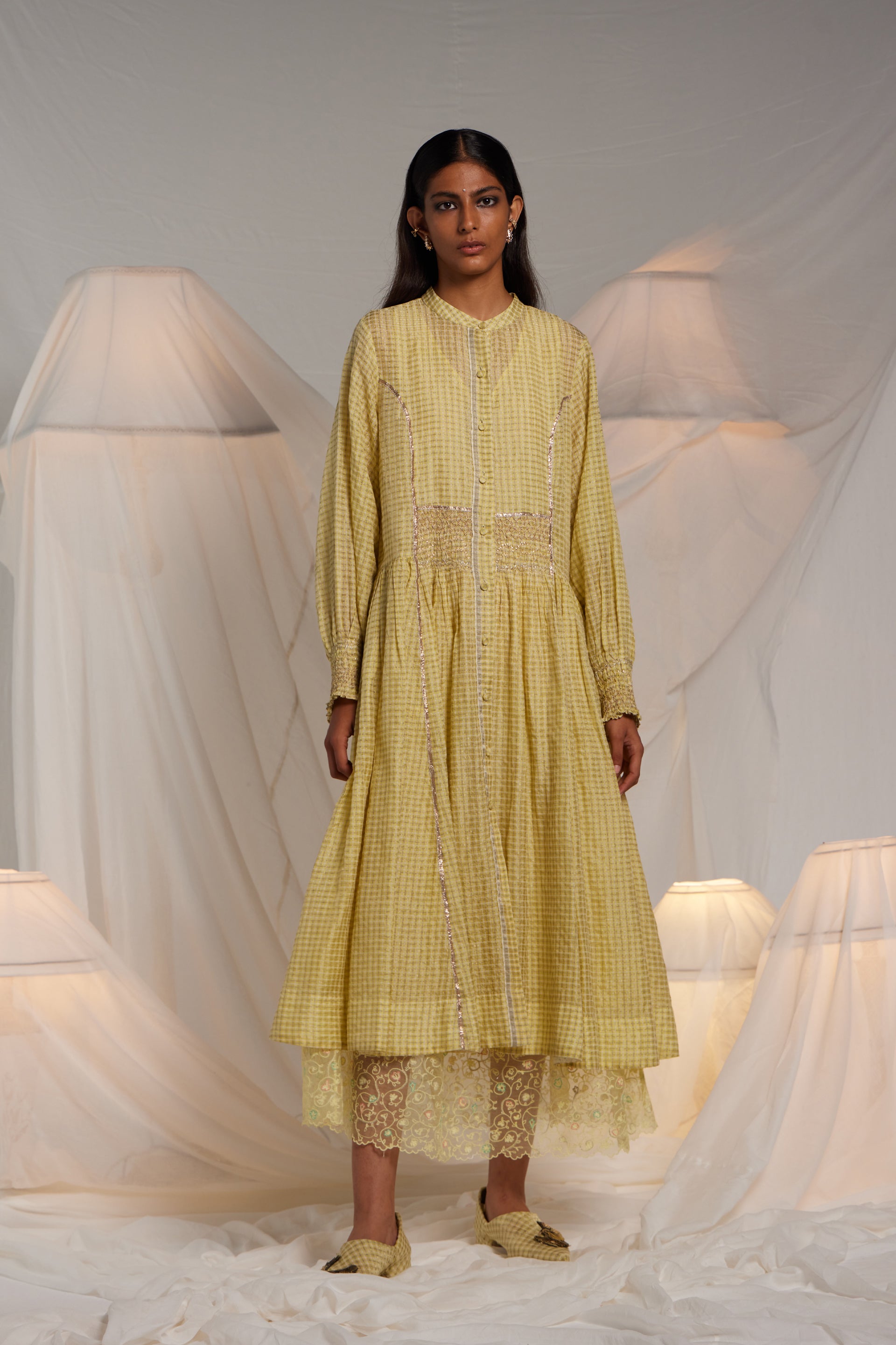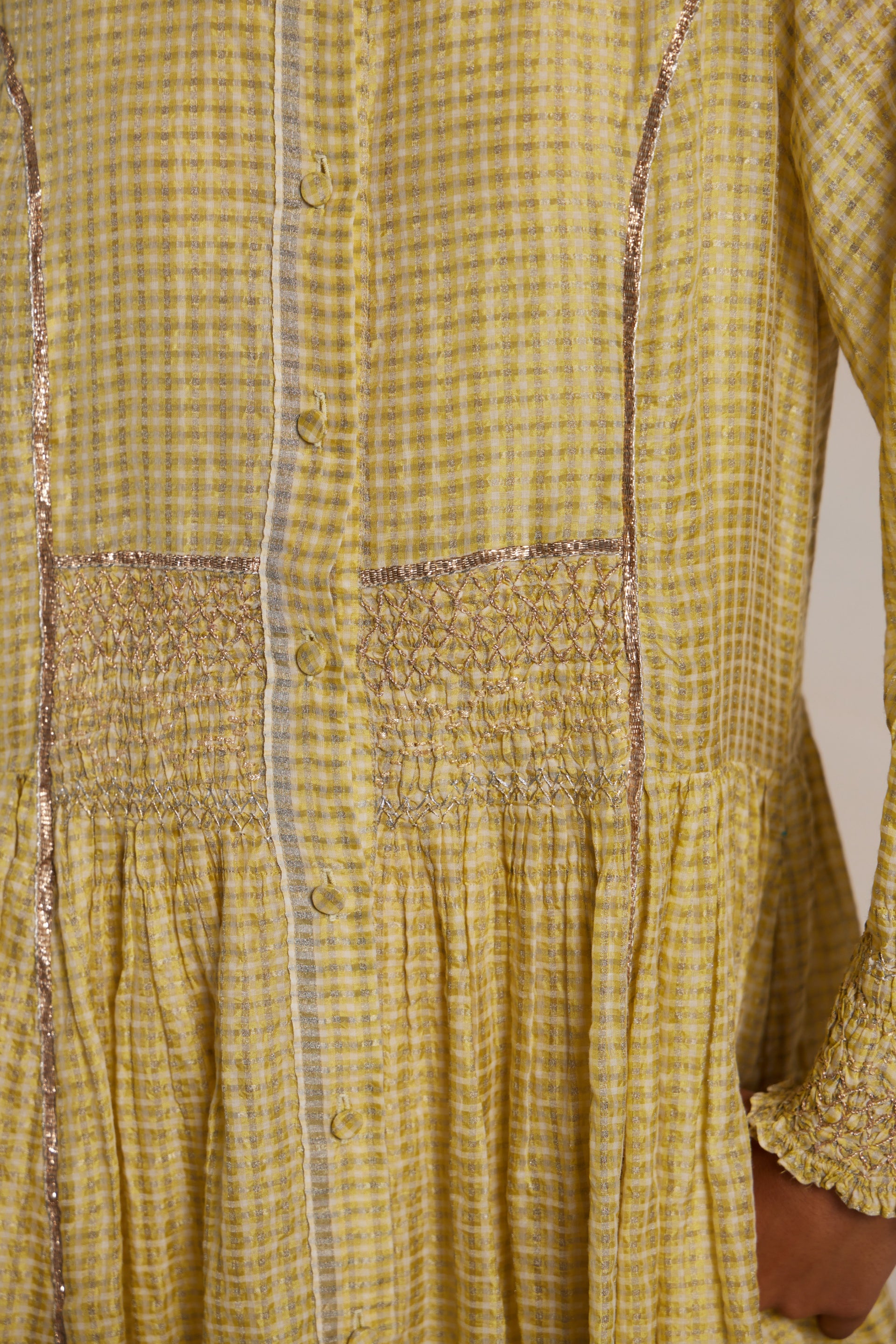 Semi fitted flare midi length dress button down in cotton silk zari checks with intricate hand smocking detail on the waist and sleeve hems. Metallic gota seam finishes the princess line. Comes along with a separate cotton silk lining with organza trim.
