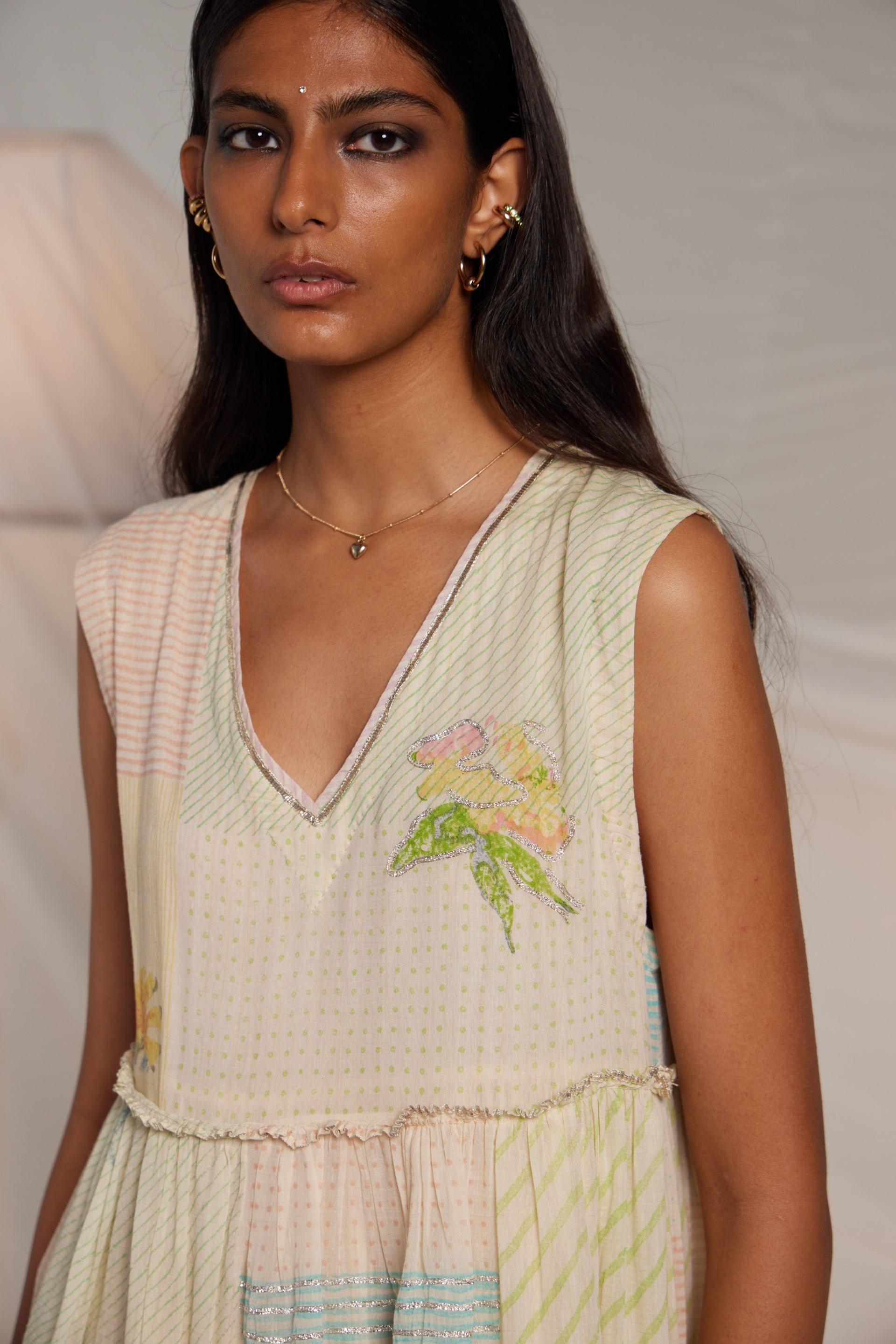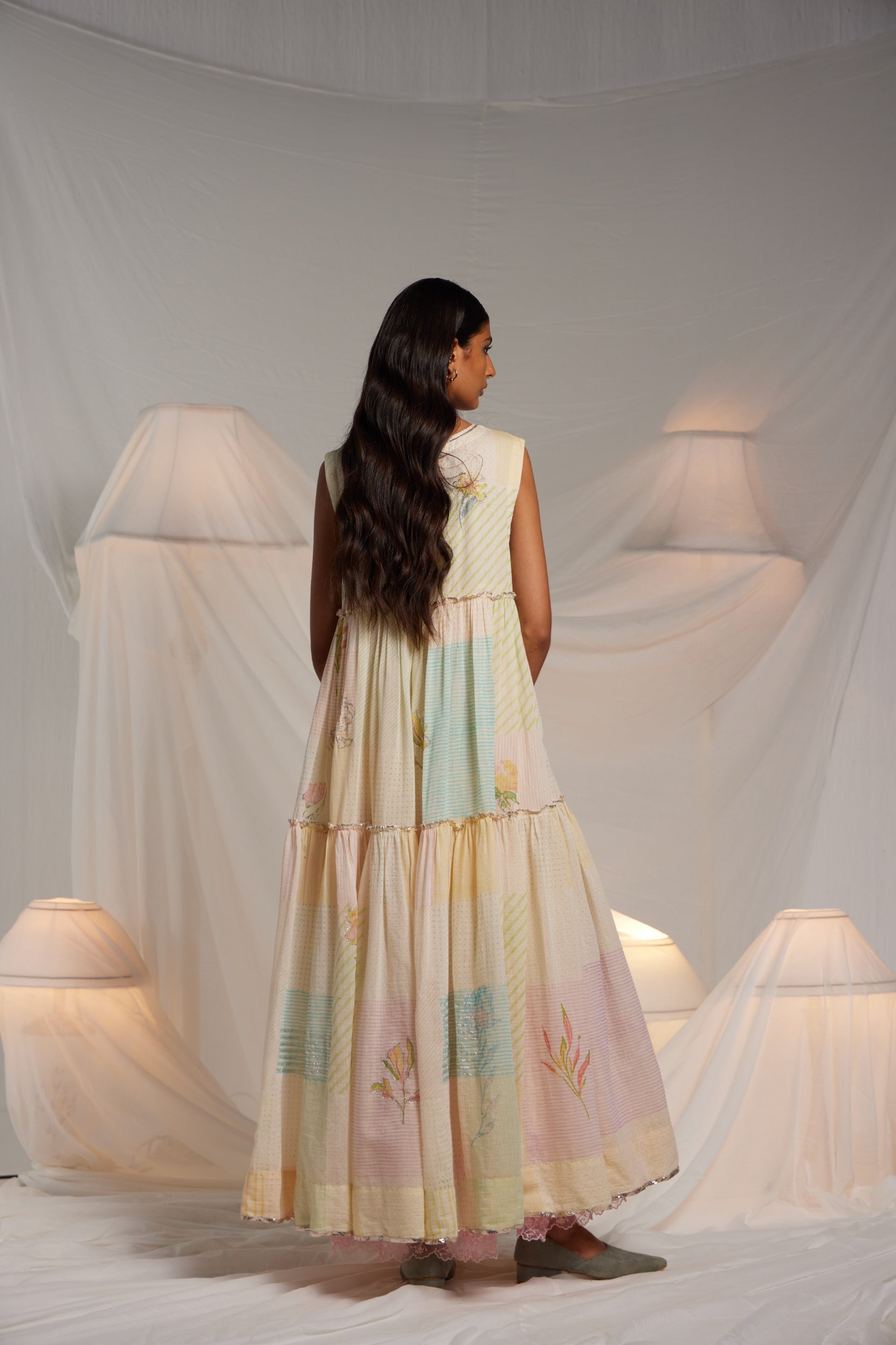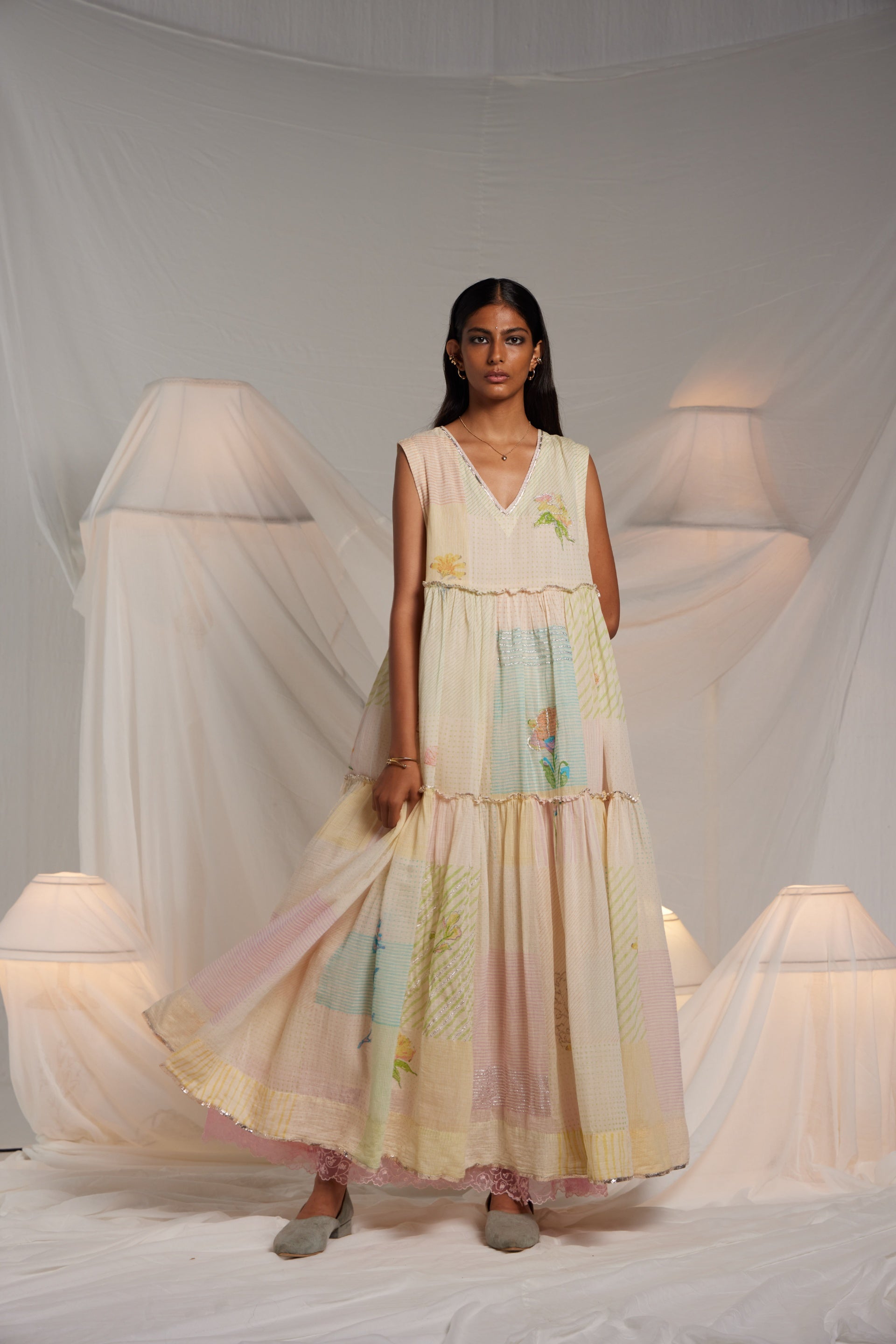 Tiered dress fits away from the body flare midi length dress with all over hand block collage print with multicolor placement floral hand block print pattern finished with gota embroidery highlights. Comes along with an attached printed lining with organza trim.