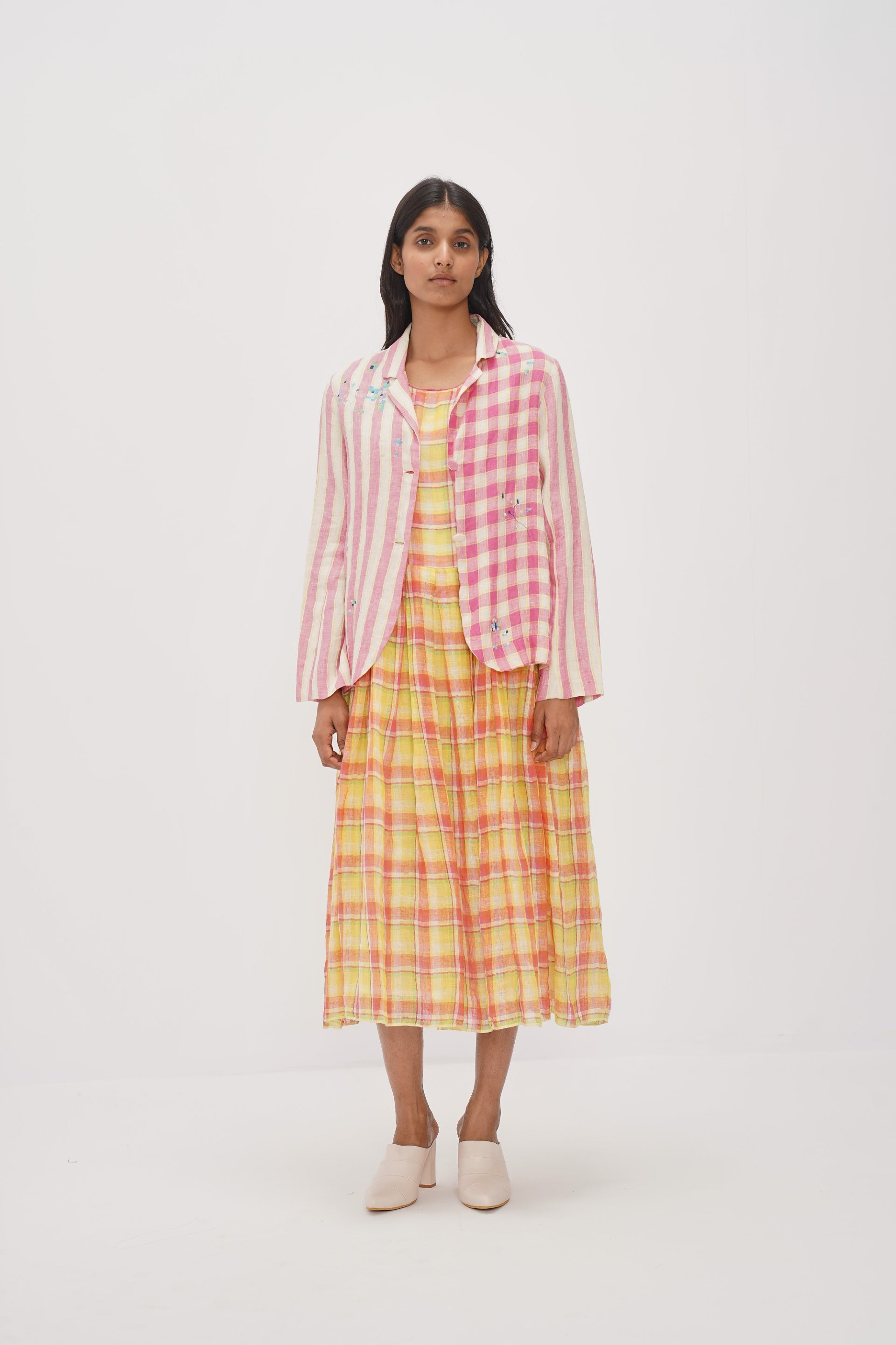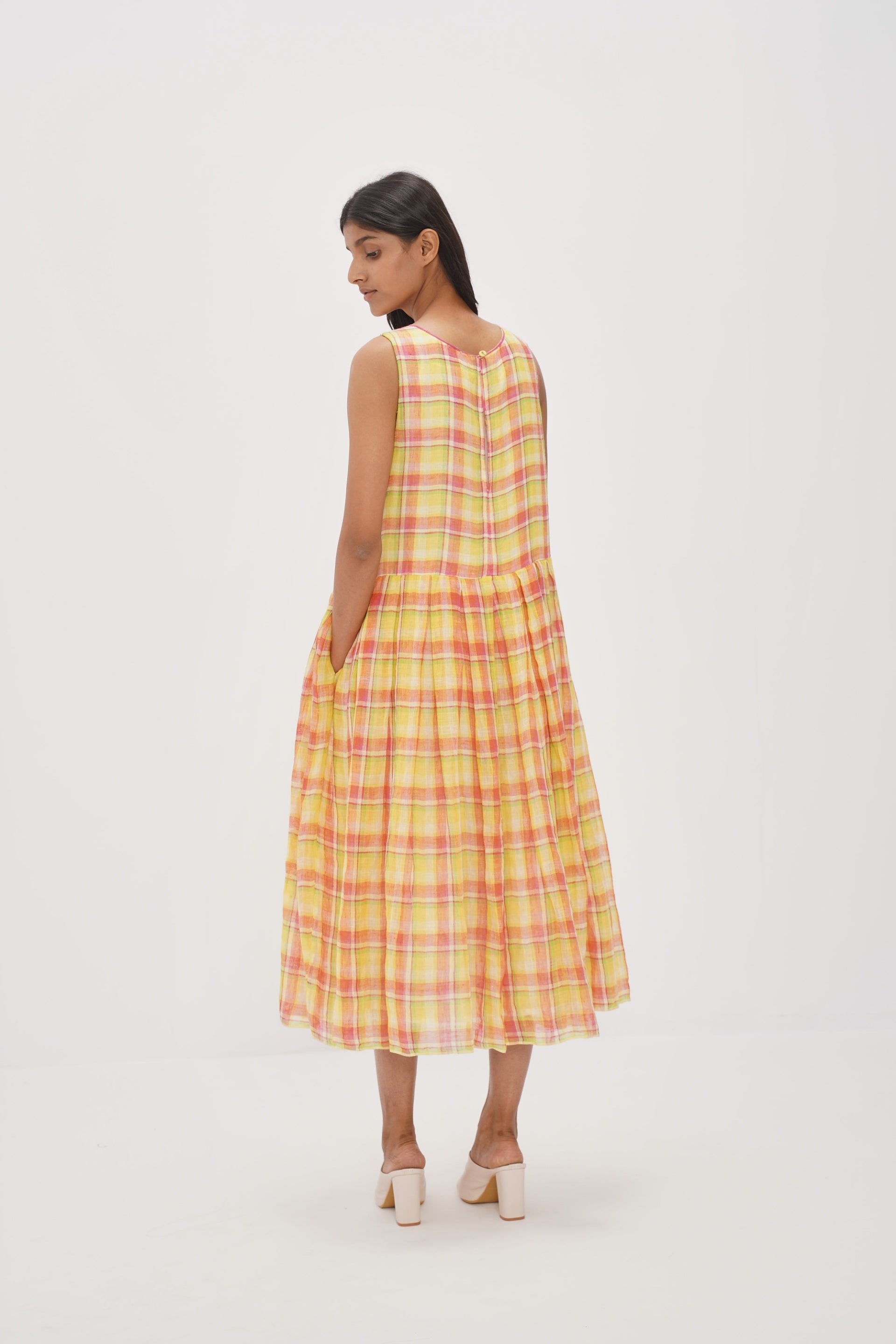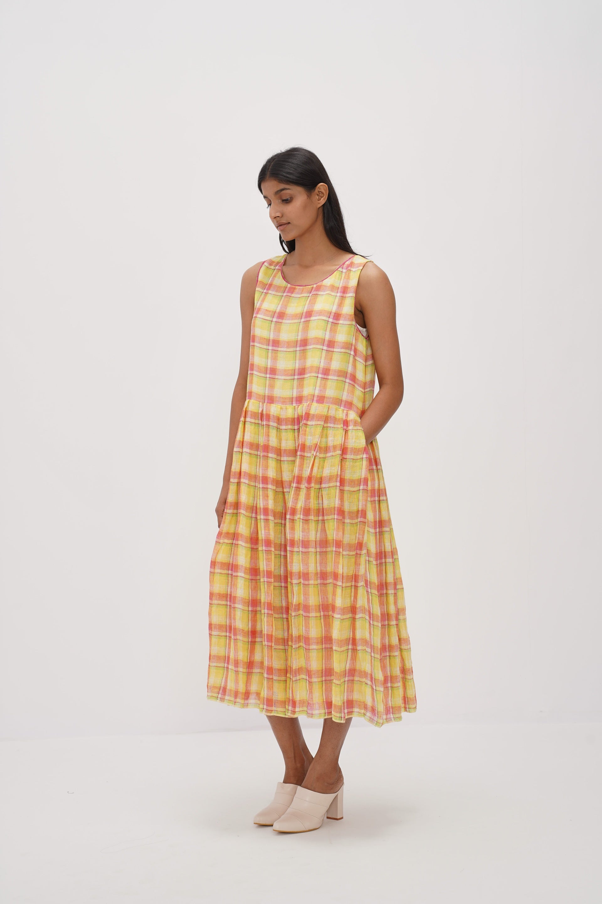 Yellow sleeveless checks dress in 100% linen gauze with contrast selvedge detail. Comes with an attached printed cotton silk lining