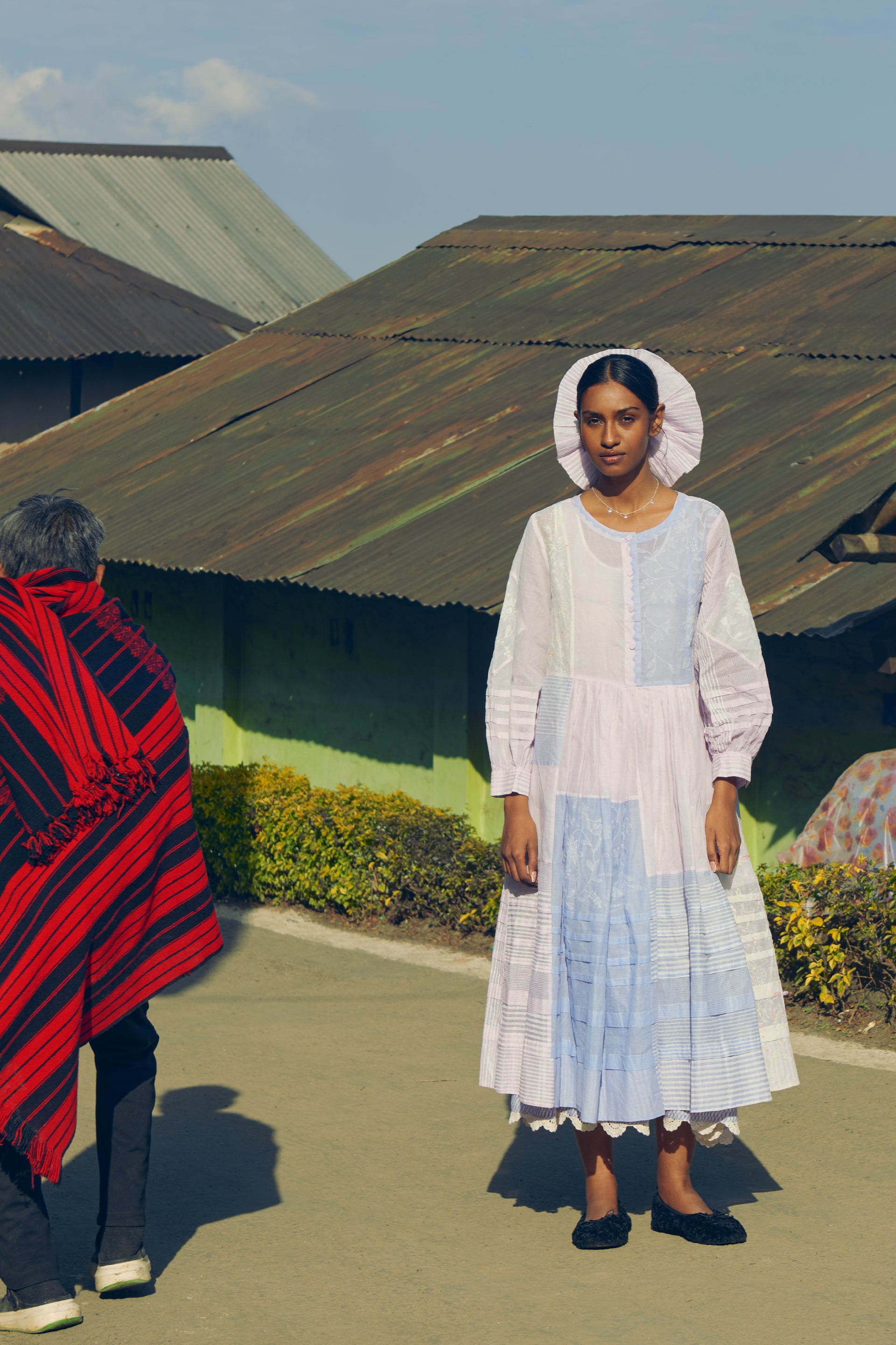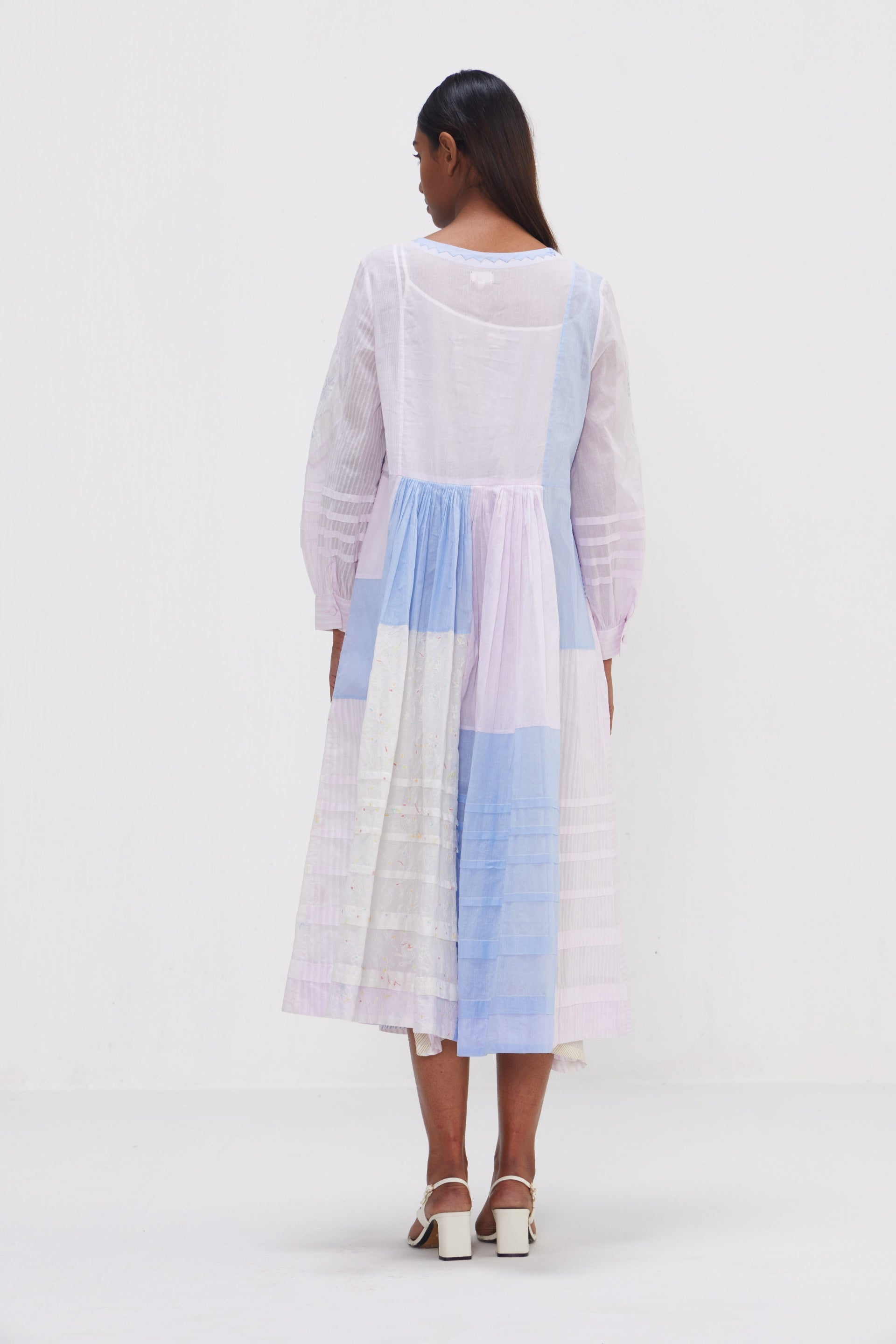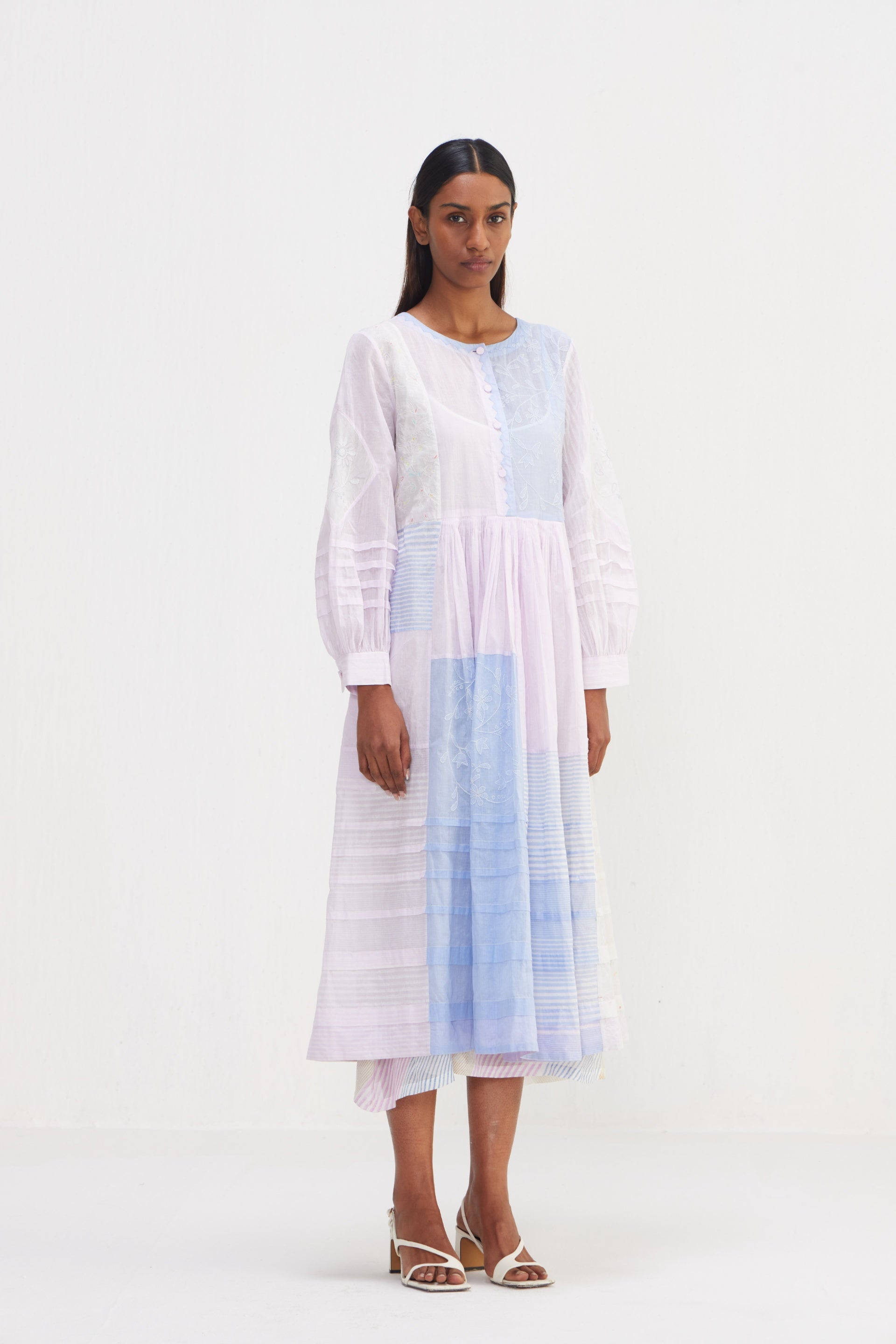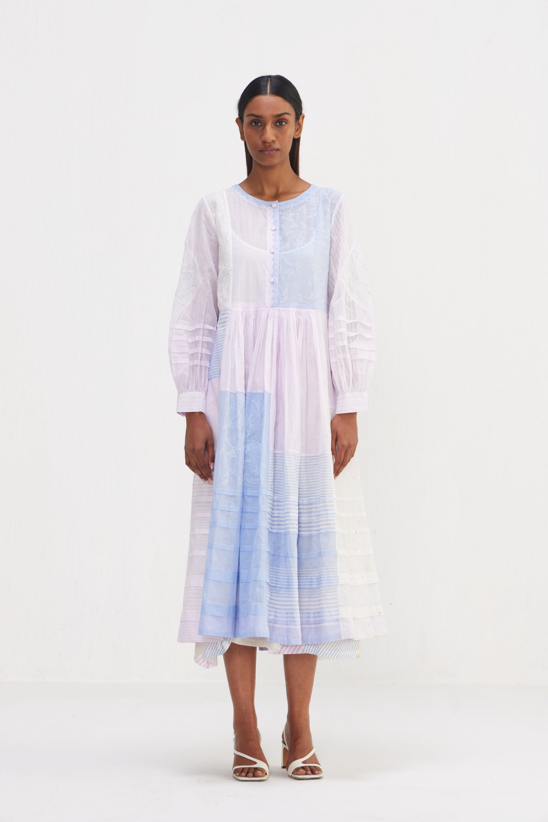 Midi dress in patchwork of floral applique and embroidery, blending various techniques to create a visually stunning piece and hand block striper print comes with lining. The embroidery enhances the appliqué with delicate threadwork adding subtle touches of color and texture, bringing the floral motifs to life. The hand block striper print, created using traditional techniques. Tucks detail on the hem and sleeves, patch works with organdy fabric.