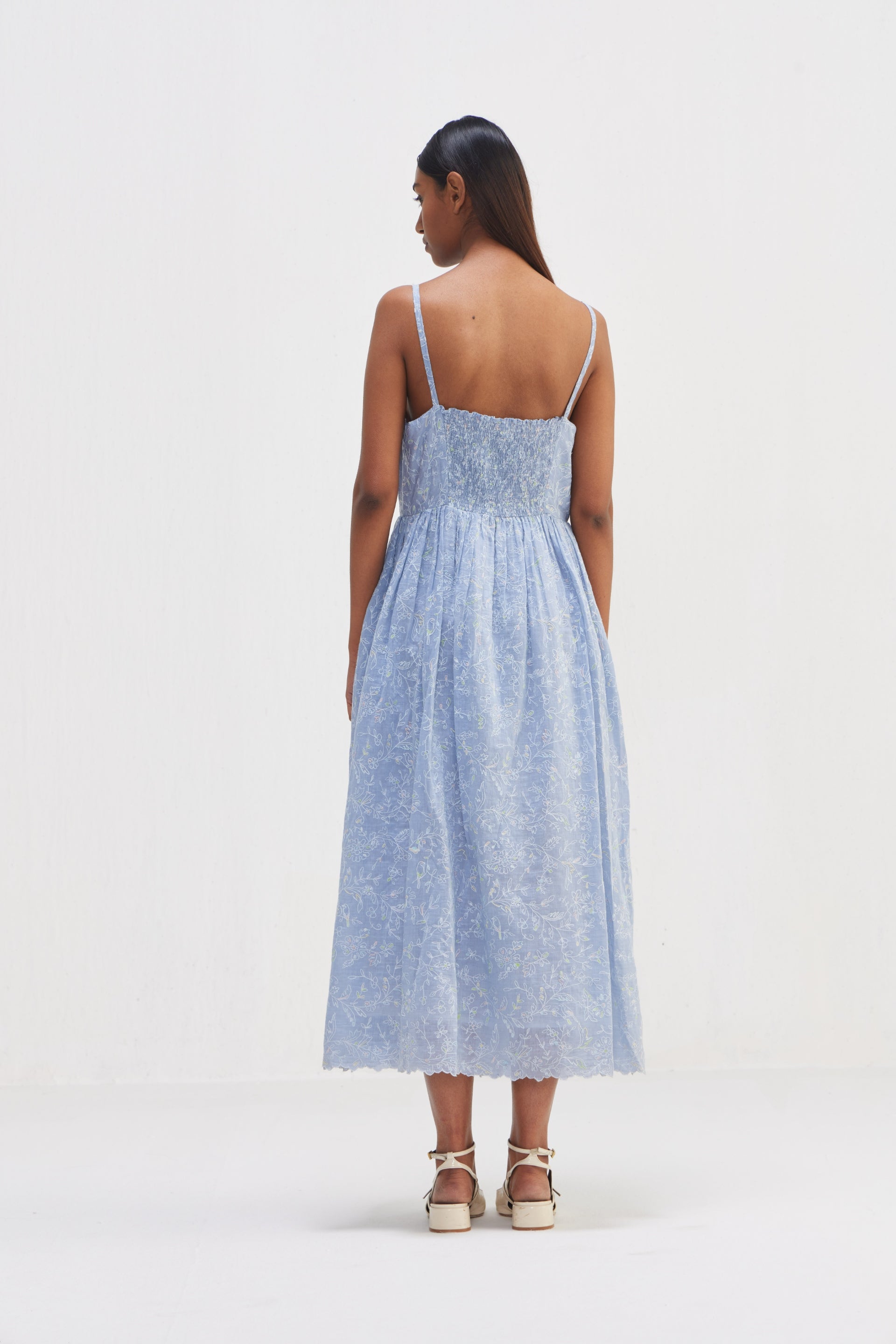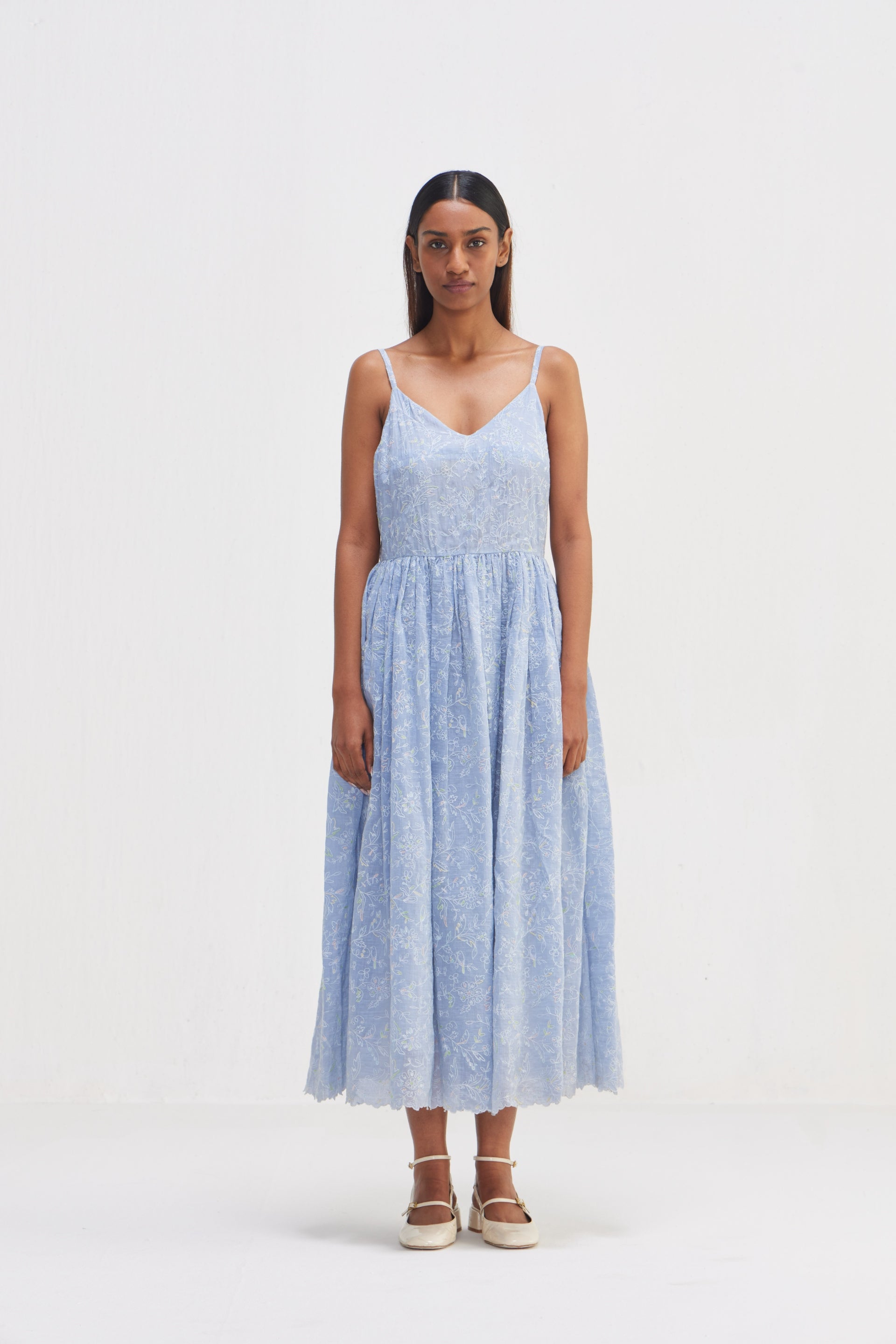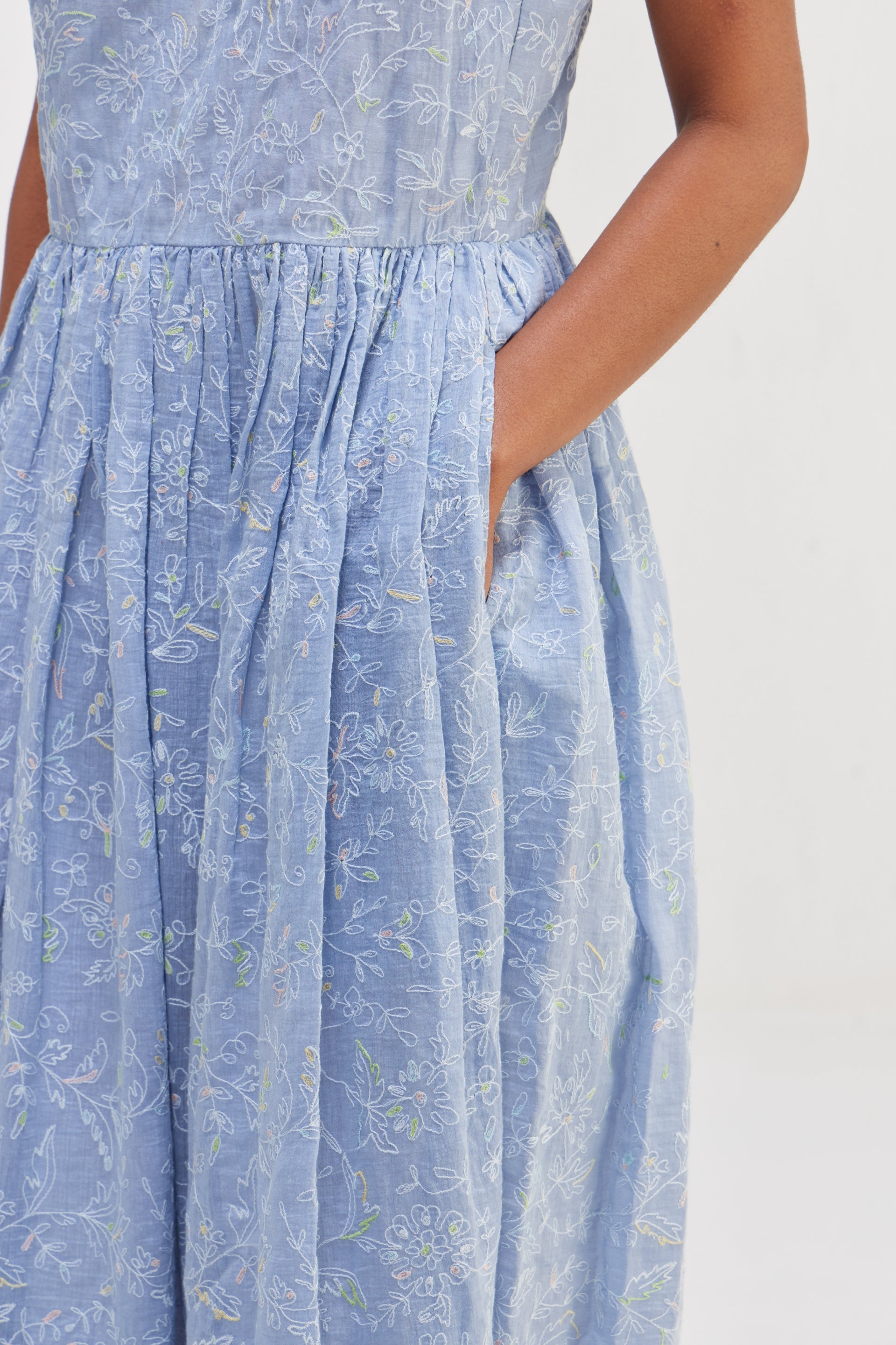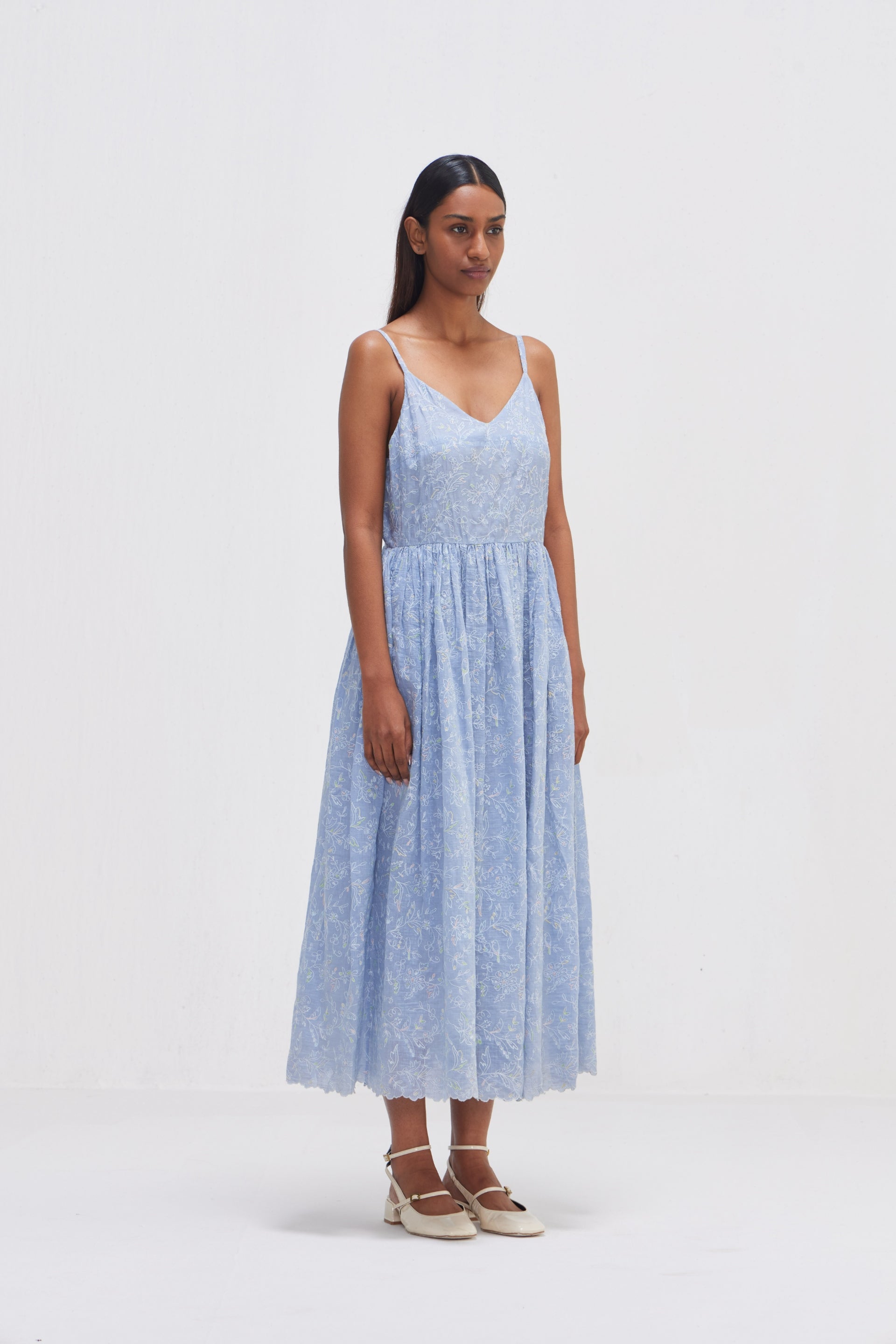Sleeveless spaghetti strap dress with gathers, featuring delicate floral embroidery throughout. This charming dress exudes femininity and elegance.