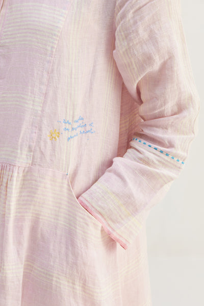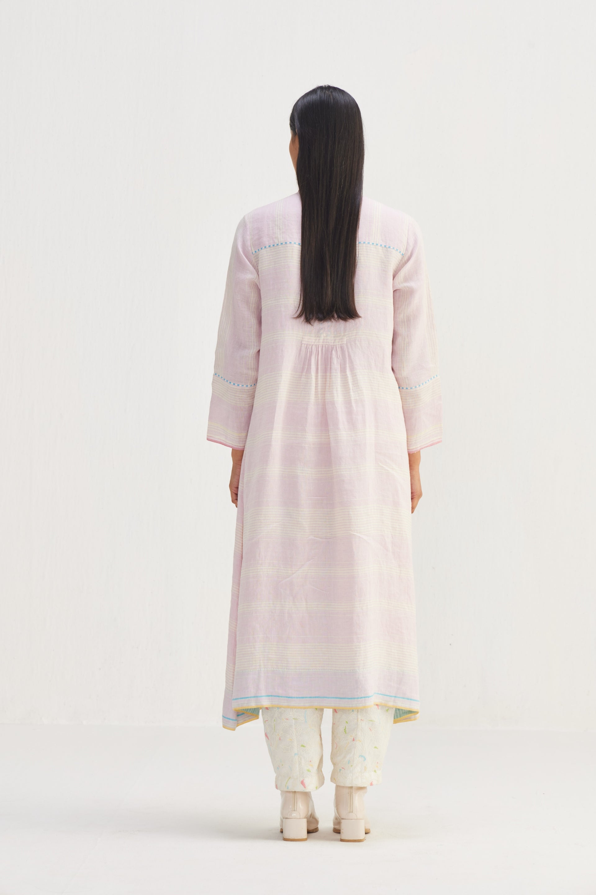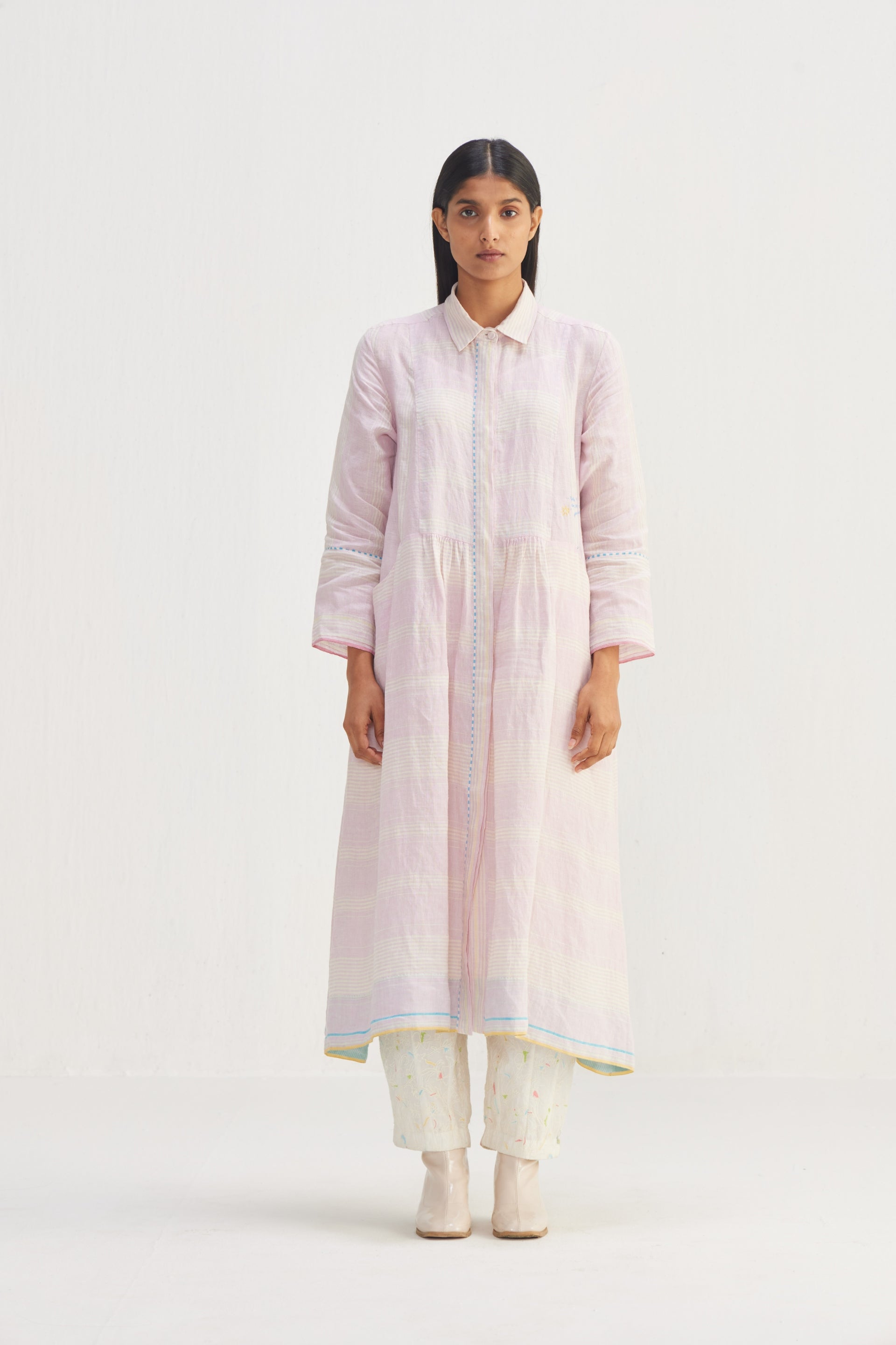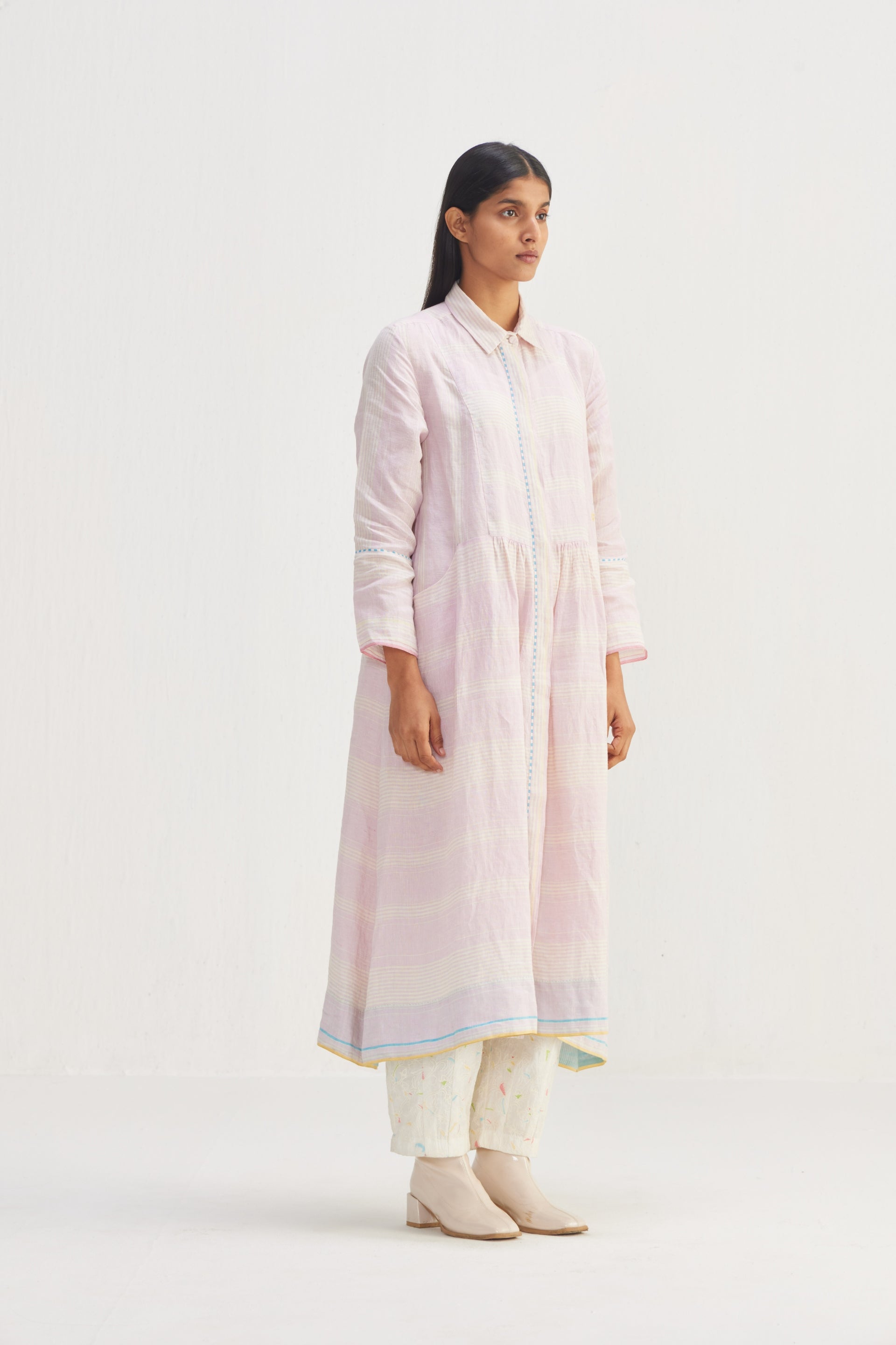 Long button down striper jacket, a timeless essential for your wardrobe. Featuring a classic button-down design with a stylish yoke and contrast selvedge. The piping detail adds a touch of elegance, while the front pocket offers practicality and convenience.