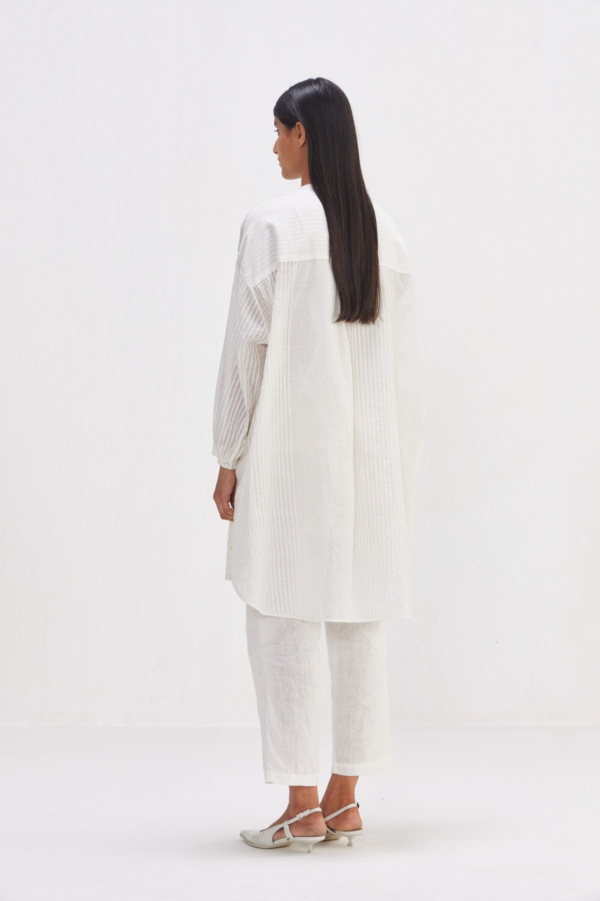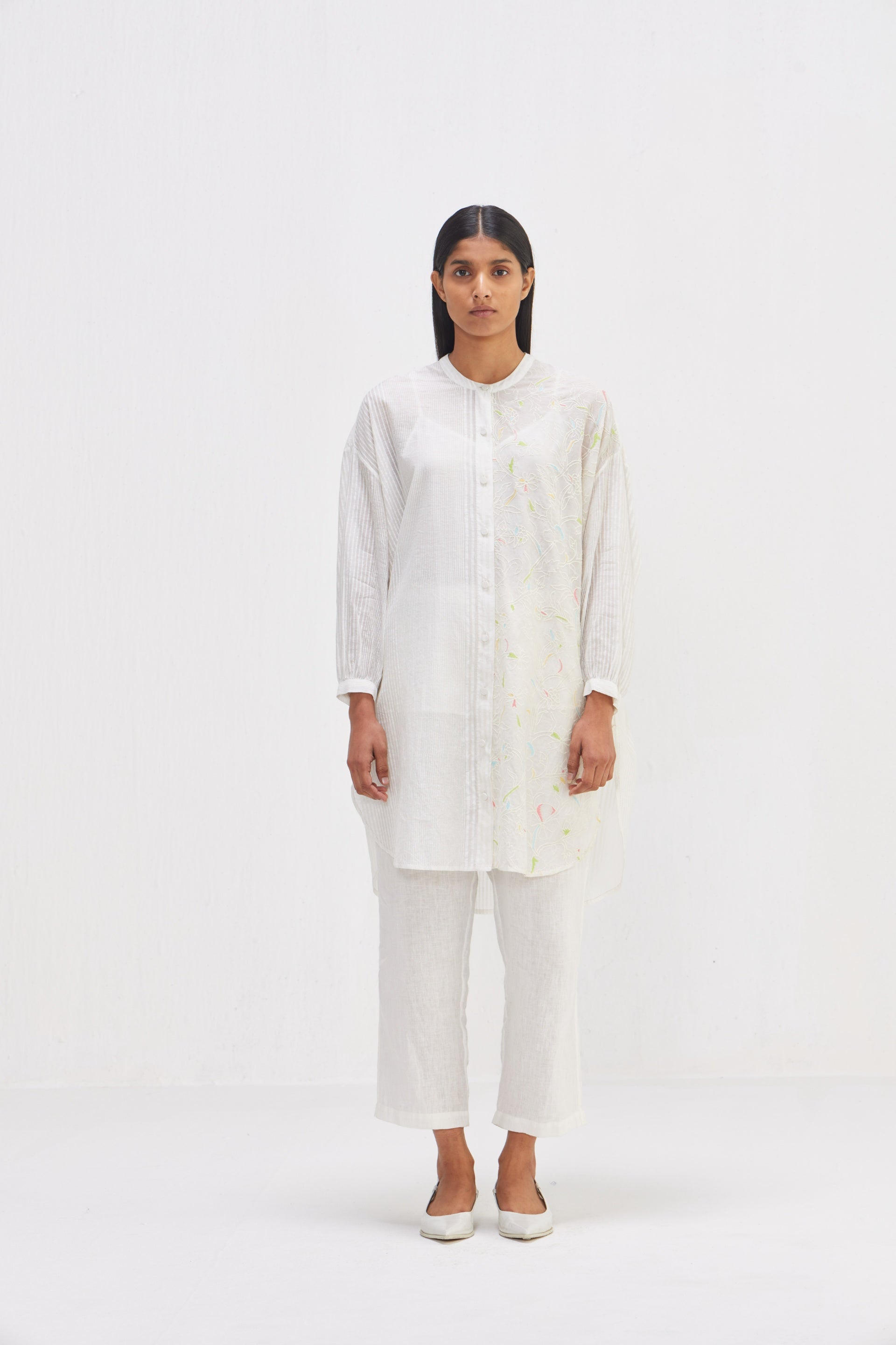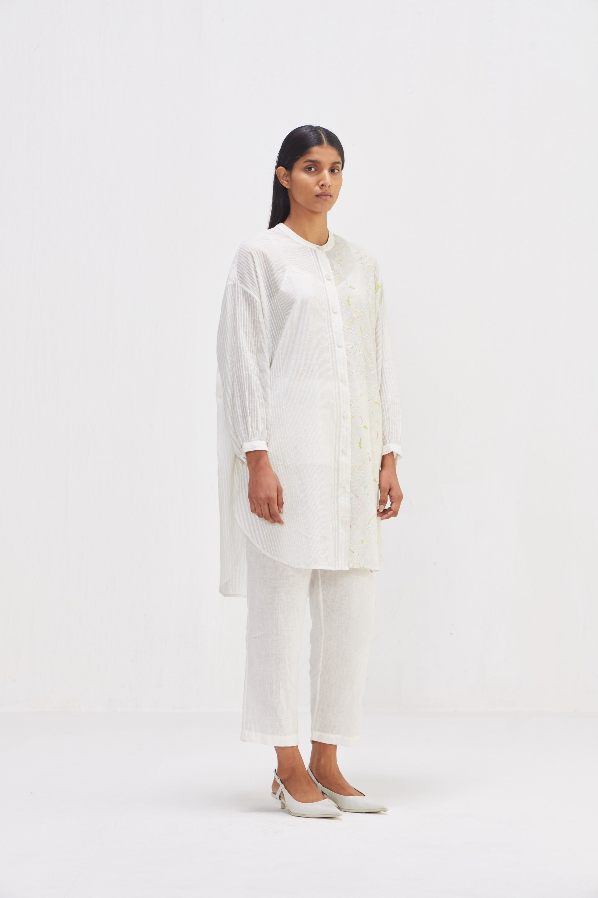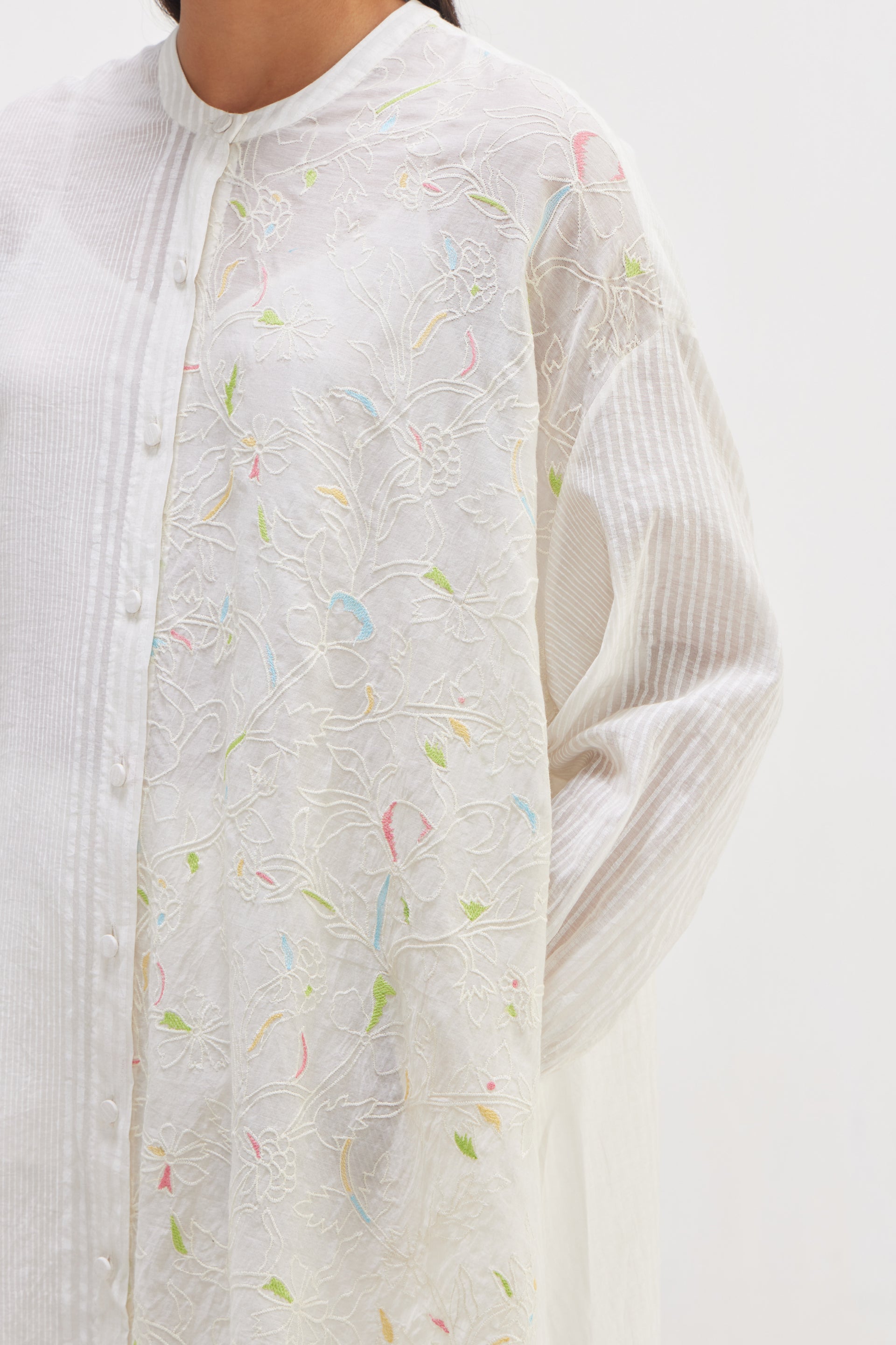 A midi-length front-open striper shirt dress featuring a classic collared neckline and button-down front, the shirt dress is adorned with intricate embroidery, adding a refined touch to its clean lines and hand block printed on one side. It can be wore as a dress or a shirt with multi purpose styling.