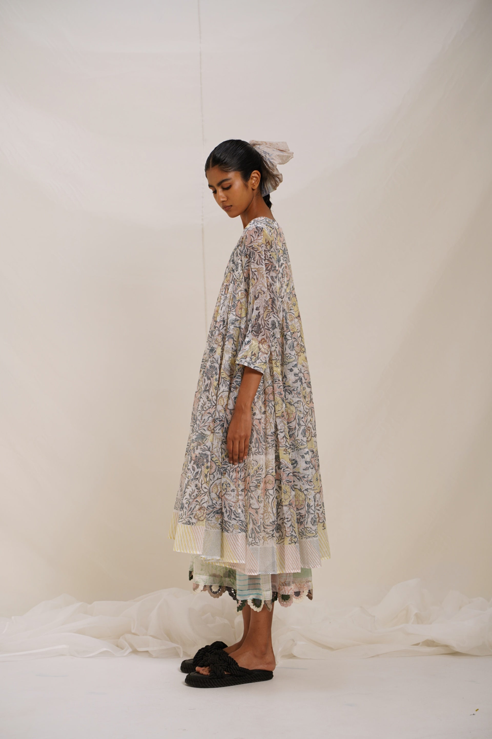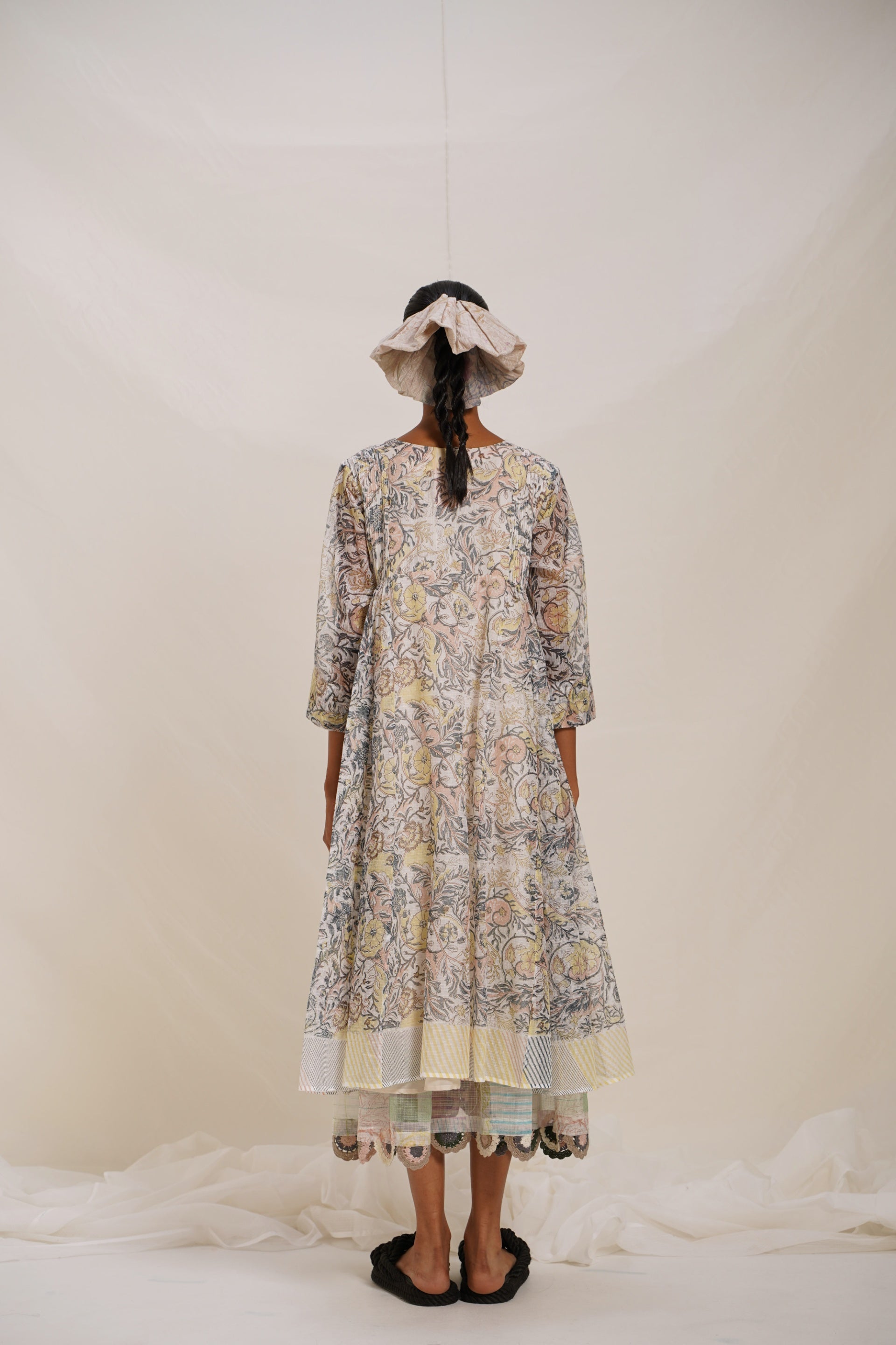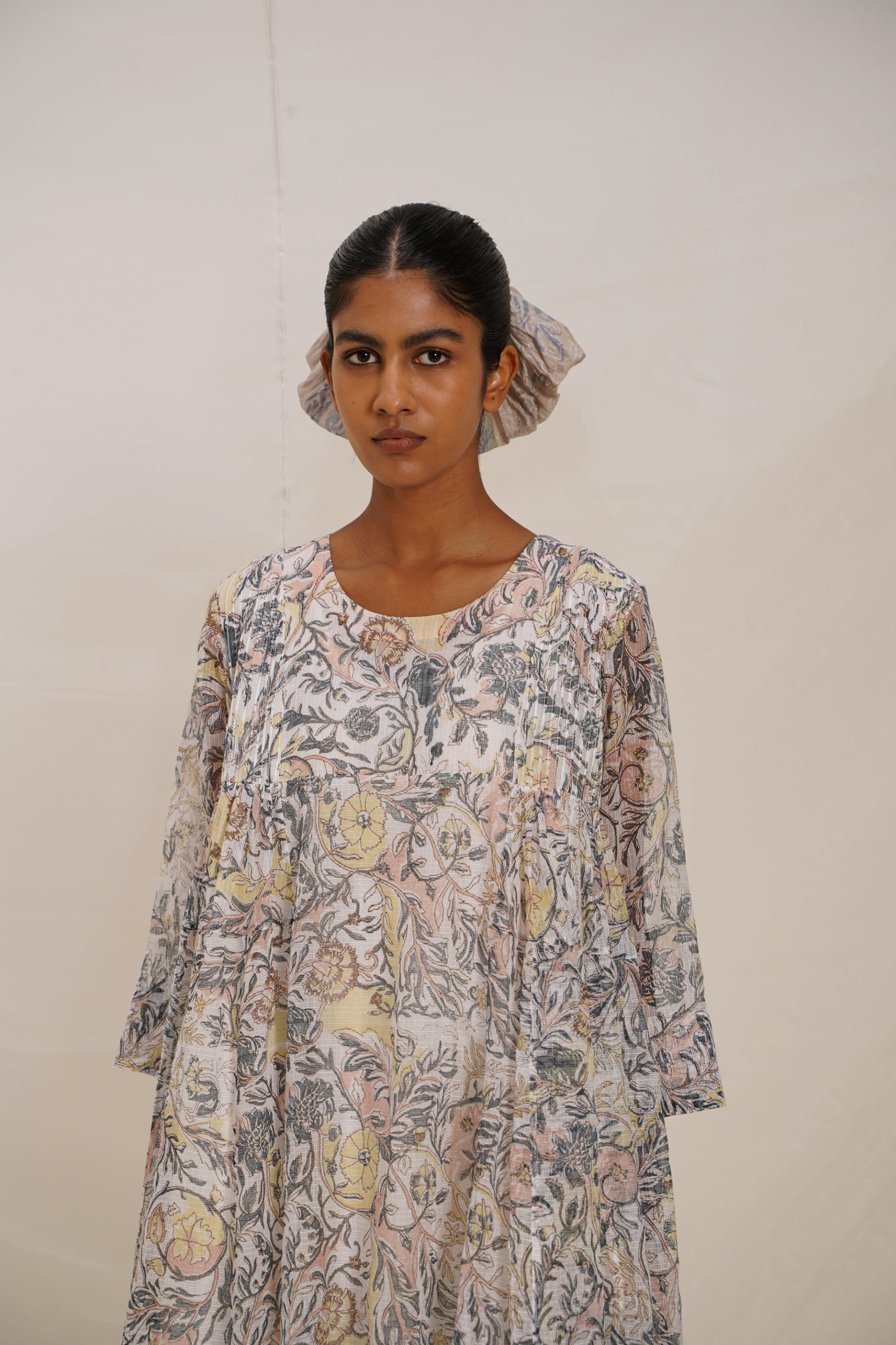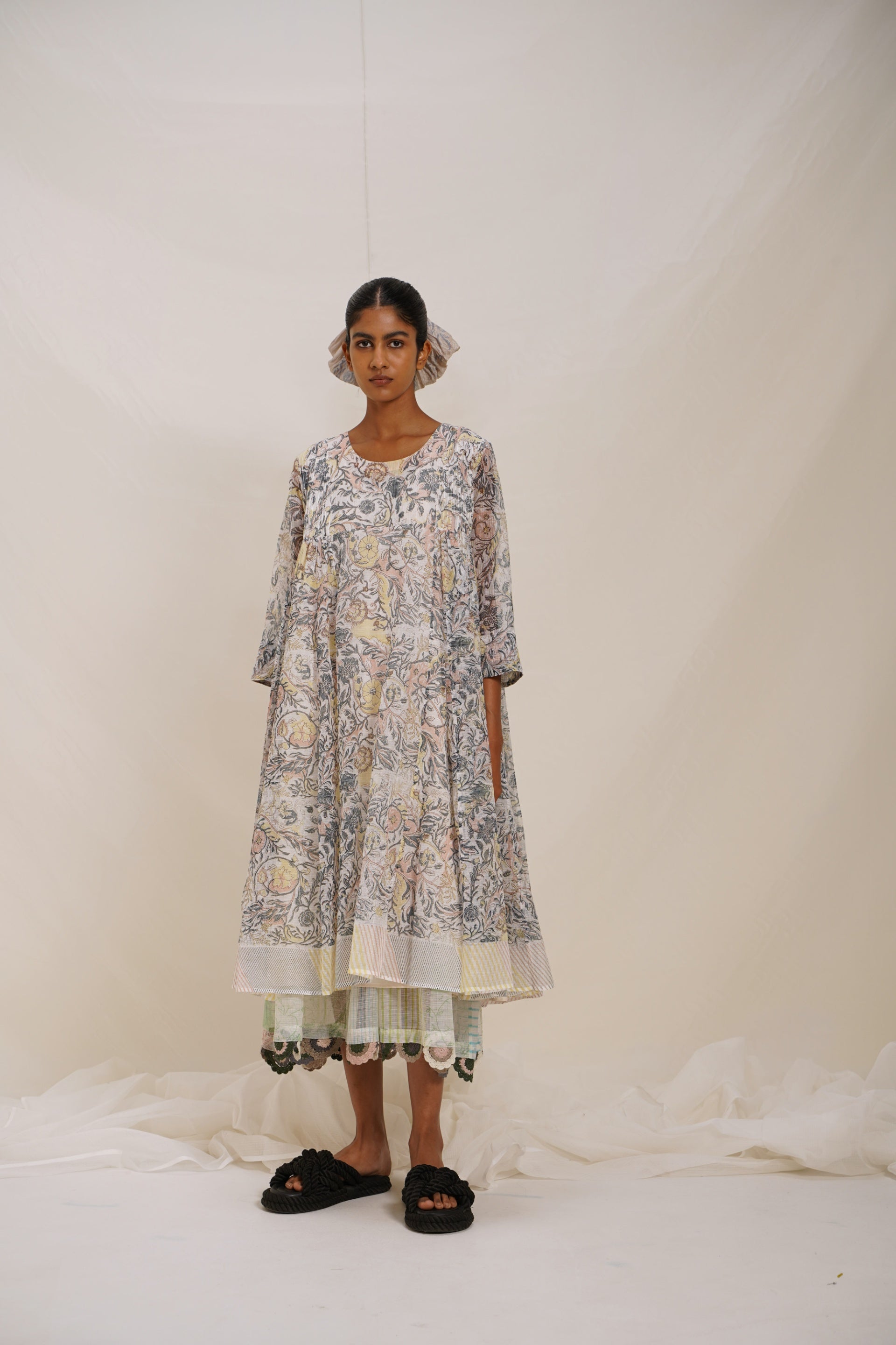 Traditional craftsmanship with this paneled midi dress, featuring an all-over hand block floral print and the airy charm of hand-woven kota doriya fabric. The print features delicate floral motifs, each carefully placed to create a harmonious pattern that flows beautifully across the dress with 12 blocks on top and 16 blocks on bottom. A princess seam and subtle pin tucks on the sides, enhancing the silhouette and providing a comfortable fit. Comes with an attached printed text lining.