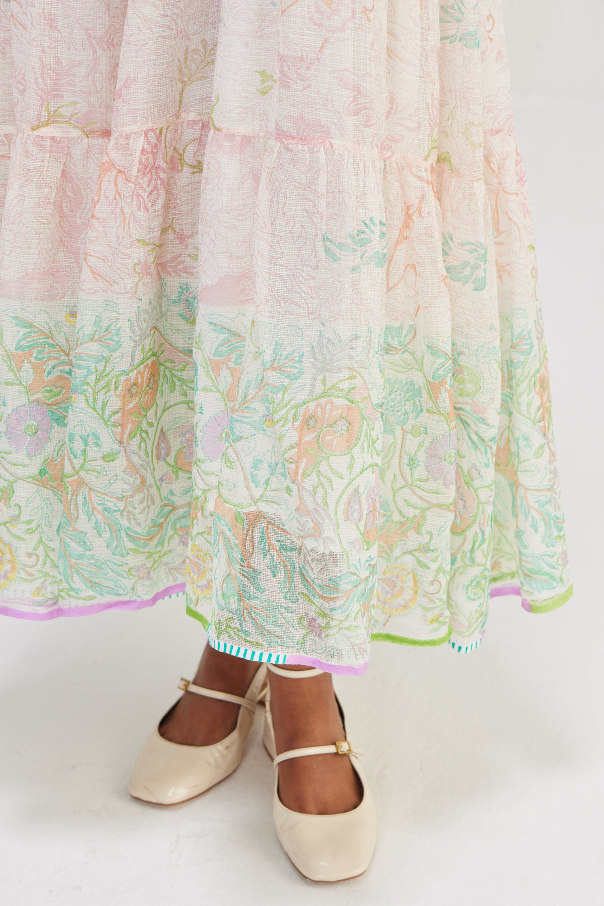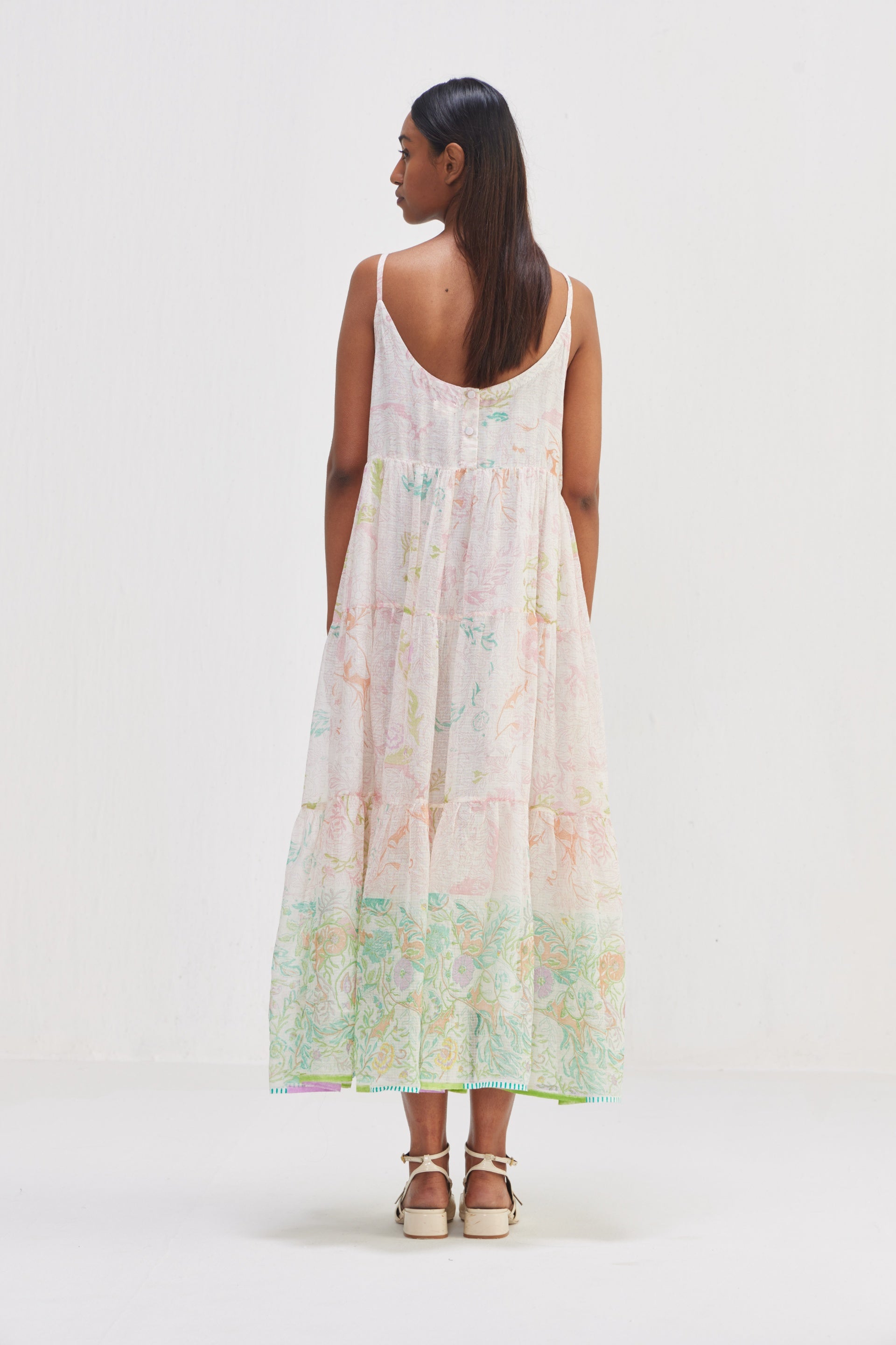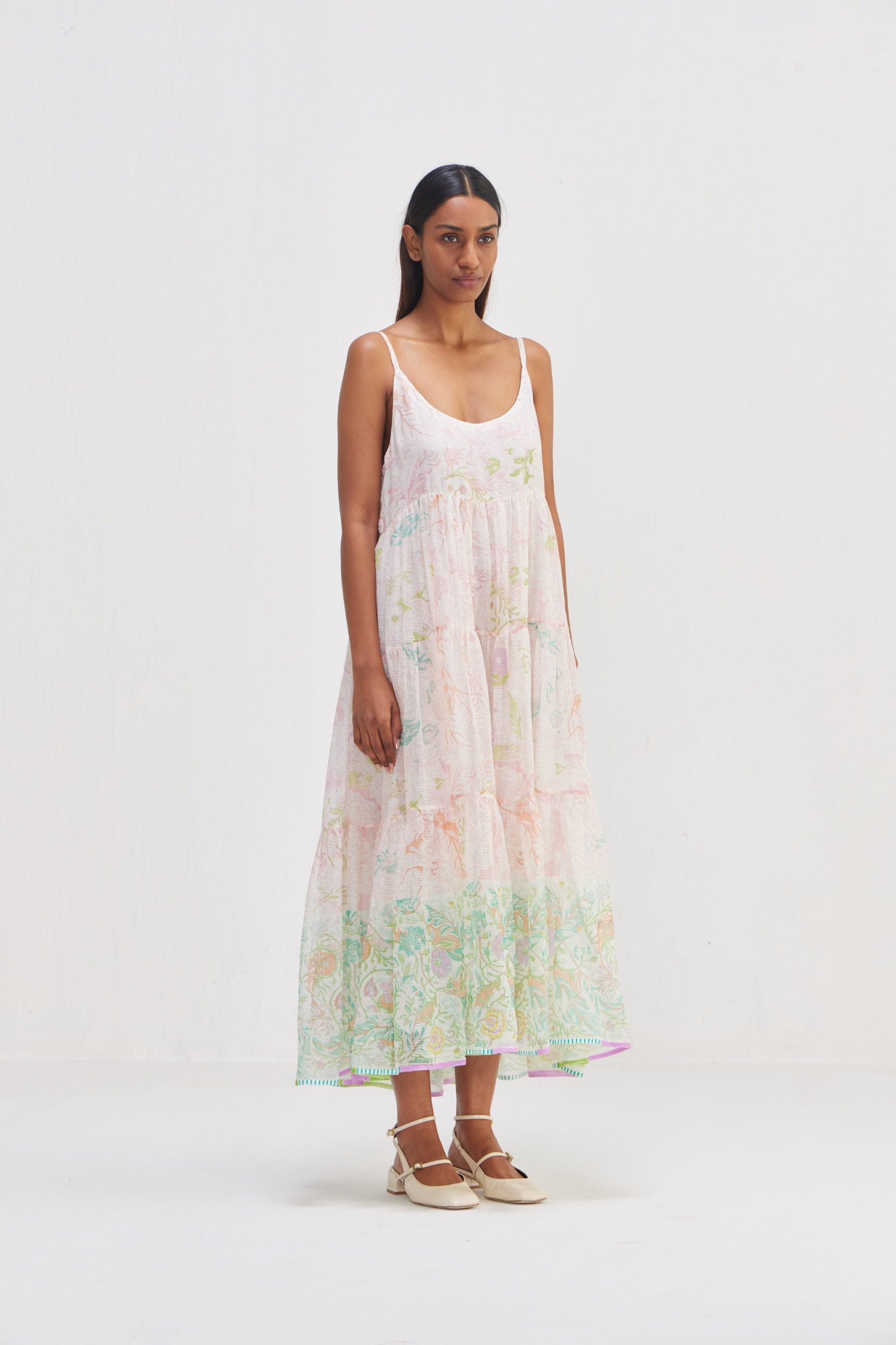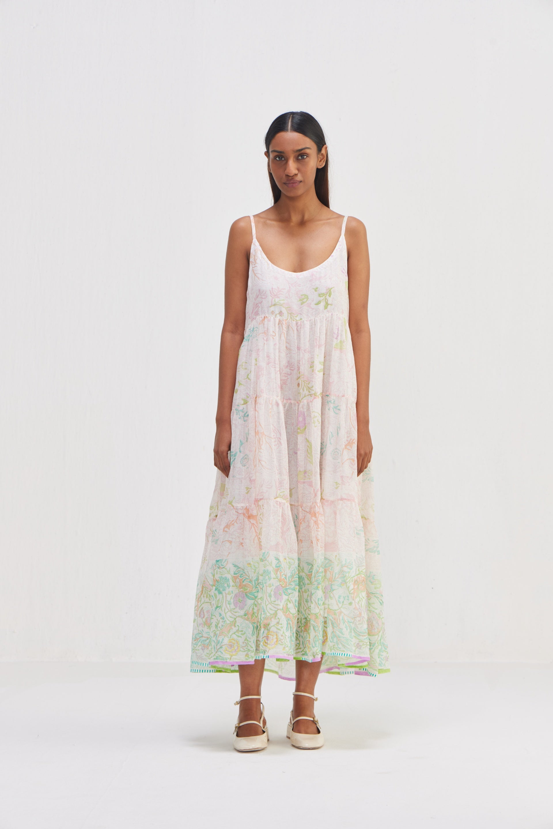 Sleeveless spagetti strap dress in hand block floral print and contrasting border design