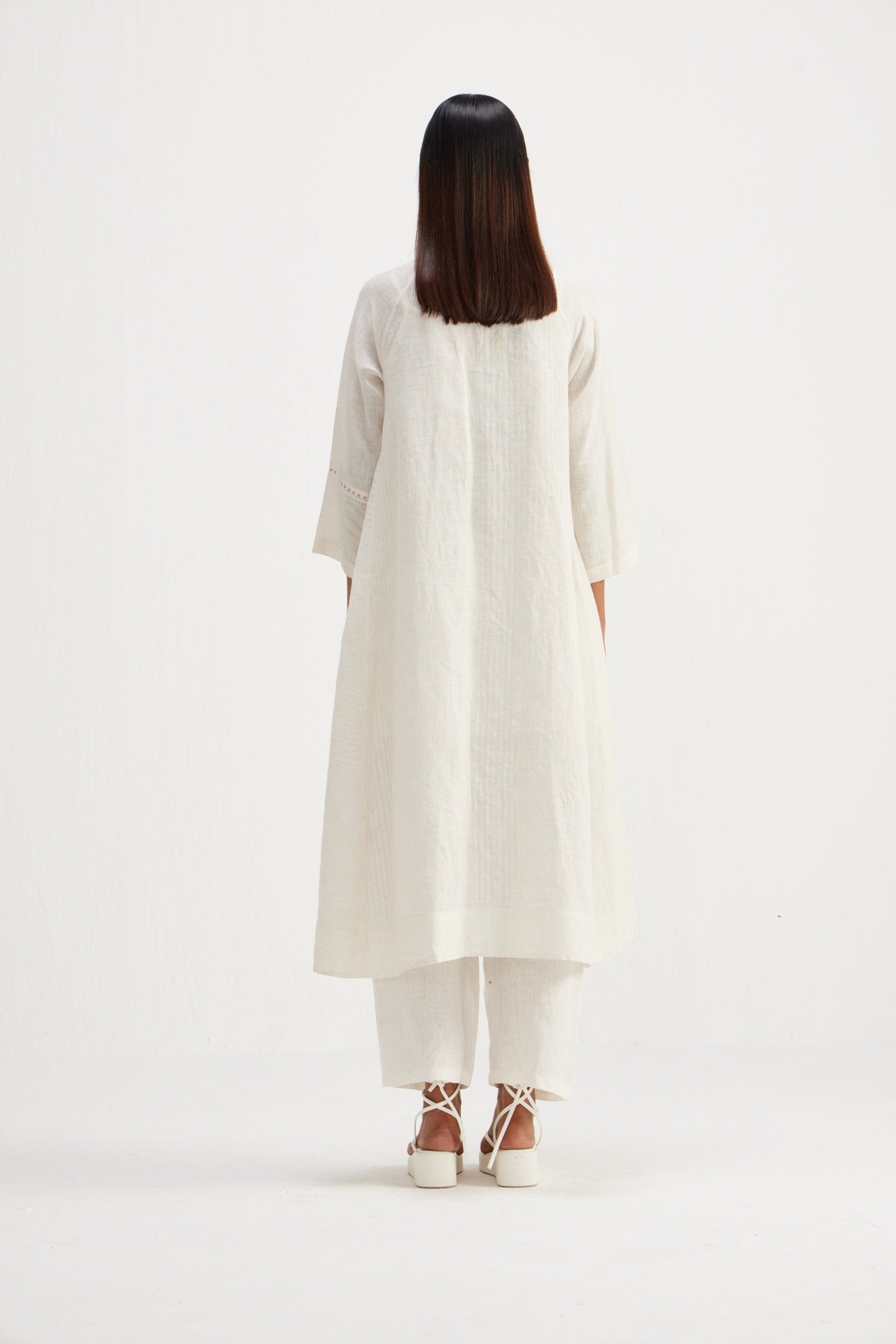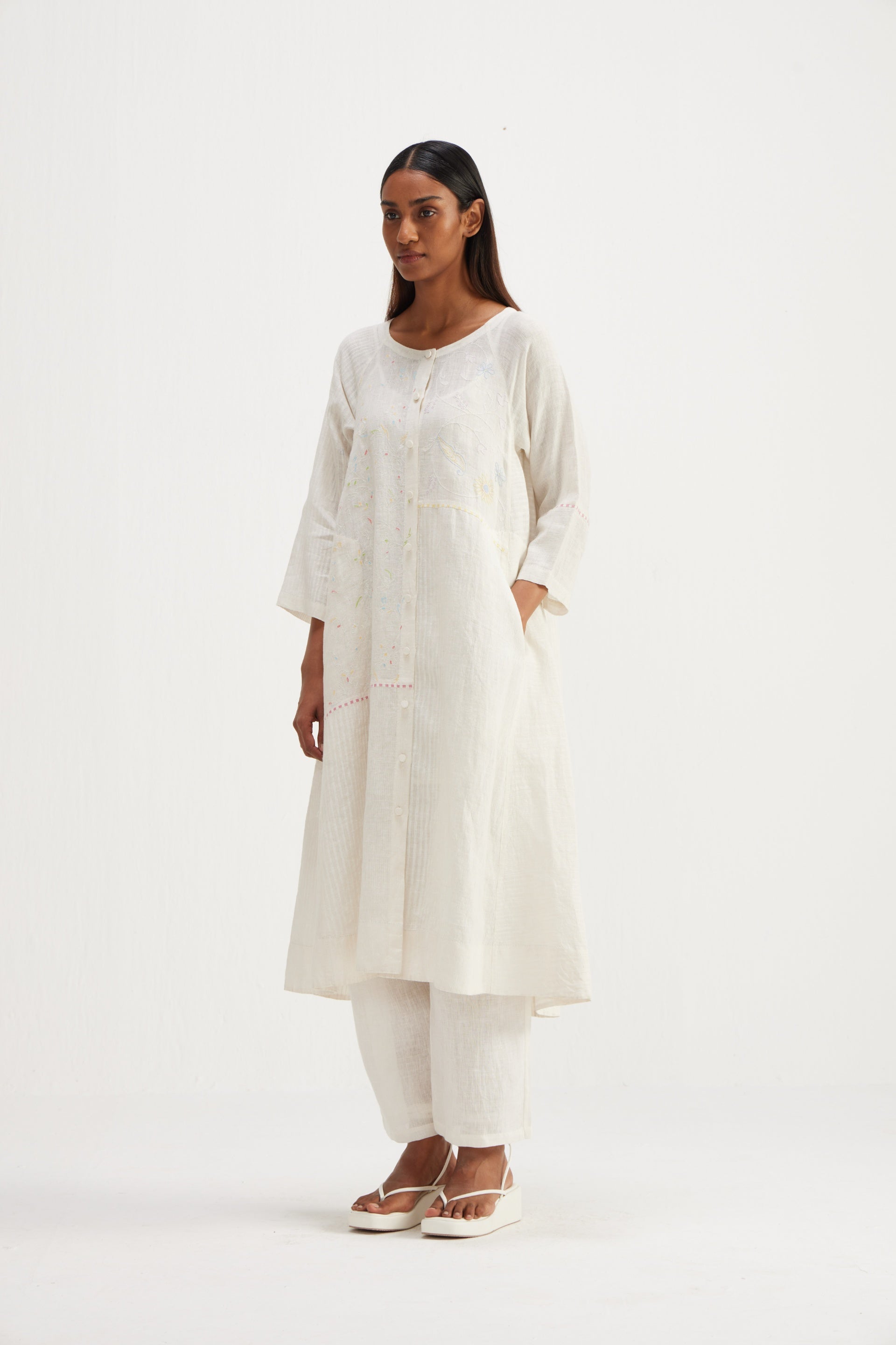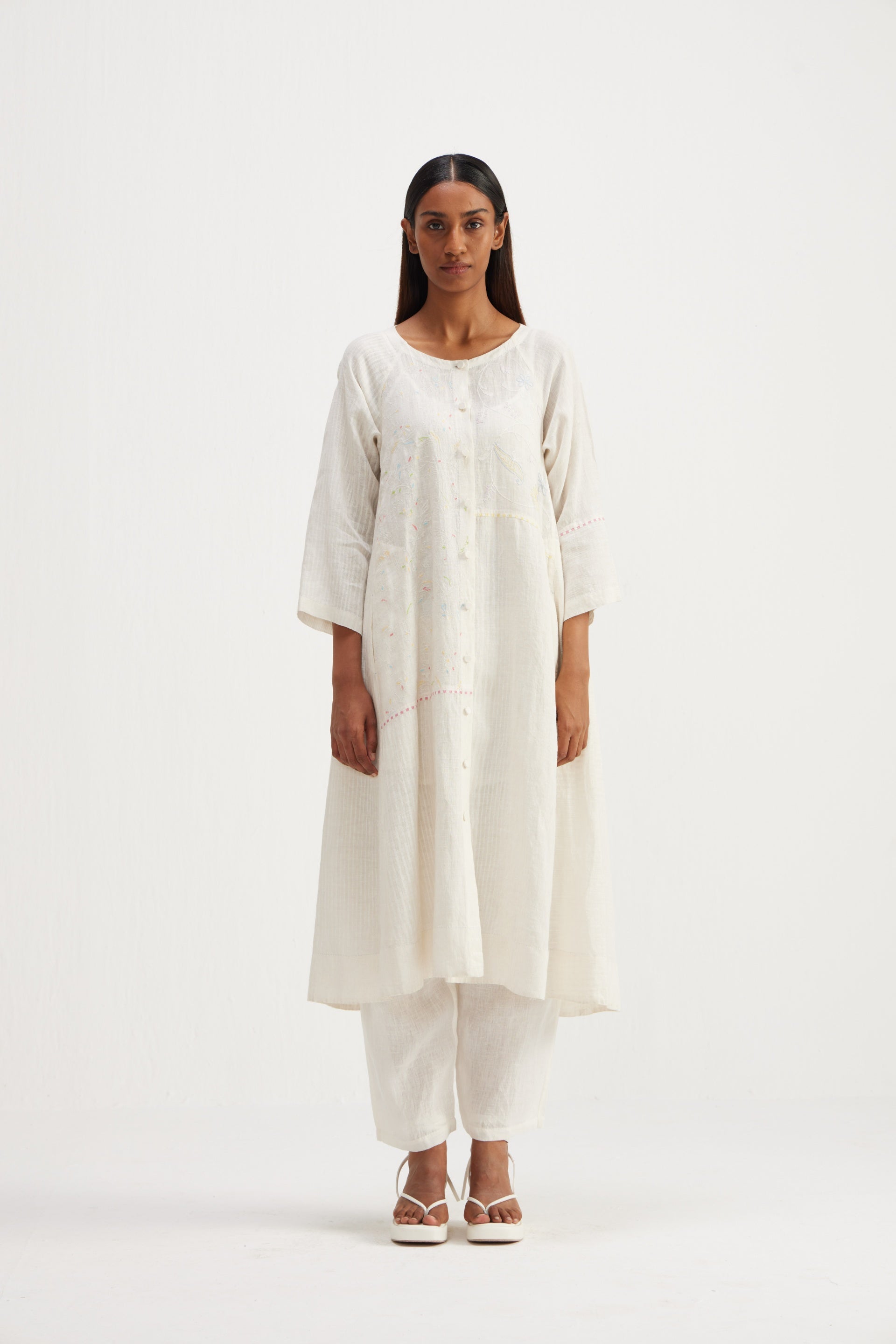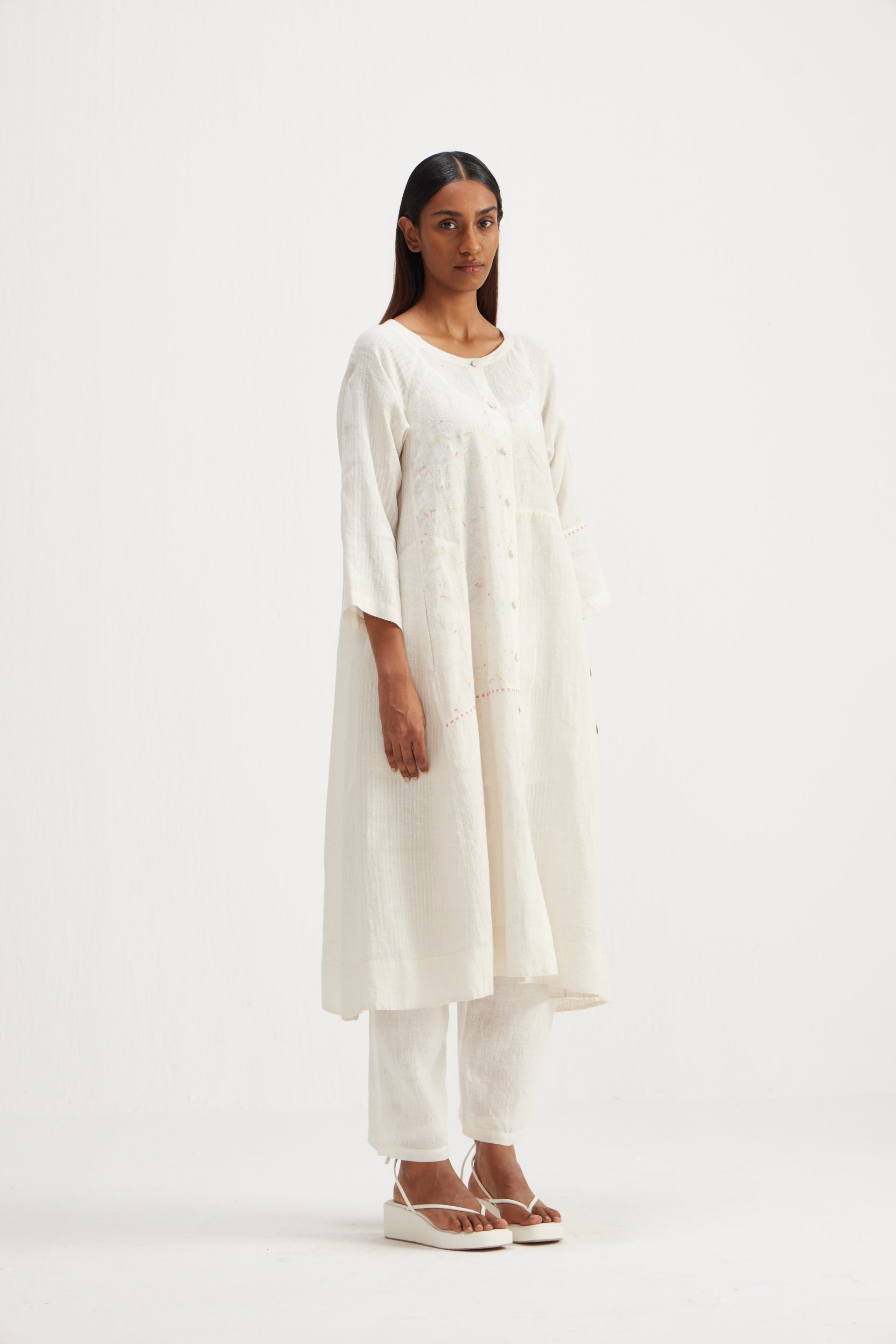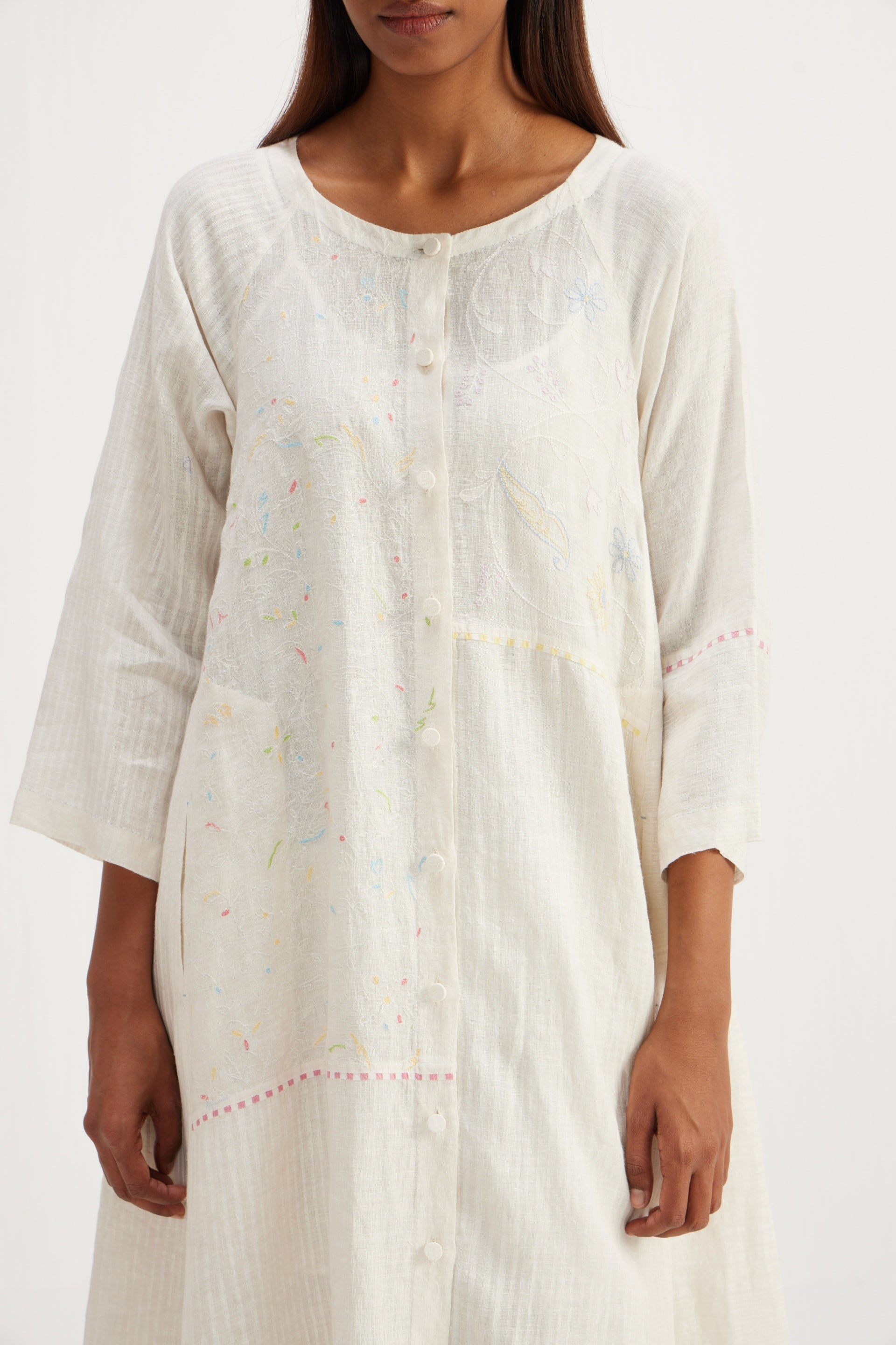 Long front open patchwork jacket with embroidery detailing and hand block printed stripes.