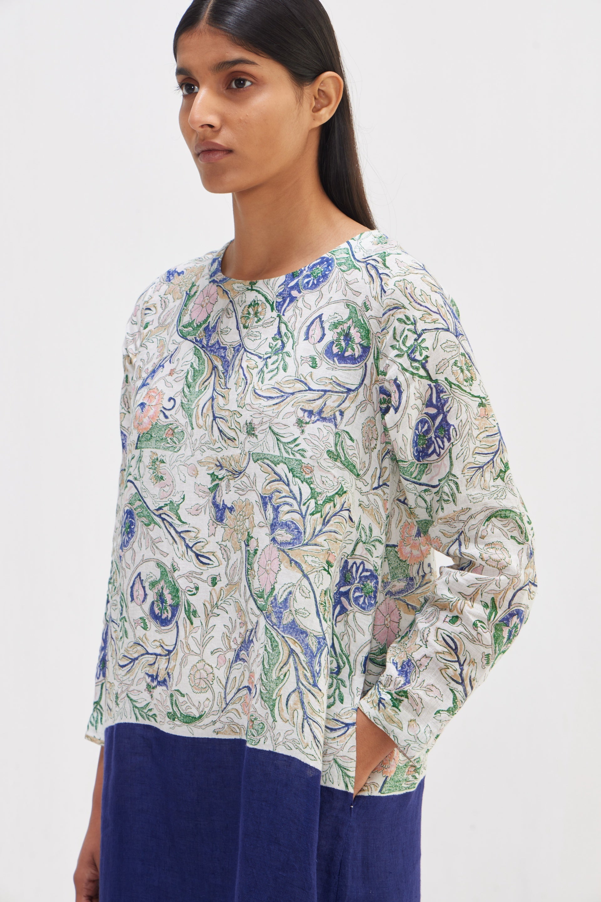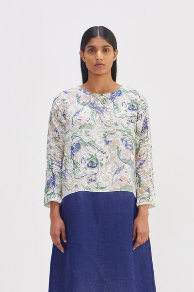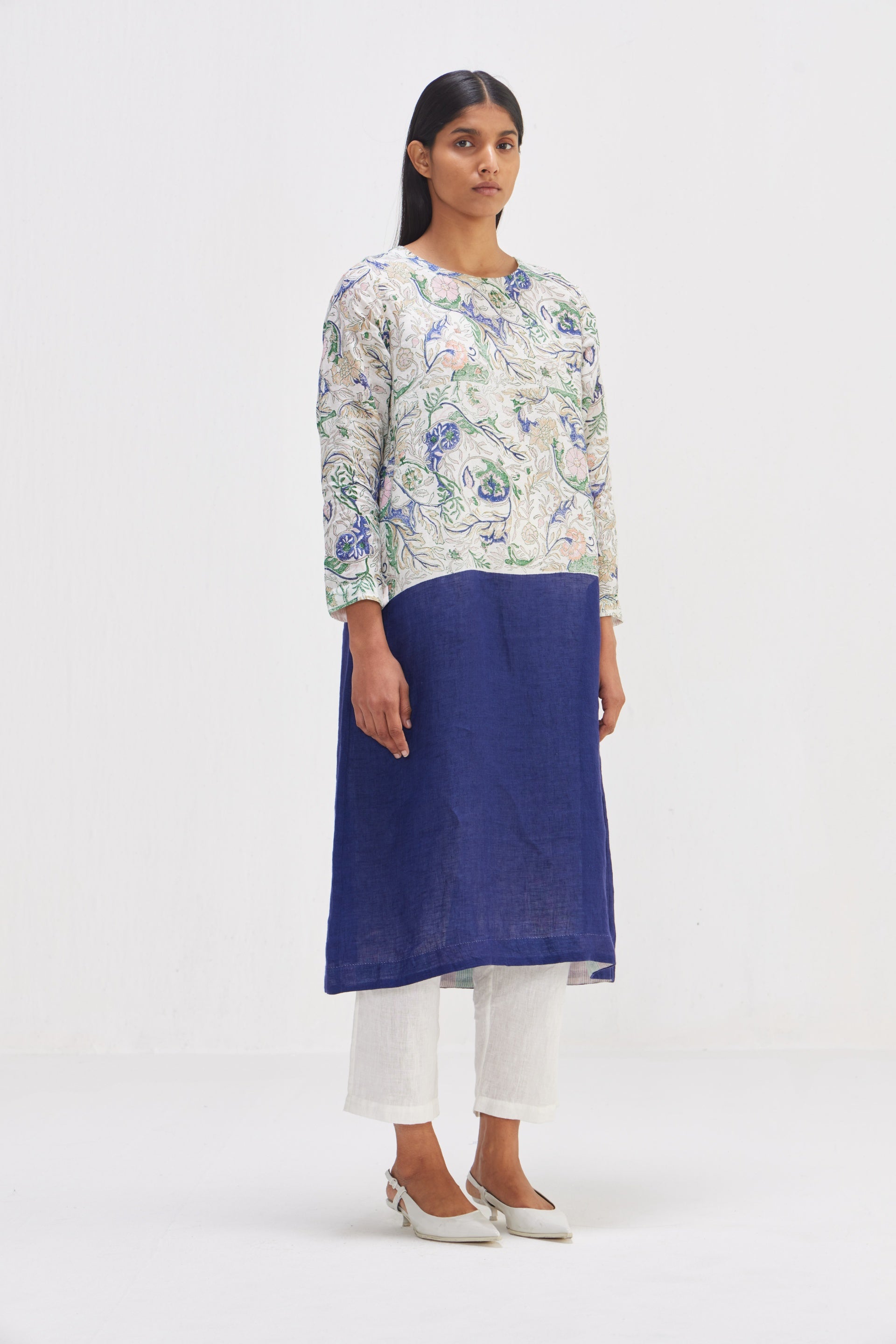 Kurta dress in half hand block floral print and half solid design. Comes with trouser.