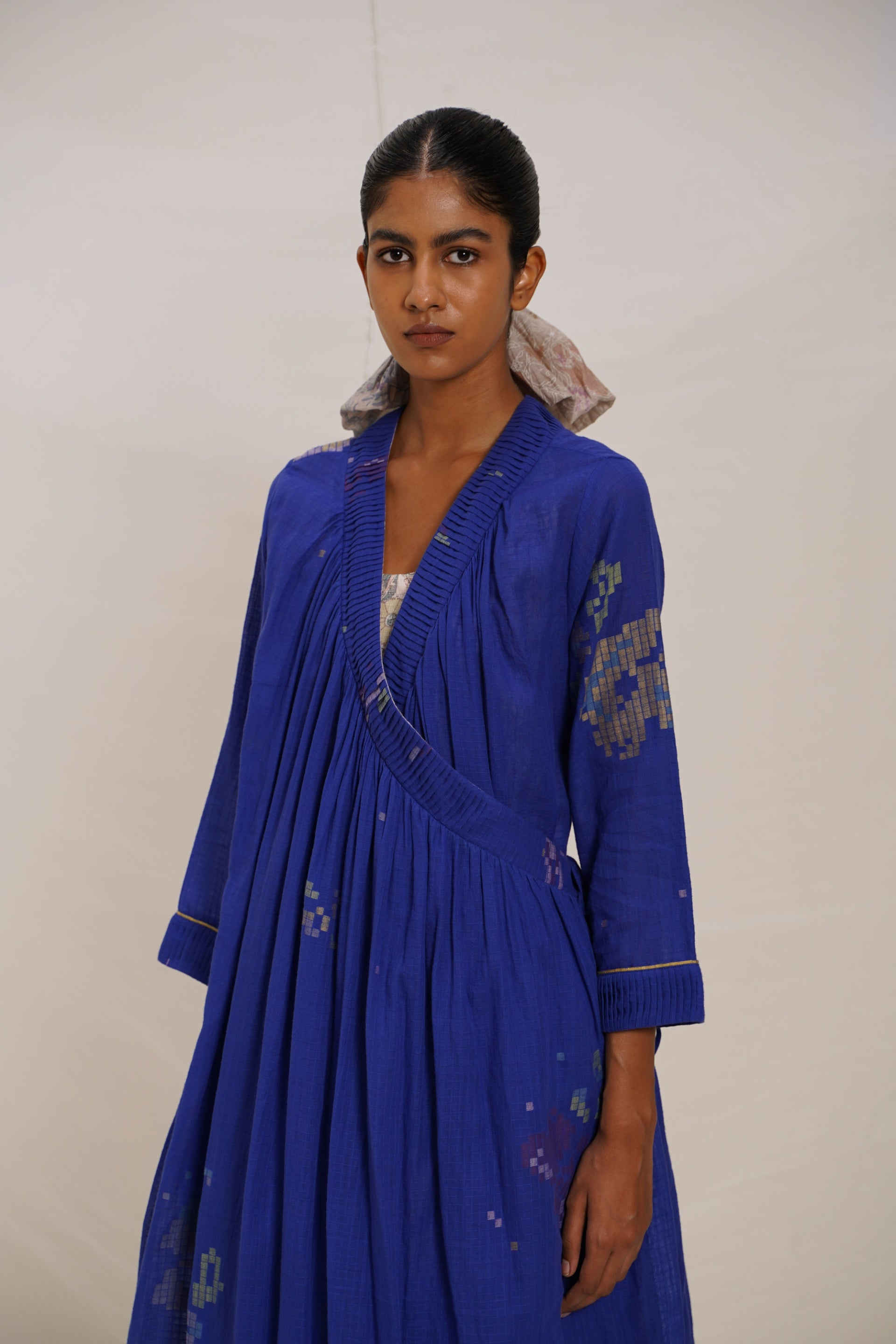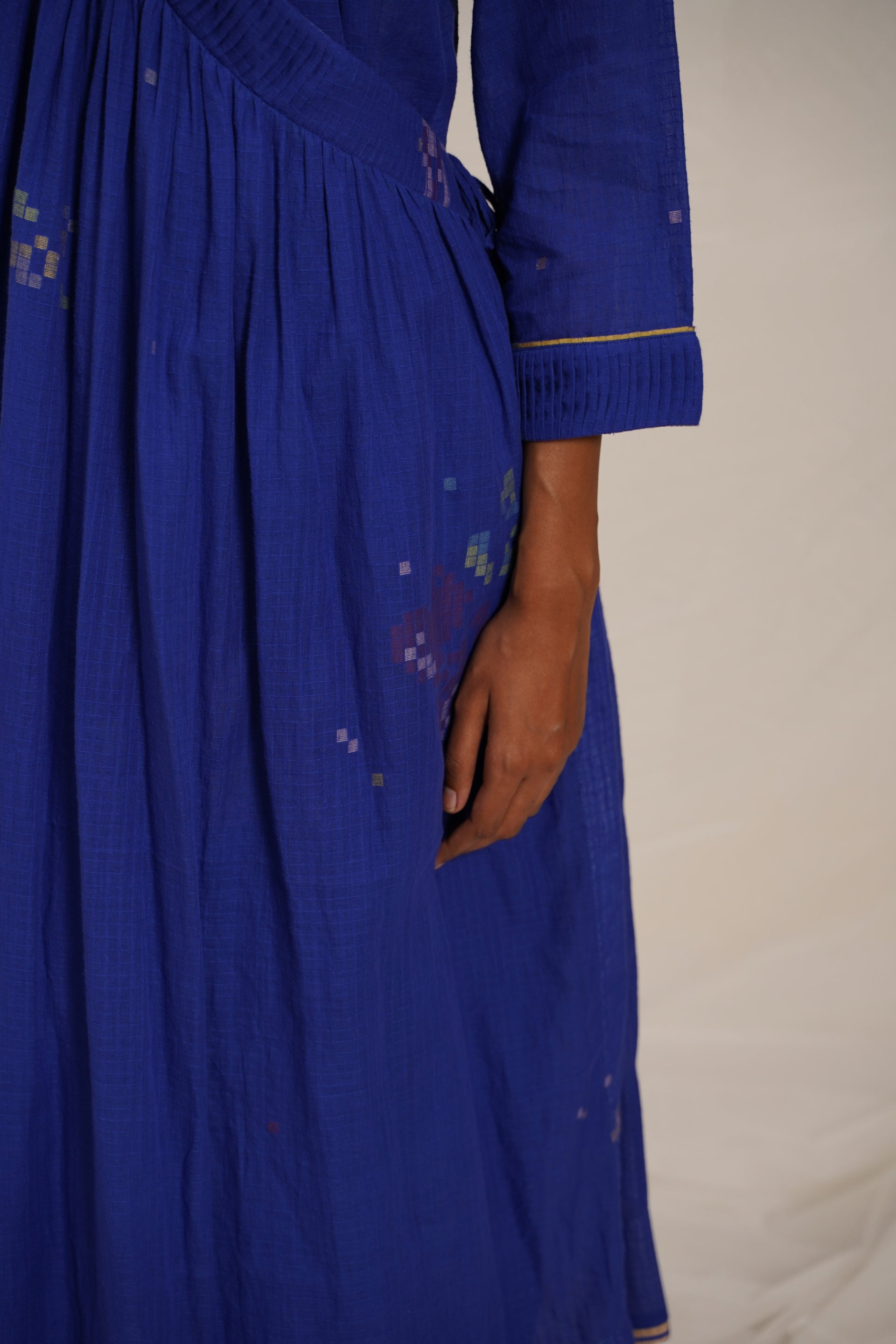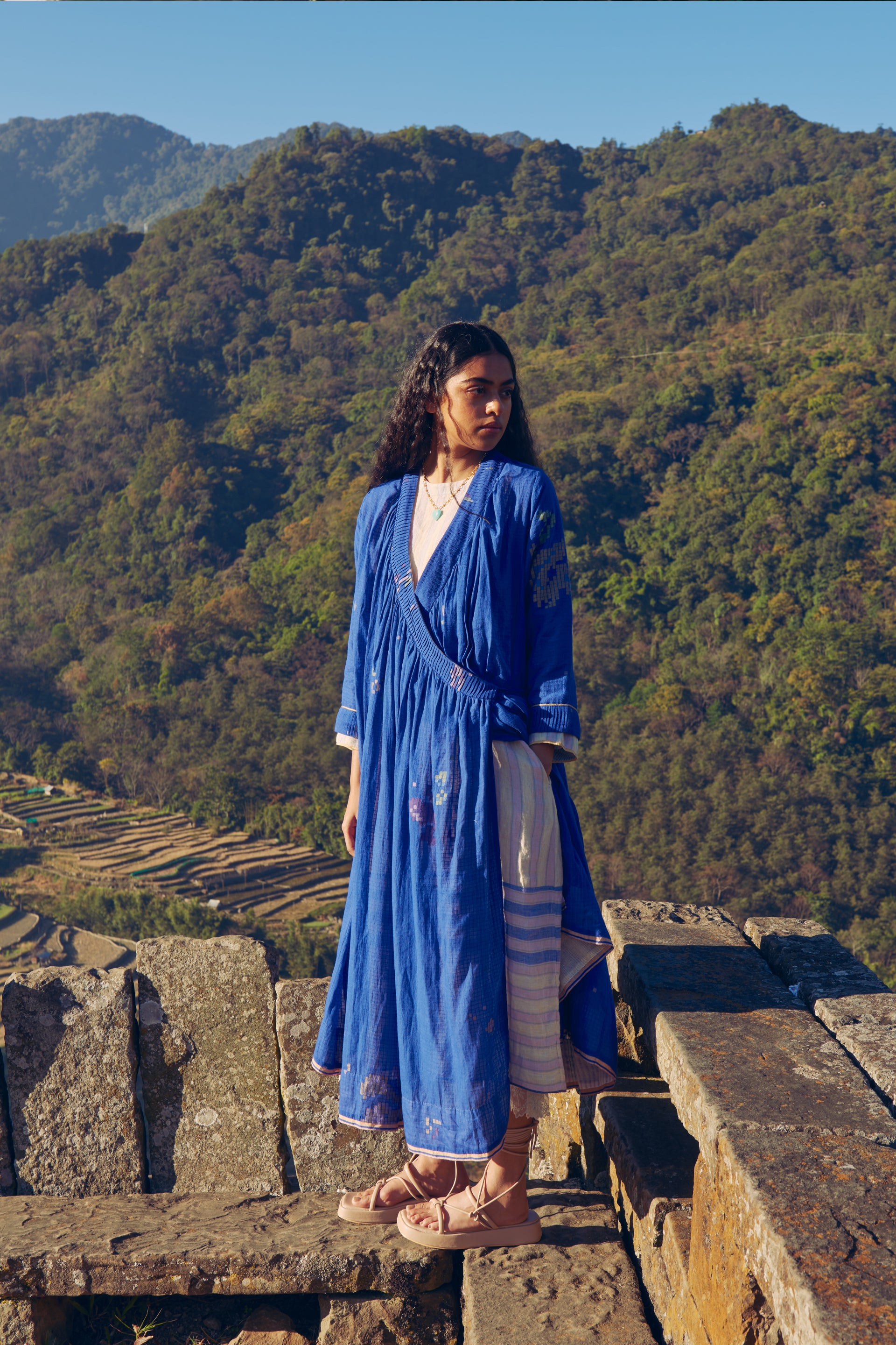 Wrap dress with tie ups and contrasting selvedge detail. Comes with a seperate hand block printed lining with crochet trim