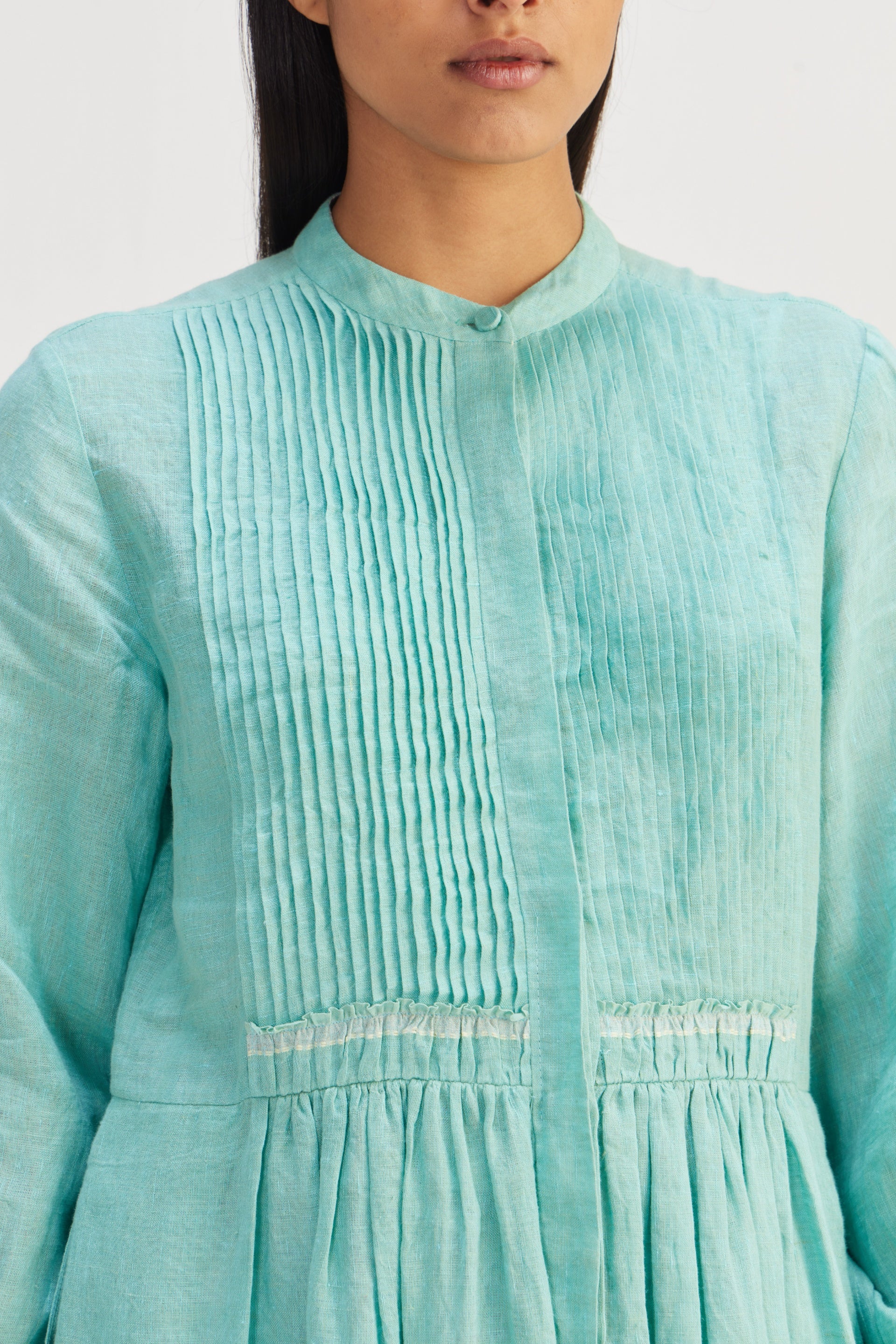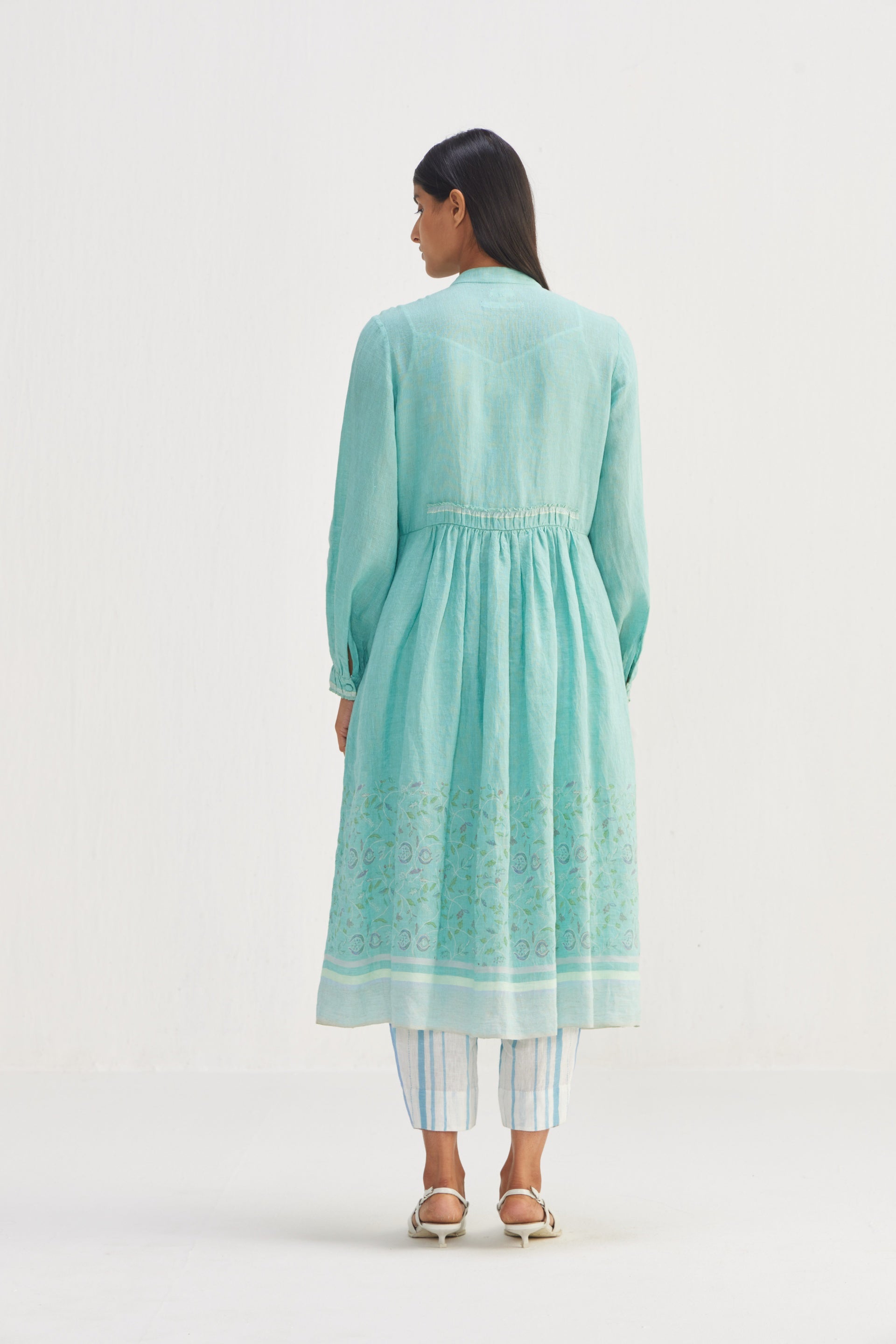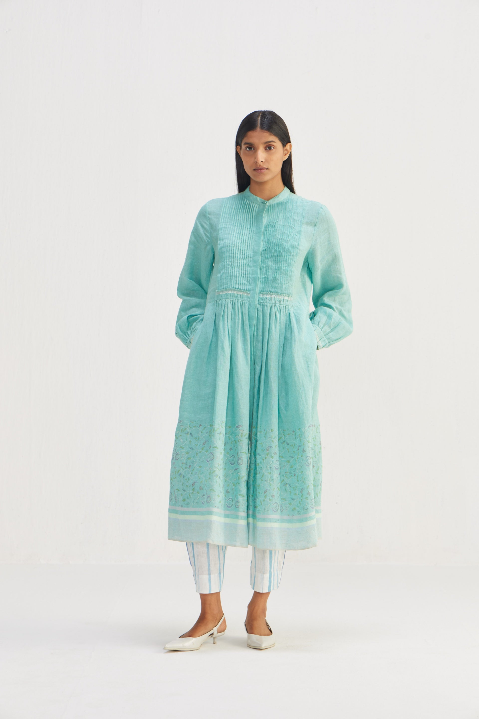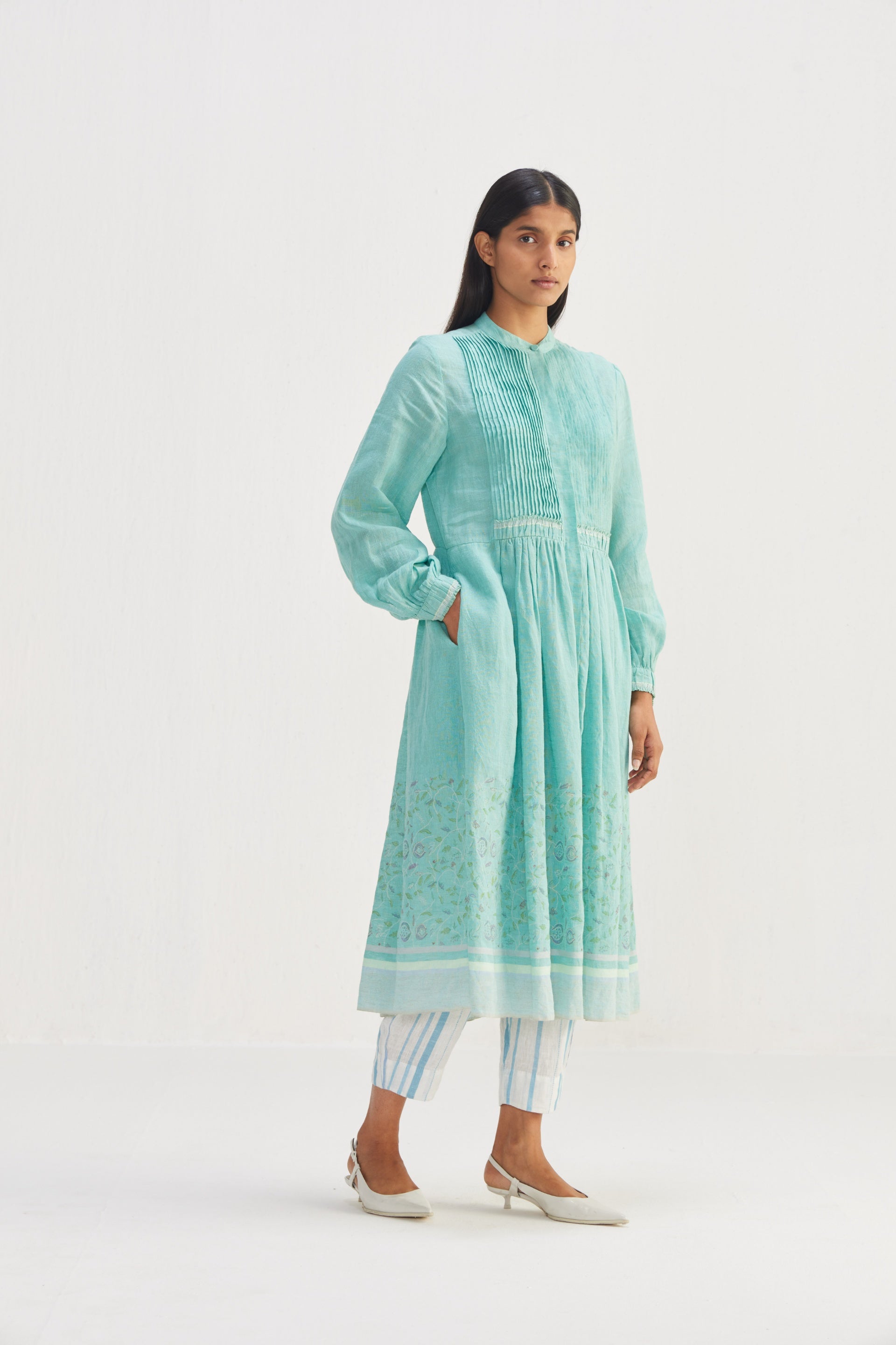 Front open, midi dress with pin tucks in border hand block floral bird print.